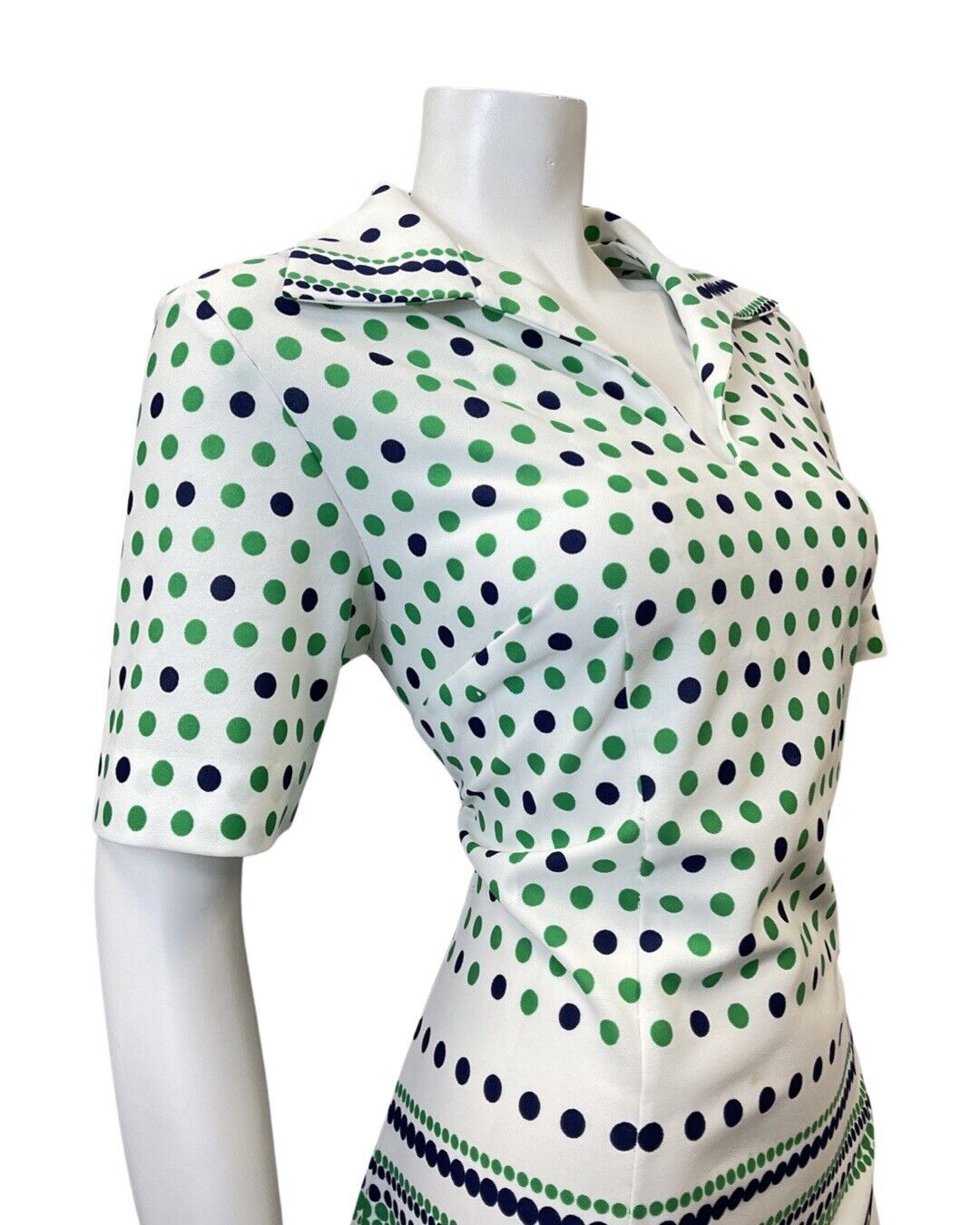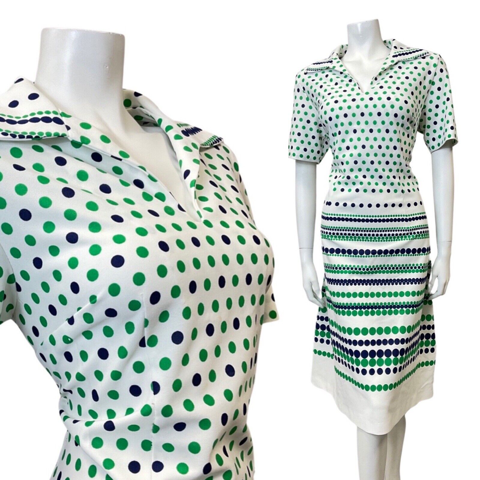 VINTAGE 60s 70s WHITE GREEN BLUE POLKA-DOT STRIPED MOD SHIRT DRESS 14 16