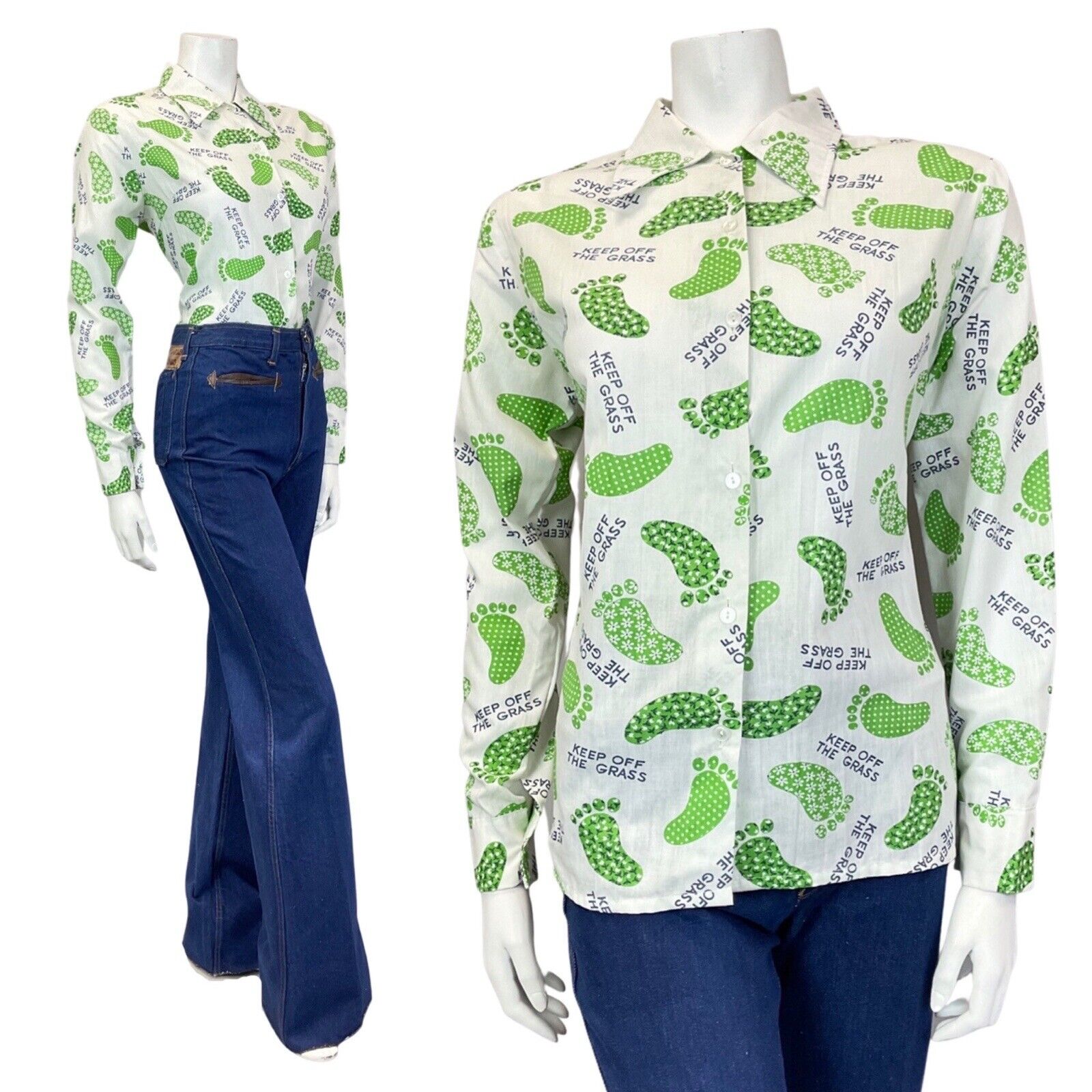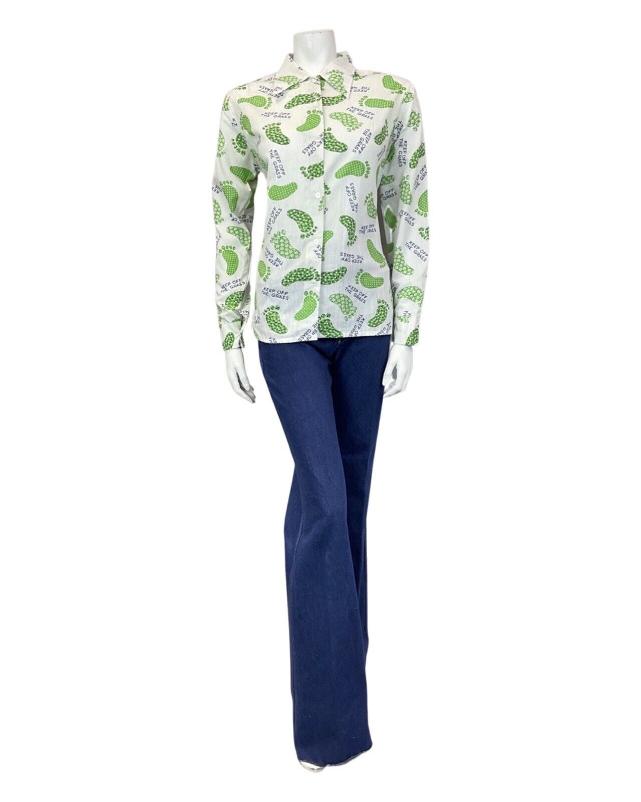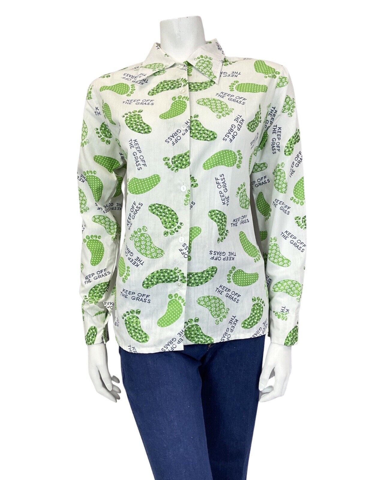VINTAGE 60s 70s WHITE GREEN FOOTPRINT KEEP OFF THE GRASS MOD DAGGER SHIRT 14 16