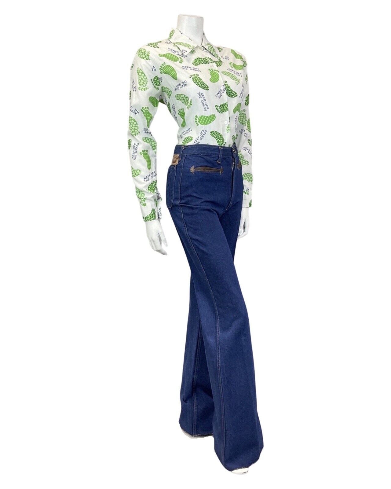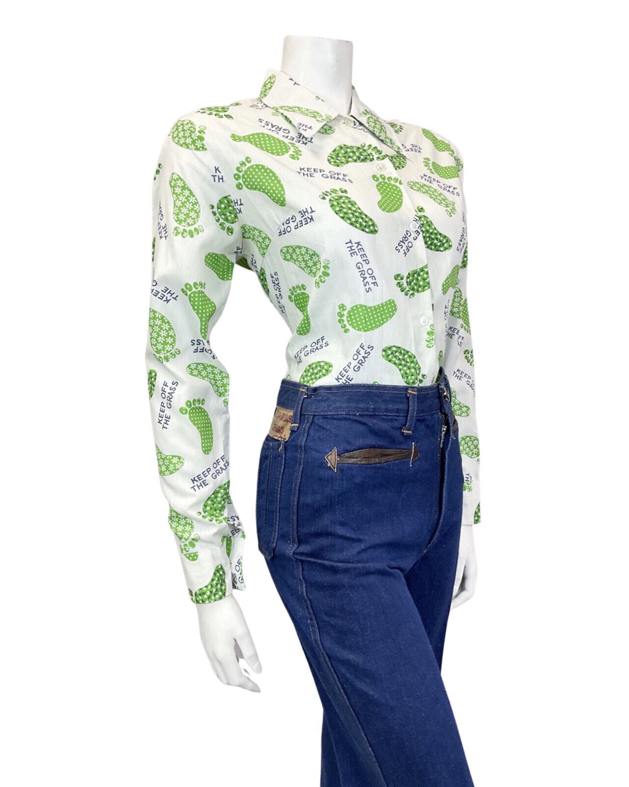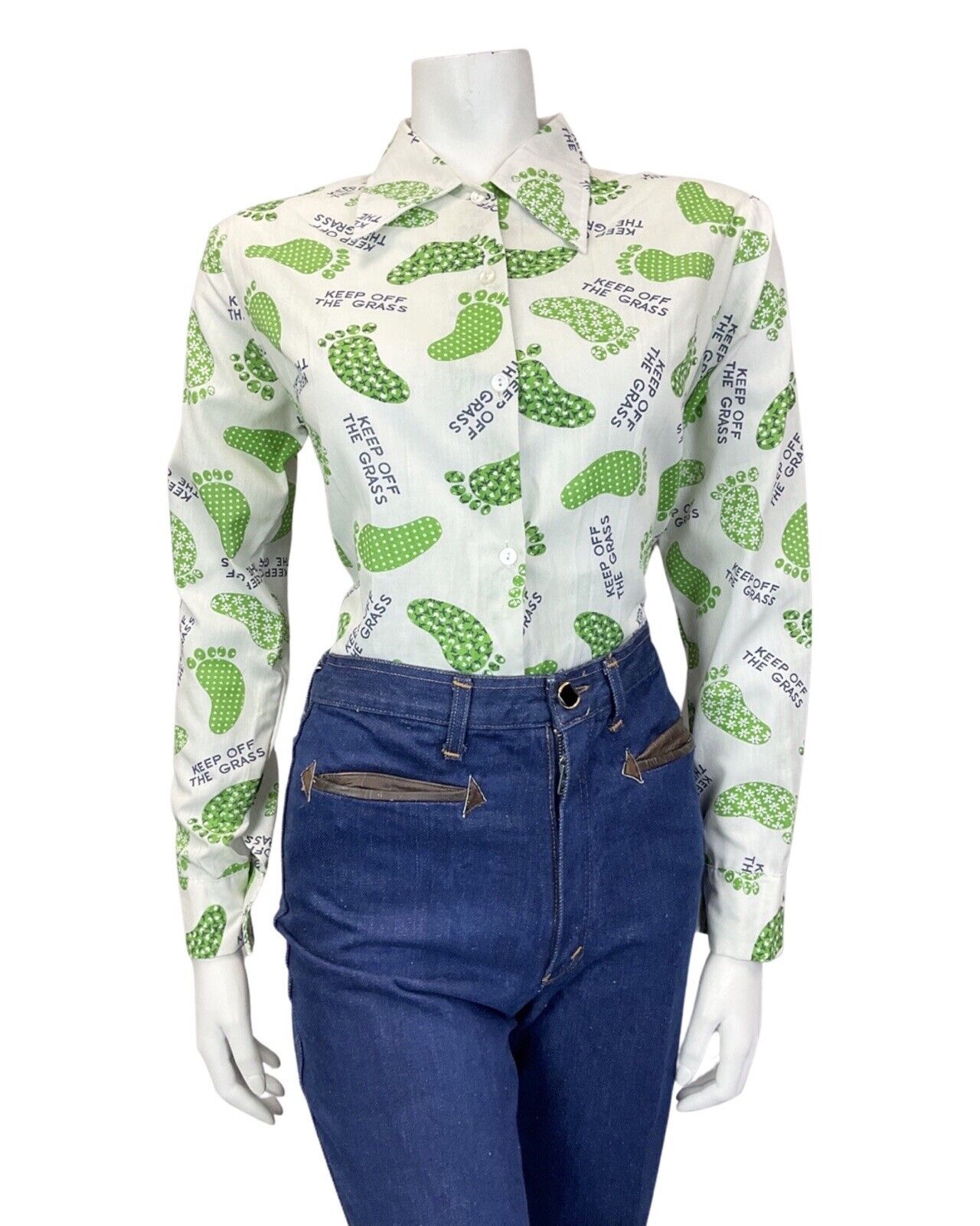VINTAGE 60s 70s WHITE GREEN FOOTPRINT KEEP OFF THE GRASS MOD DAGGER SHIRT 14 16