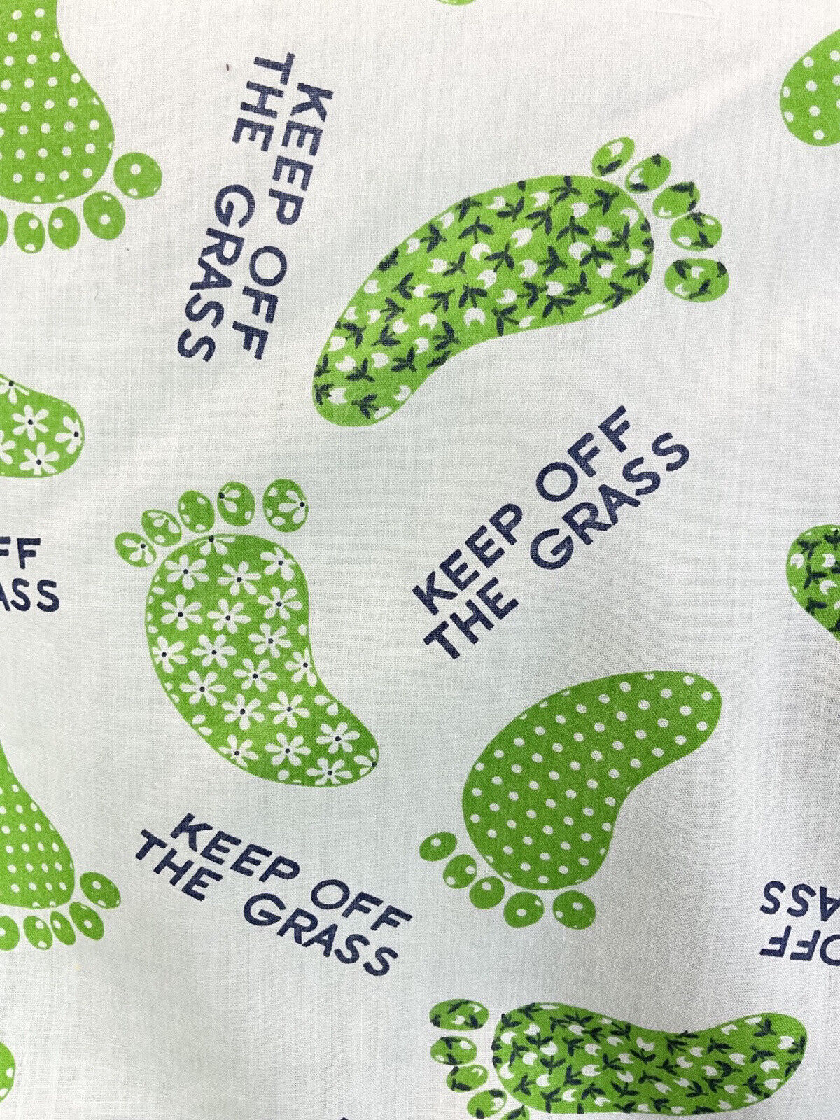 Covering the top is a bold design of patterned footprints in green and white, with "keep feet off the grass" in between.