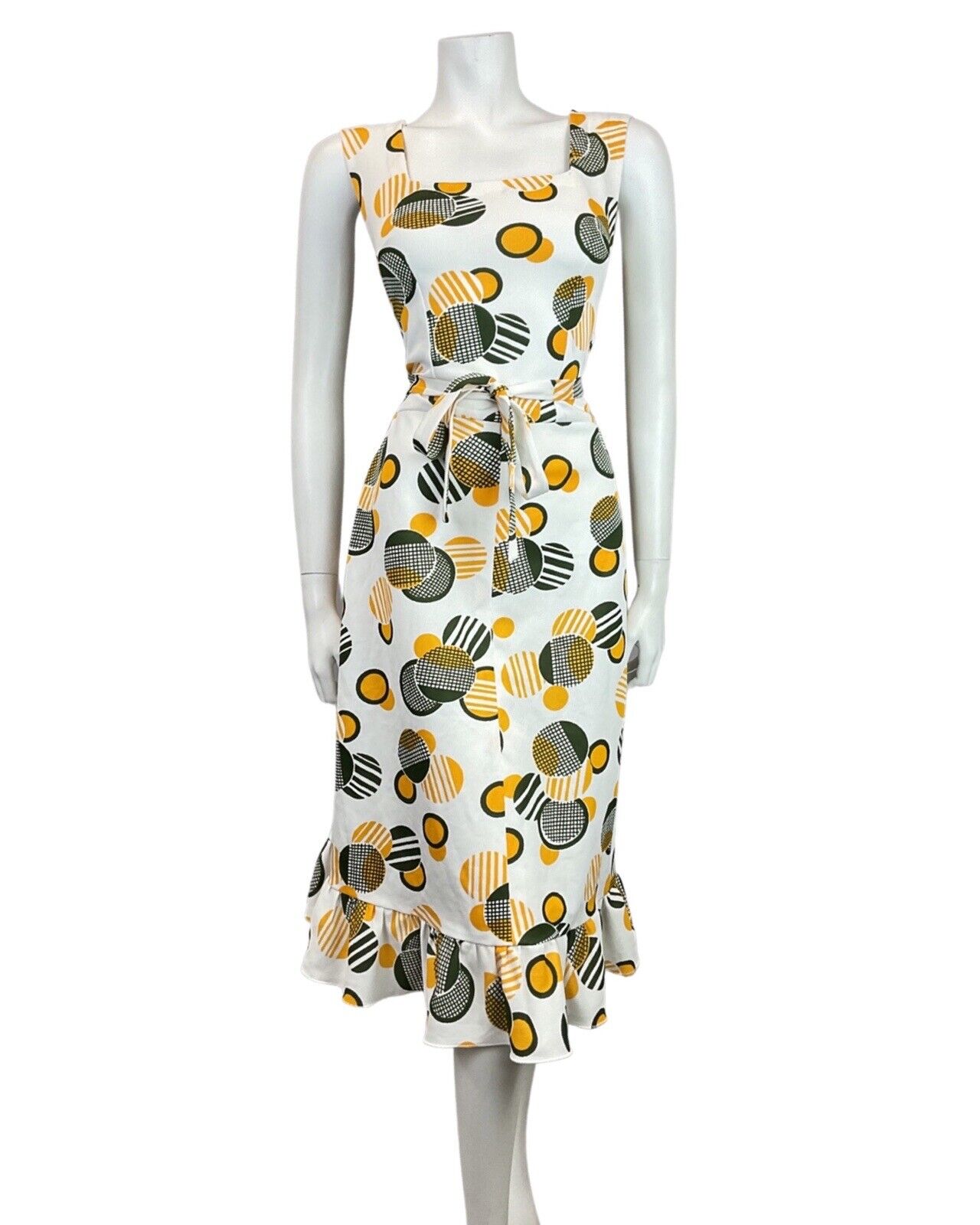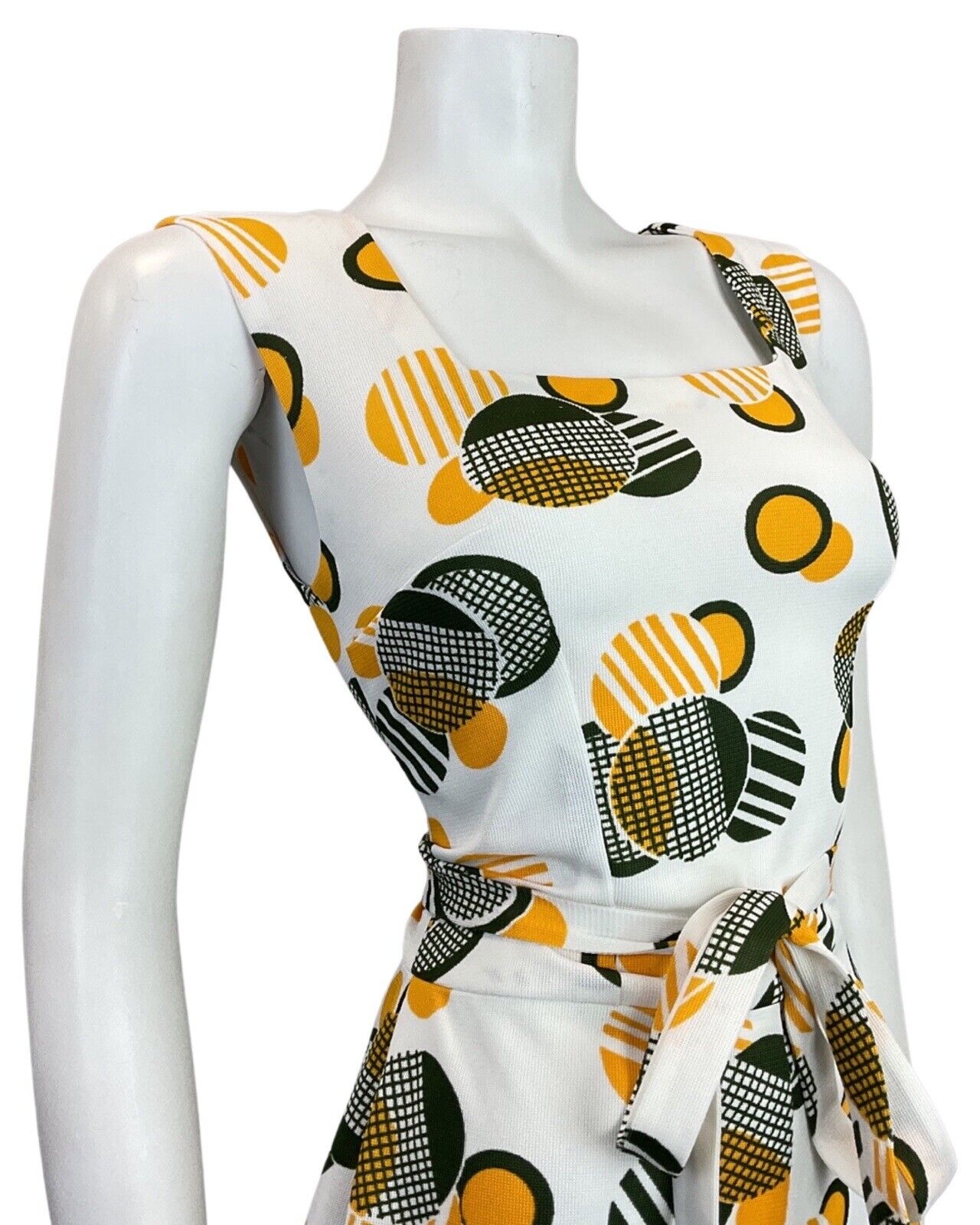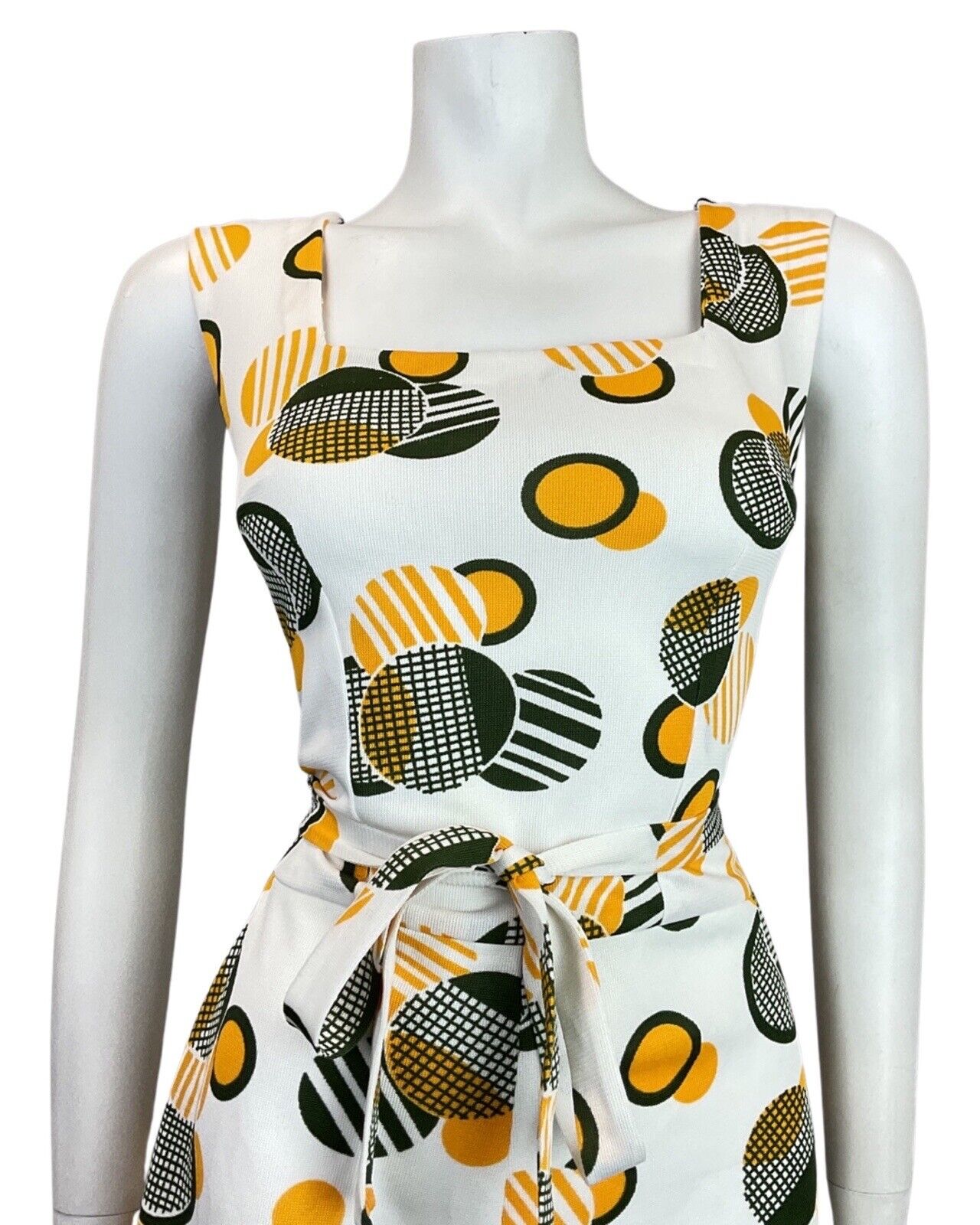VINTAGE 60s 70s WHITE GREEN YELLOW GEOMETRIC MOD SLEEVELESS SUMMER DRESS 8 10