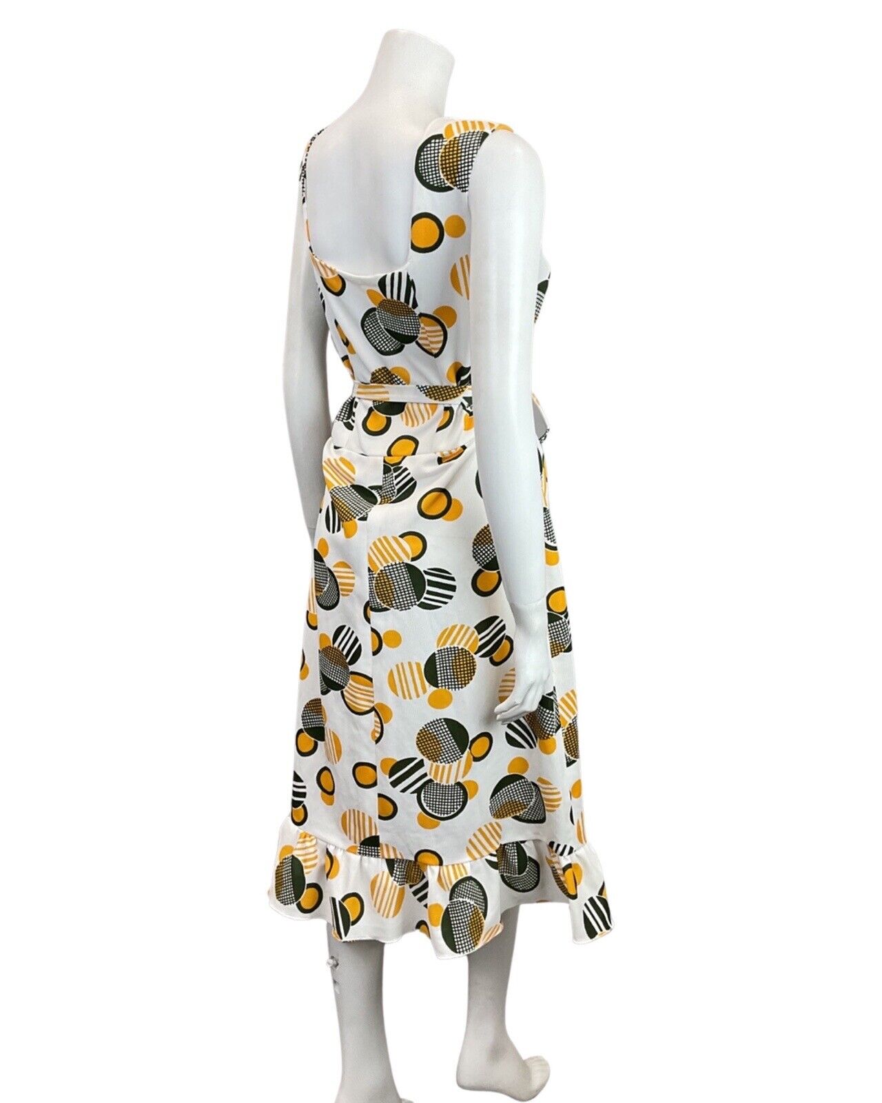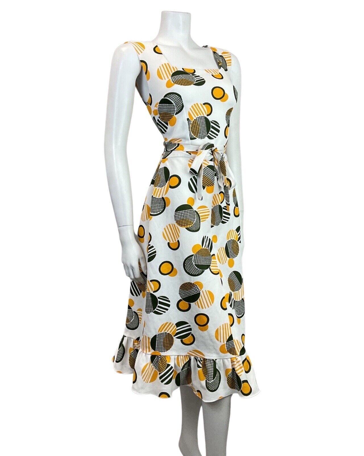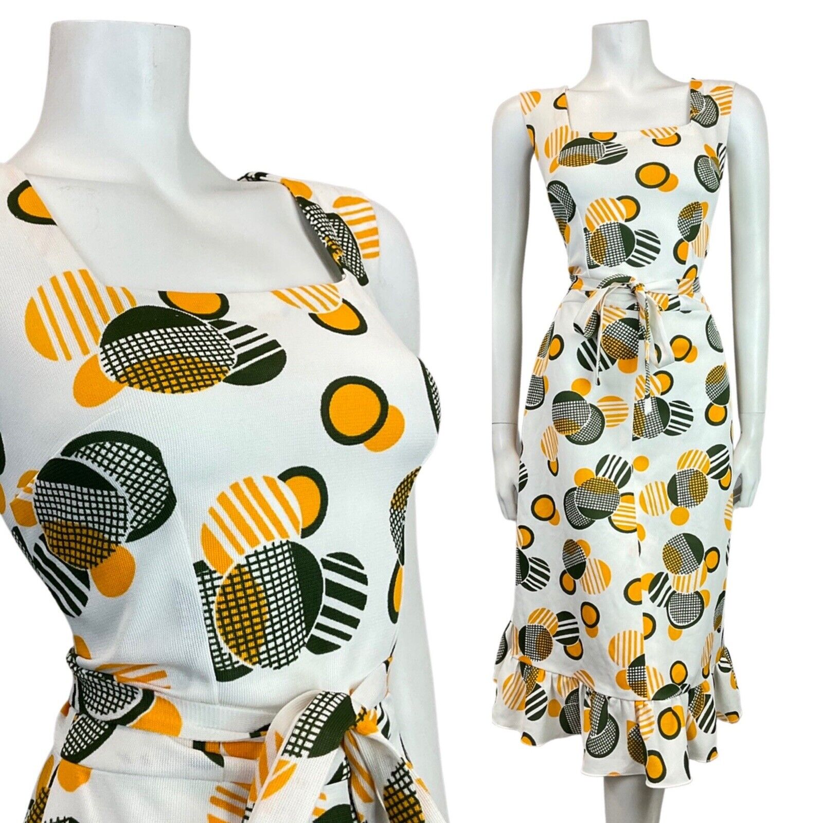 VINTAGE 60s 70s WHITE GREEN YELLOW GEOMETRIC MOD SLEEVELESS SUMMER DRESS 8 10
