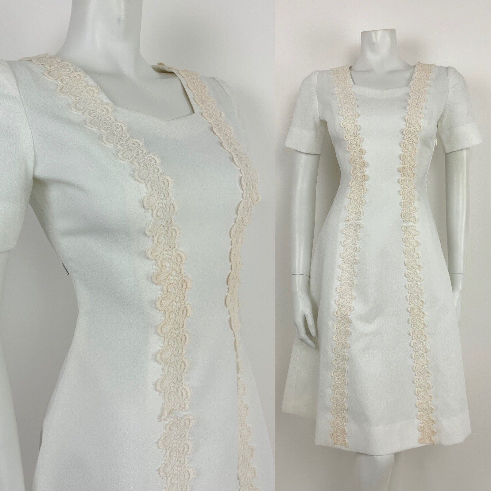 VINTAGE 60s 70s WHITE IVORY BRODERIE ANGLAISE LACE PRINCESS LINE DRESS 8 10