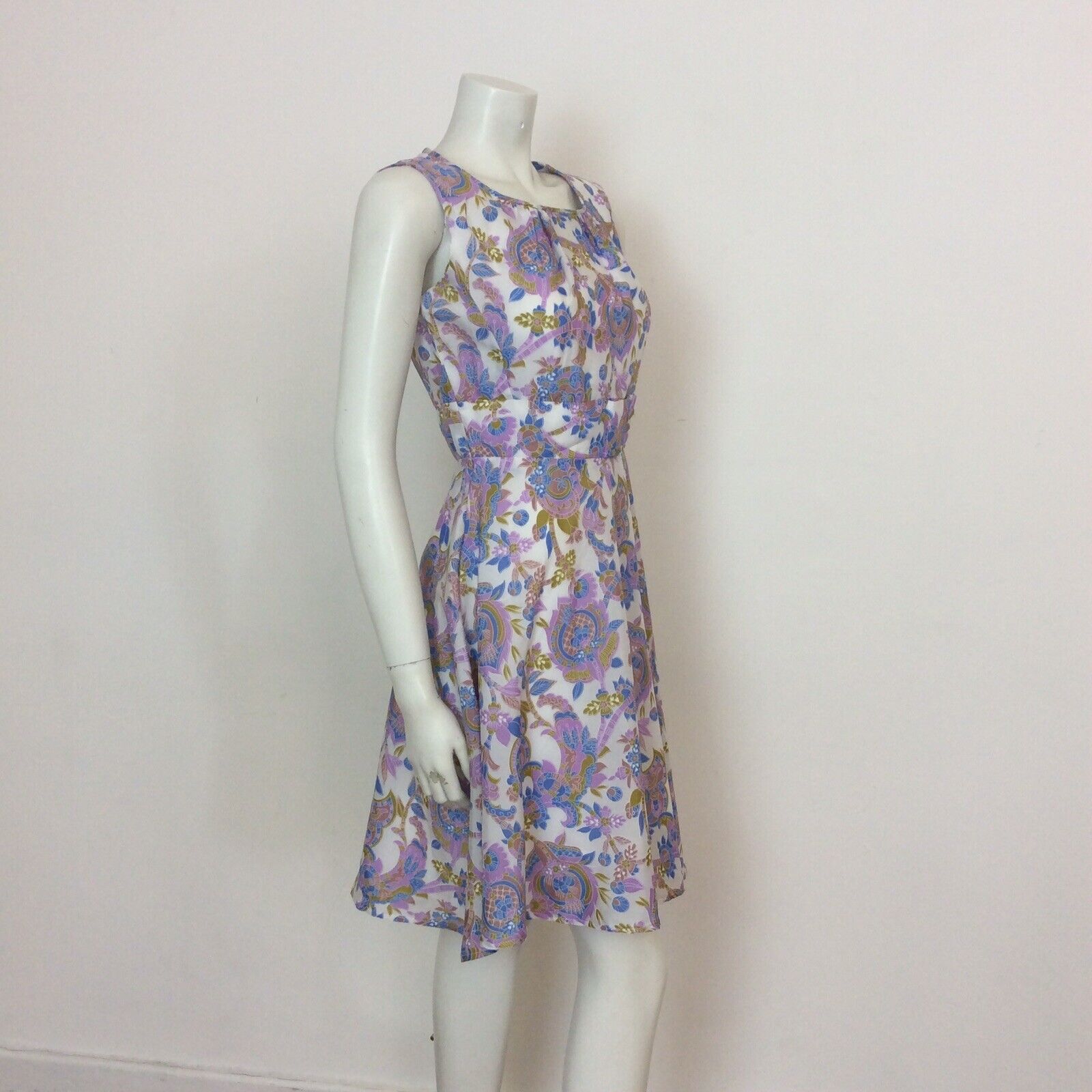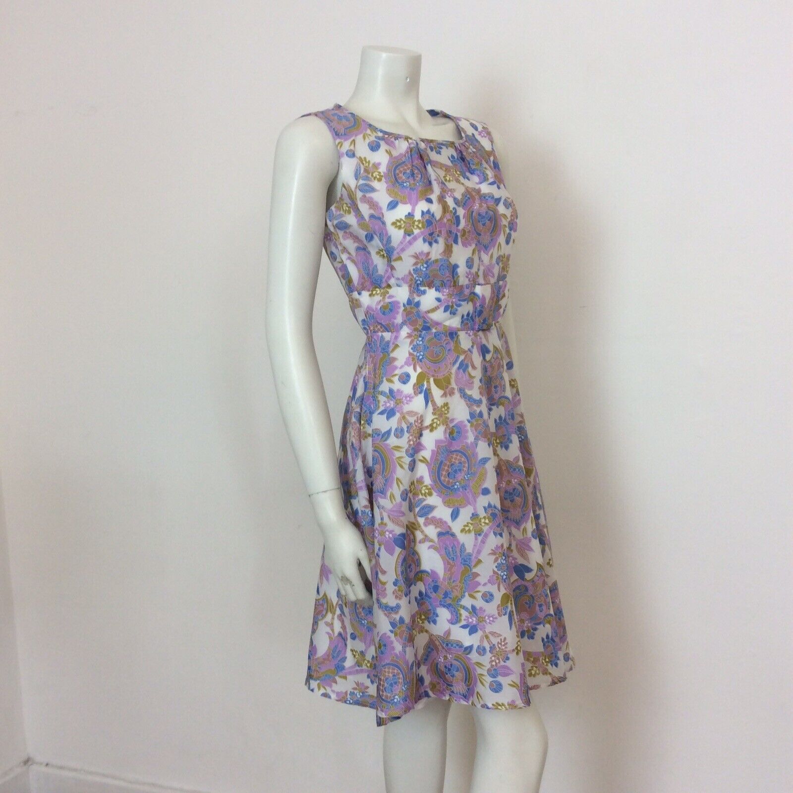 VINTAGE 60S 70s WHITE MUSTARD BLUE PURPLE PAISLEY DRESS 8 10
