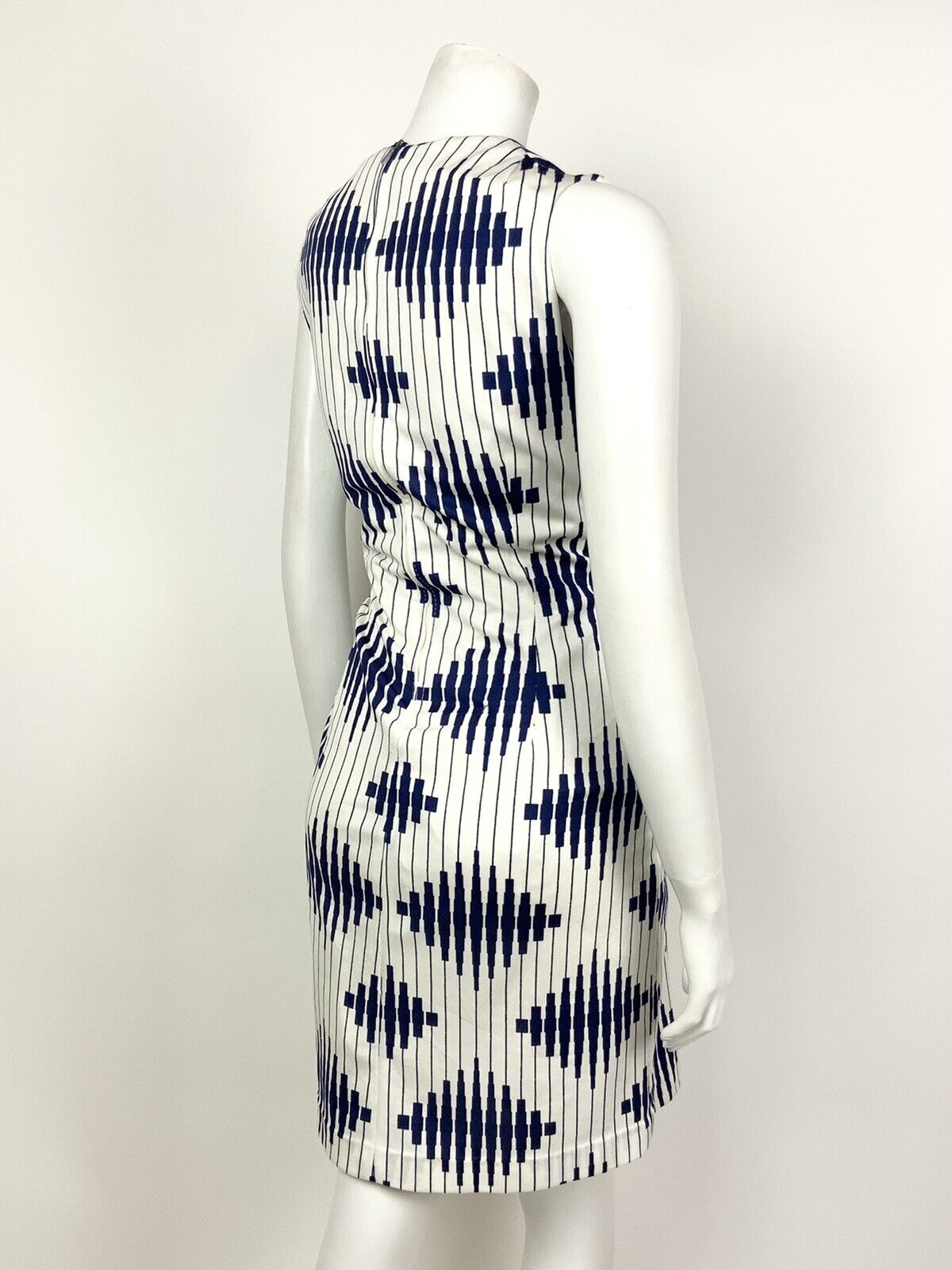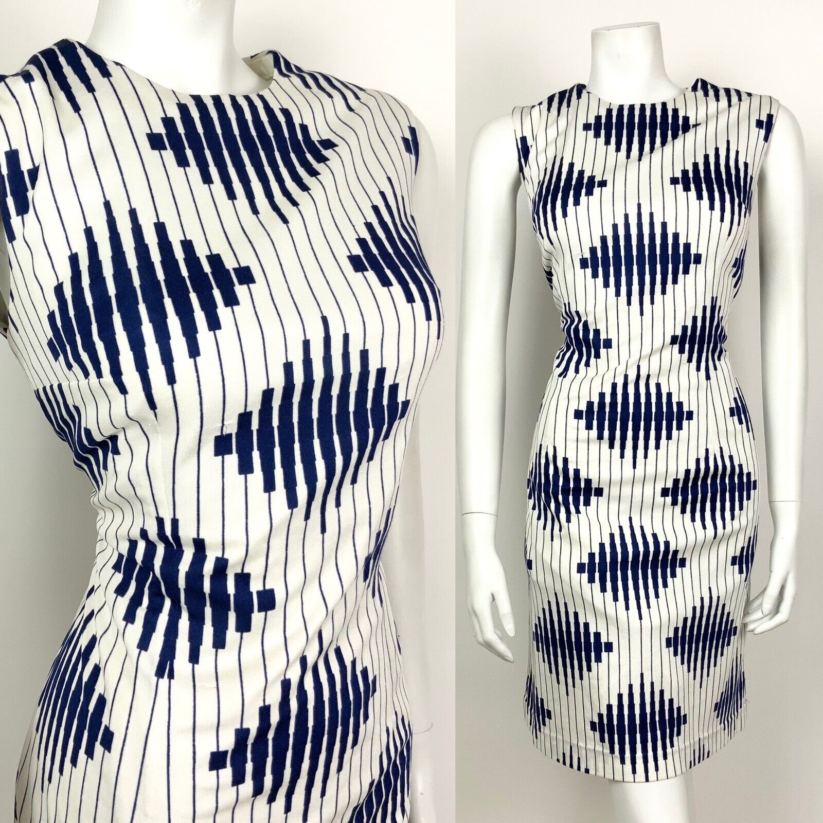 VINTAGE 60s 70s WHITE NAVY BLUE STRIPED DIAMOND GEOMETRIC WIGGLE DRESS 12 14