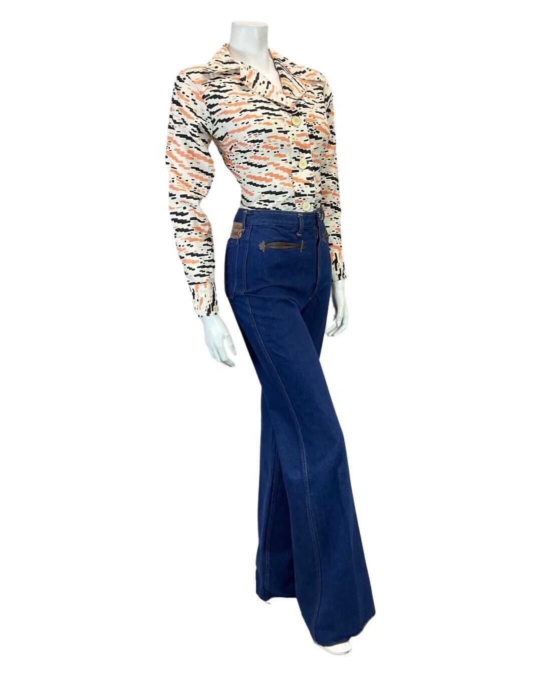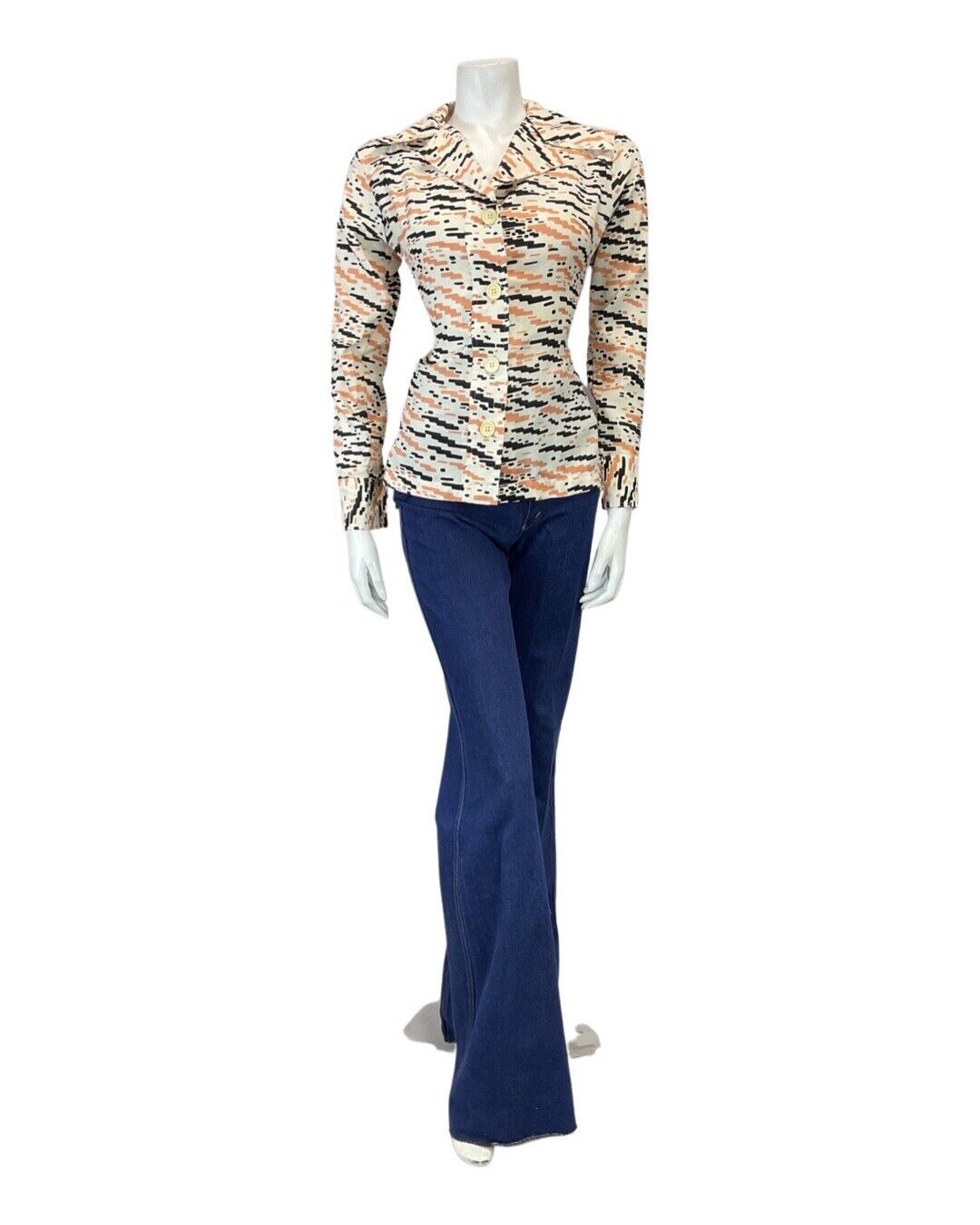 VINTAGE 60s 70s WHITE ORANGE BLACK GEOMETRIC ZIG-ZAG MOD DAGGER BLOUSE 12