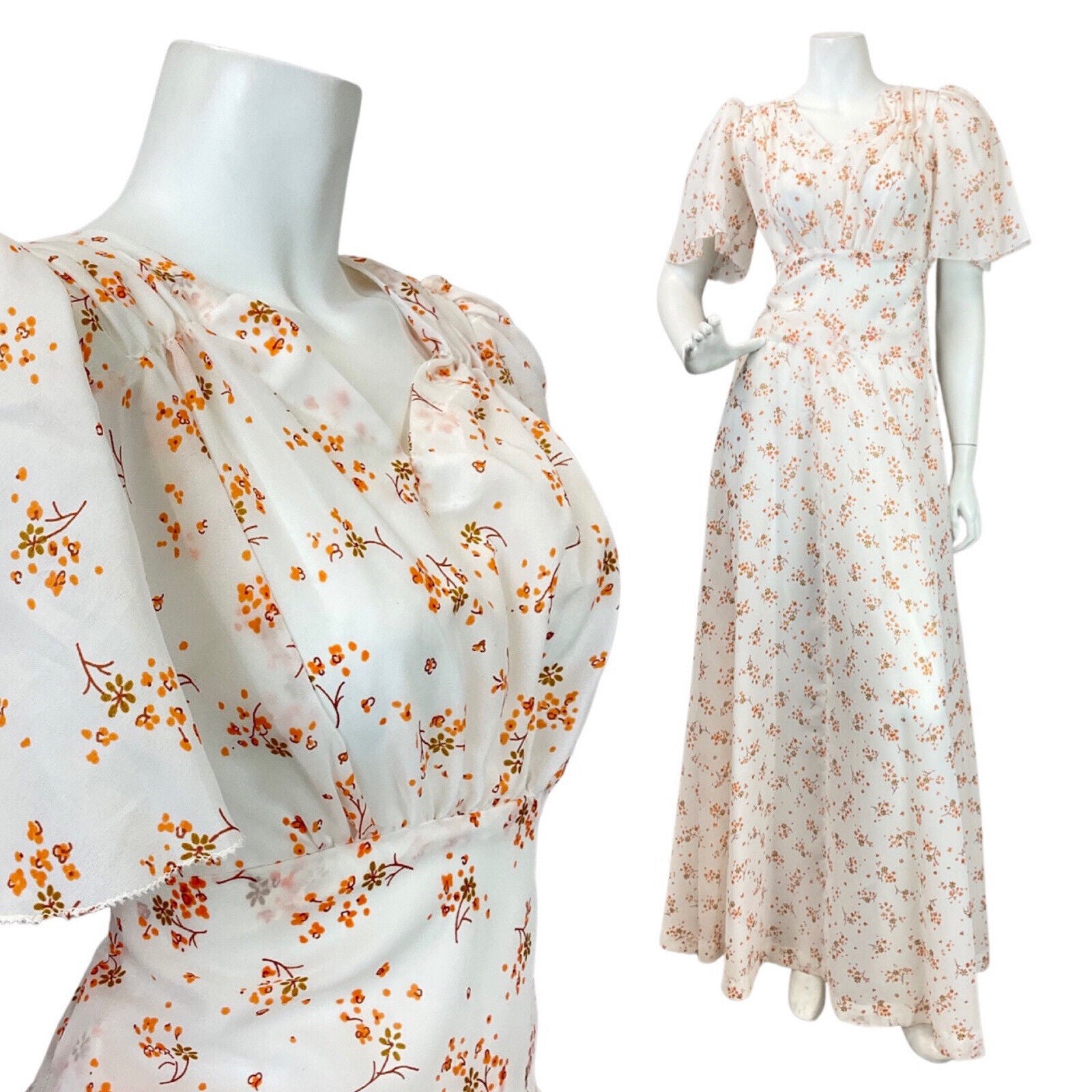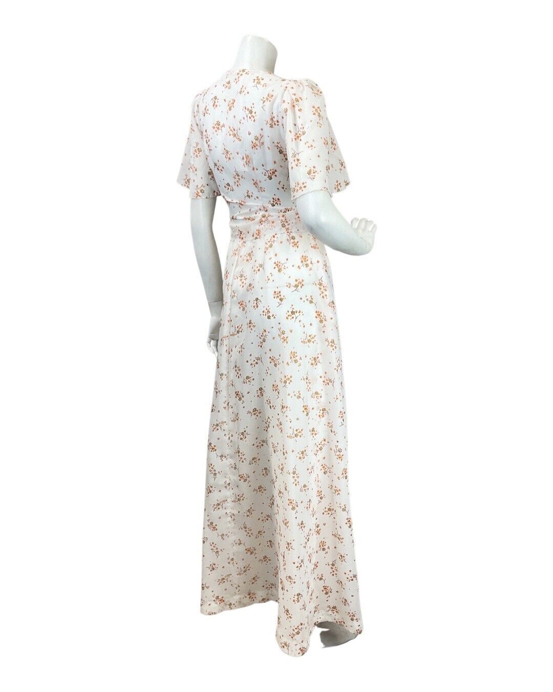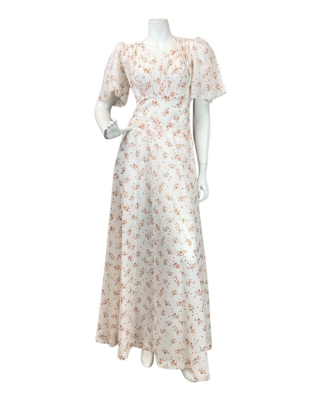 VINTAGE 60s 70s WHITE ORANGE BROWN FLORAL DITSY PRAIRIE BOHO MAXI DRESS 12 14