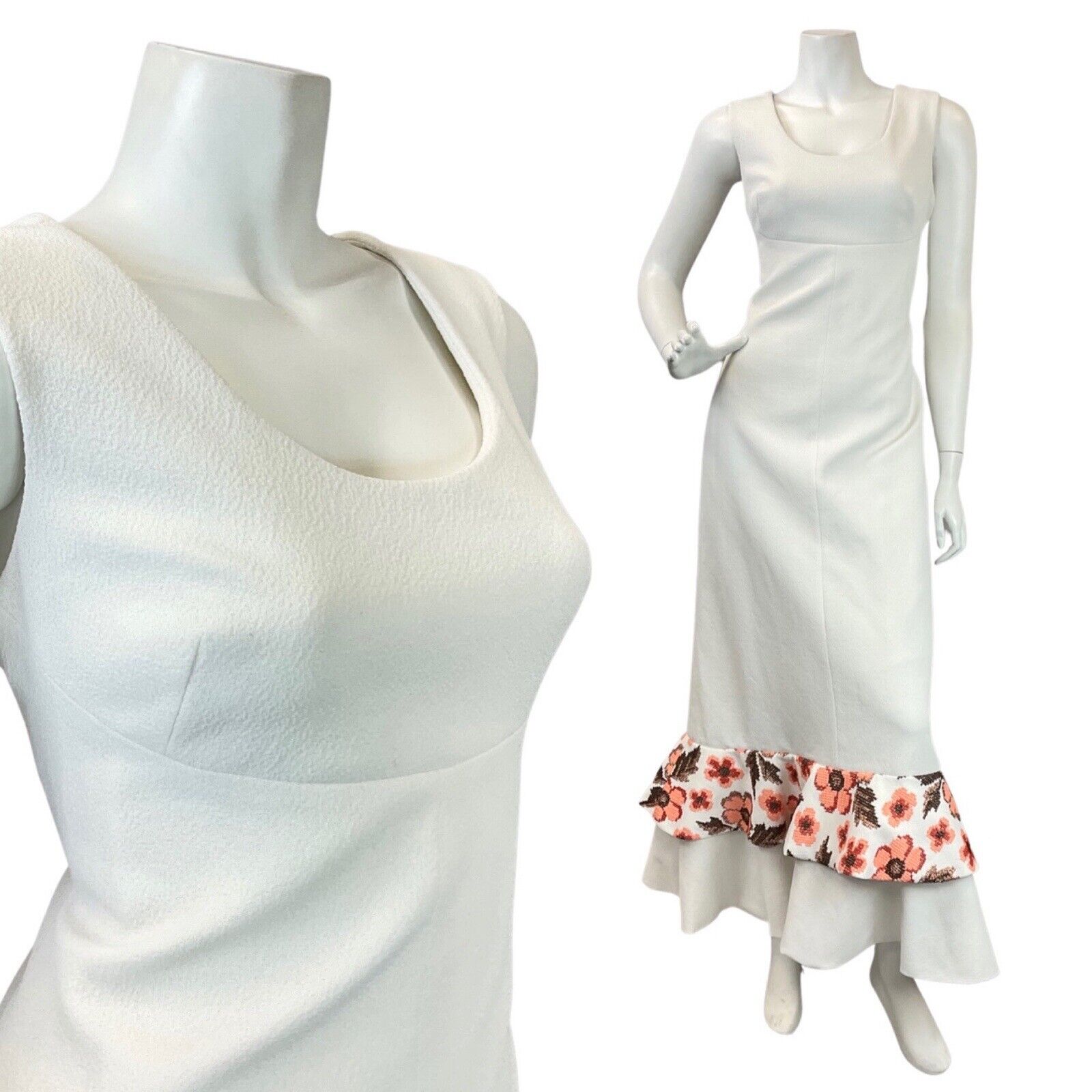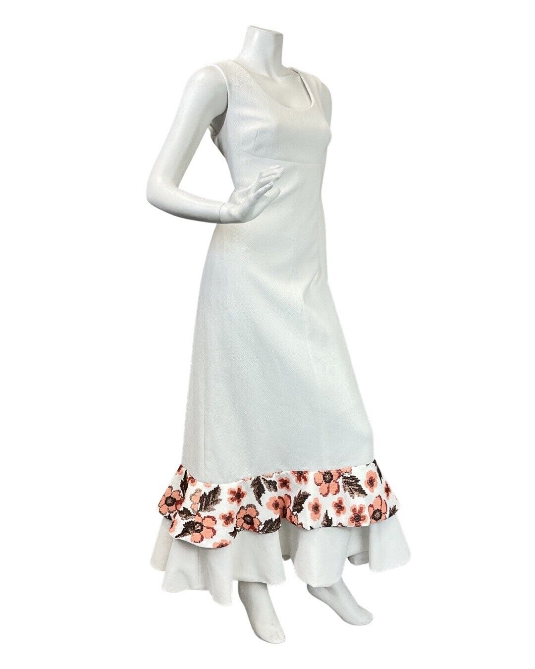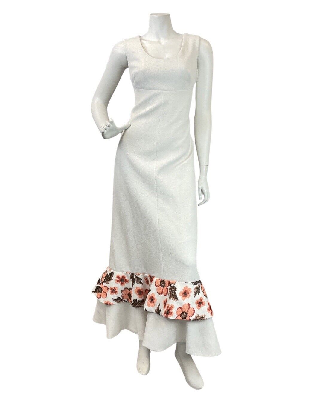 VINTAGE 60s 70s WHITE PEACH BROWN CROSS-STITCH FLORAL MOD EMPIRE MAXI DRESS 10