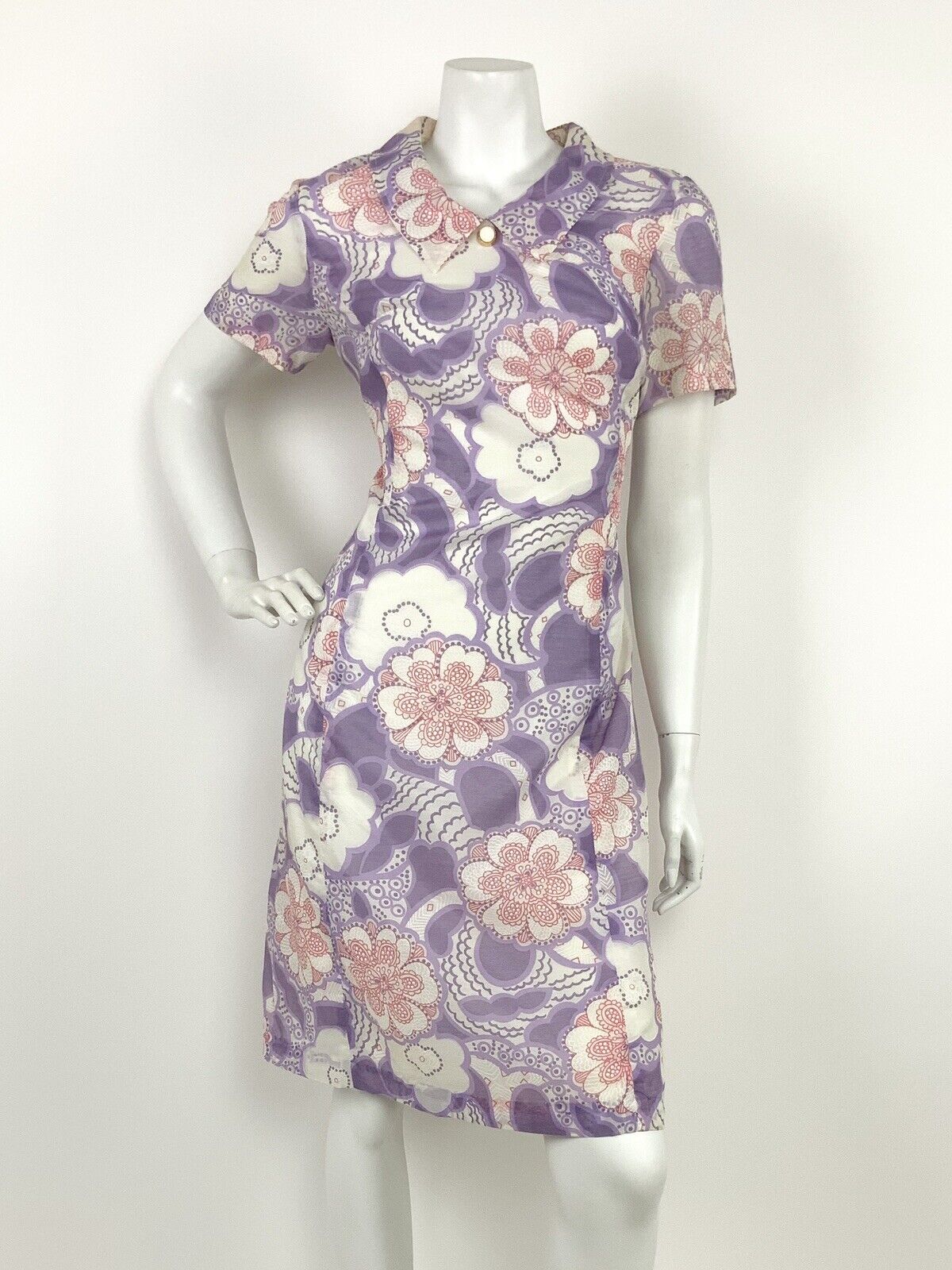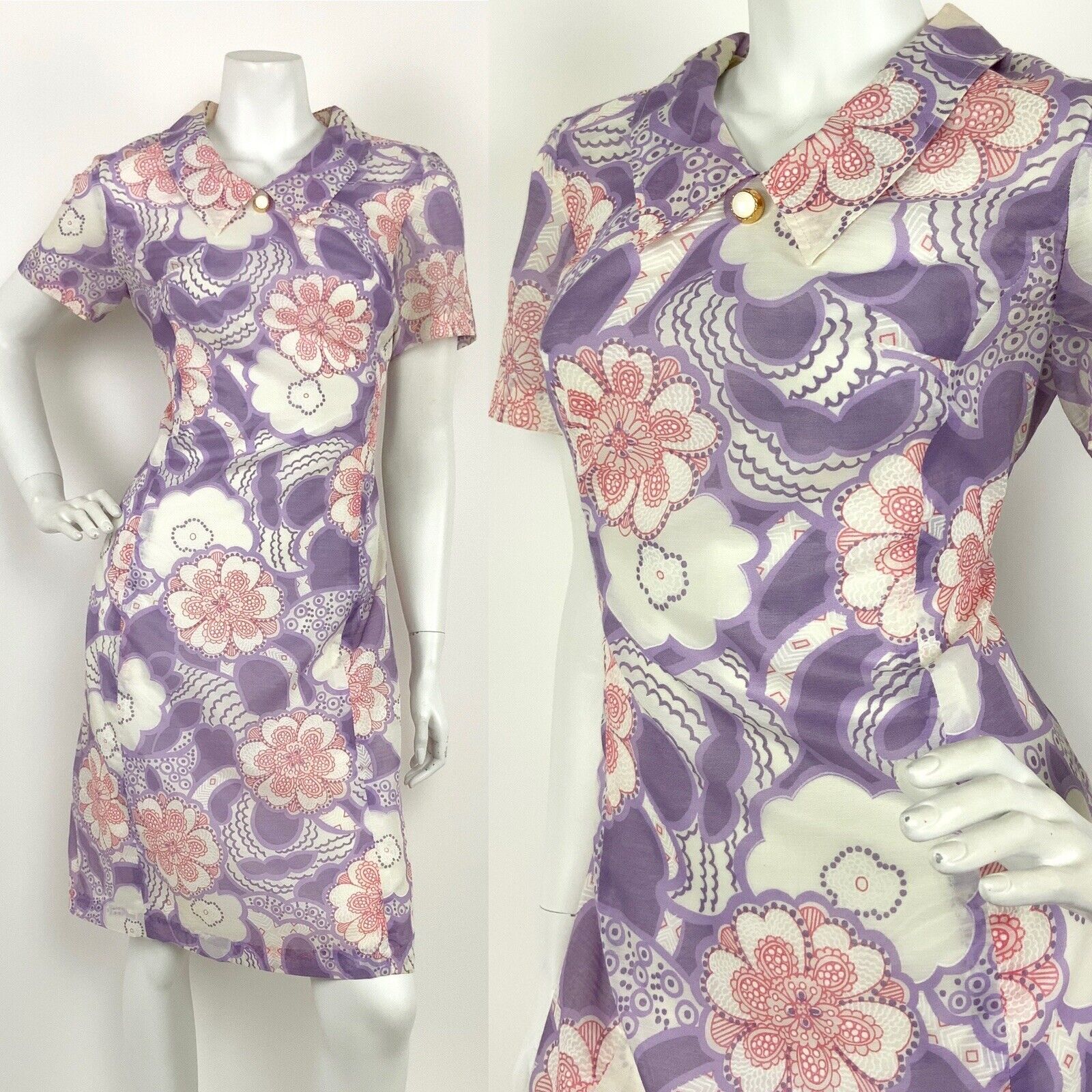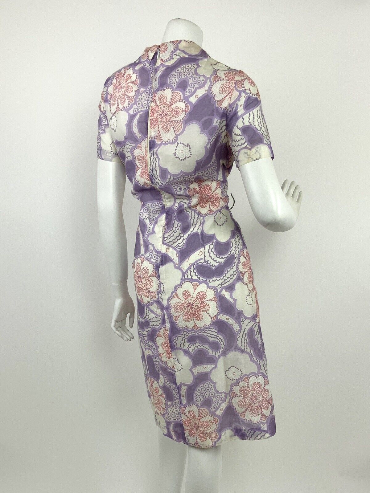 VINTAGE 60s 70s WHITE PINK PURPLE FLORAL DAISY PAISLEY PSYCHEDELIC DRESS 12 14