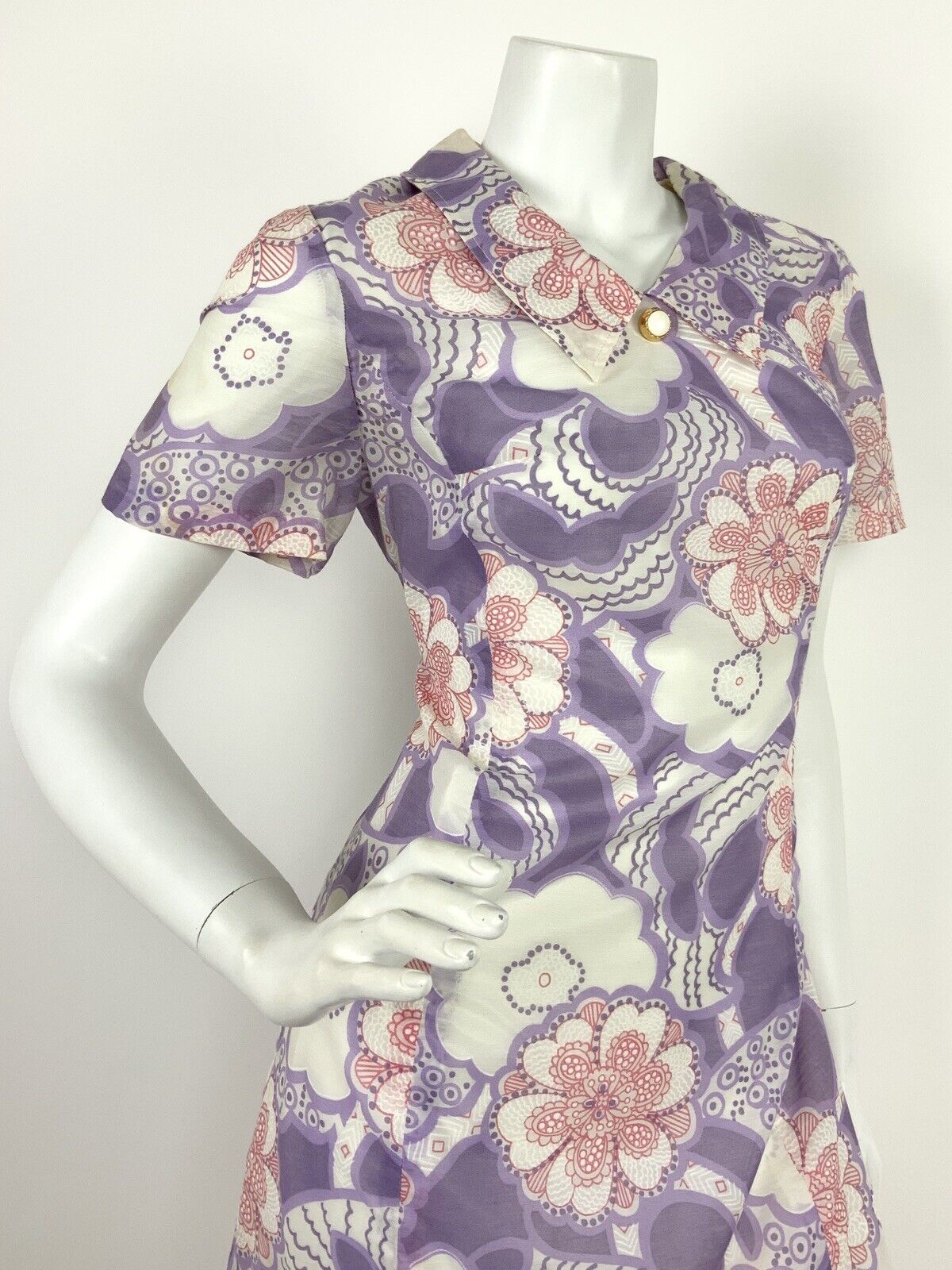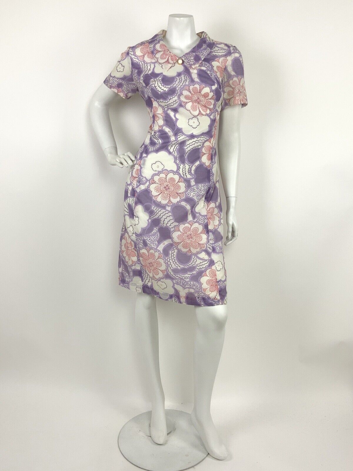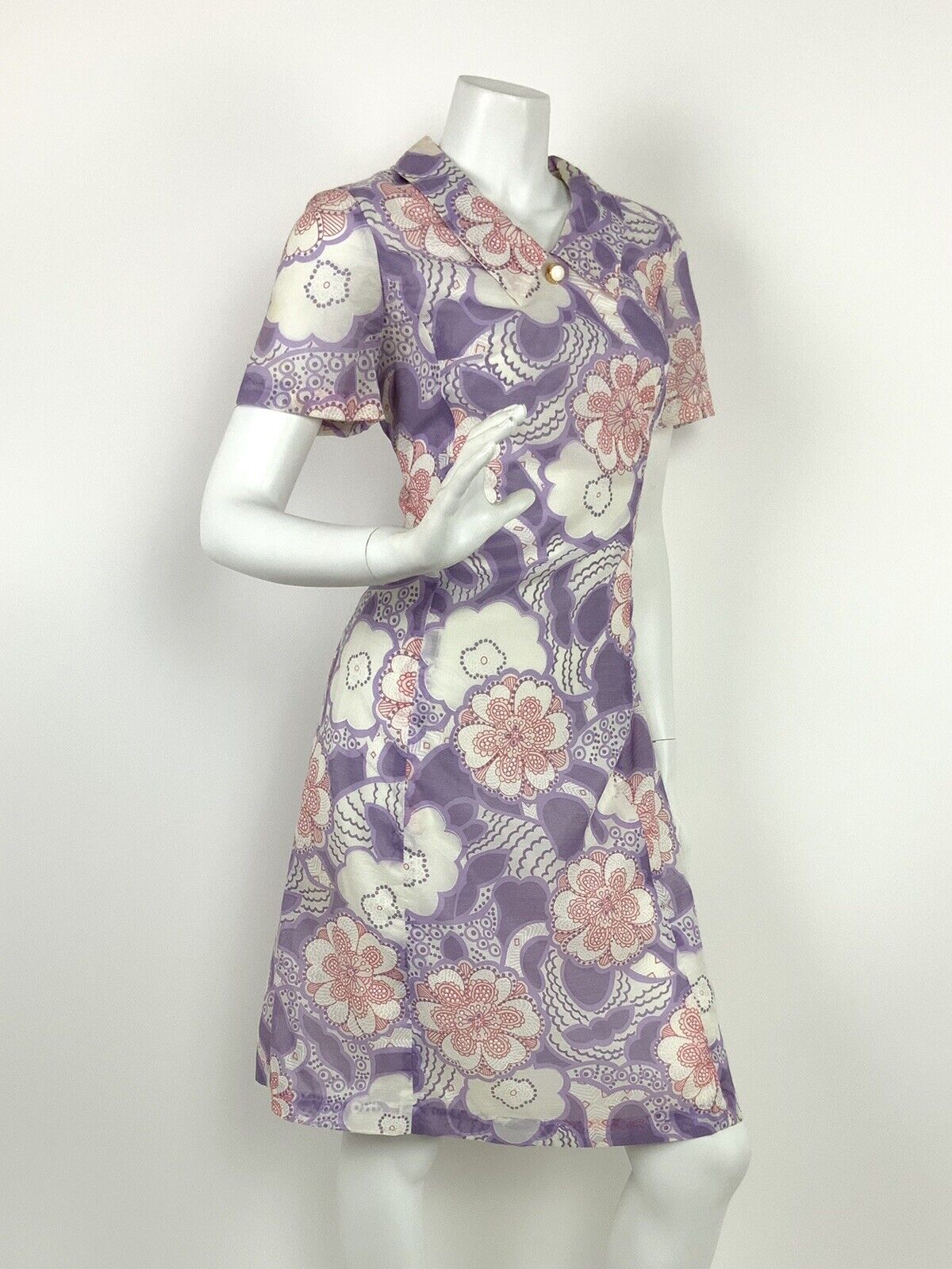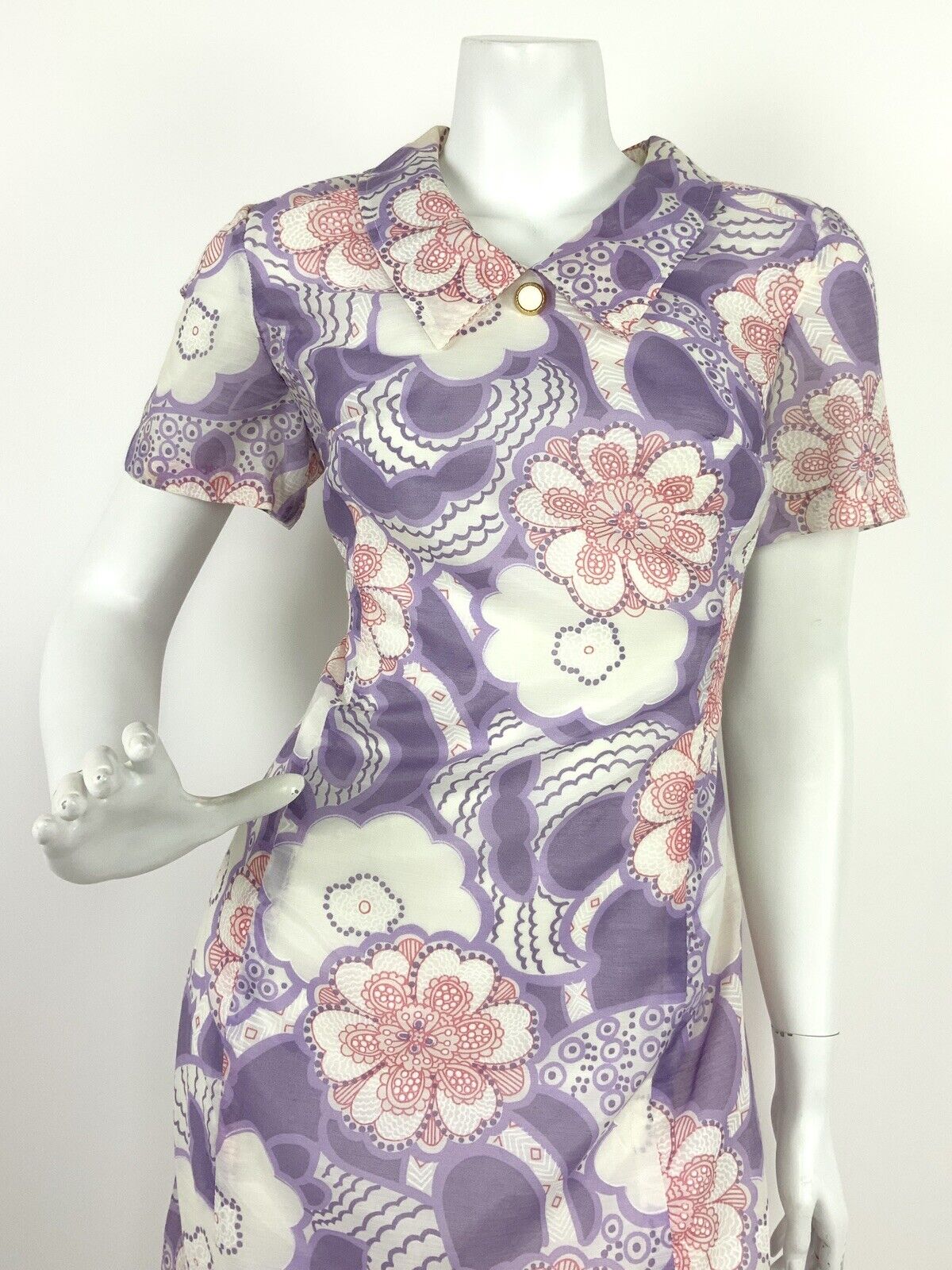 VINTAGE 60s 70s WHITE PINK PURPLE FLORAL DAISY PAISLEY PSYCHEDELIC DRESS 12 14