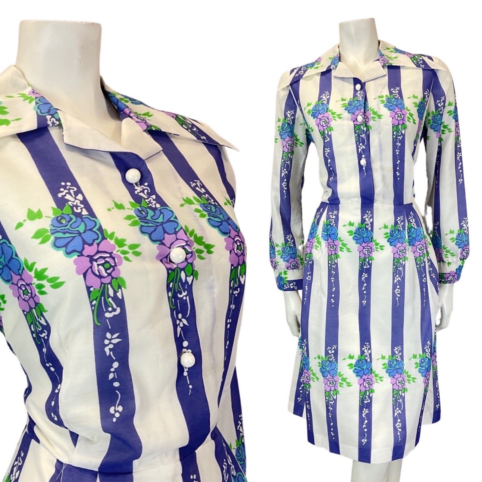 VINTAGE 60s 70s WHITE PURPLE BLUE STRIPED FLORAL WING COLLAR SHIRT DRESS 12 14