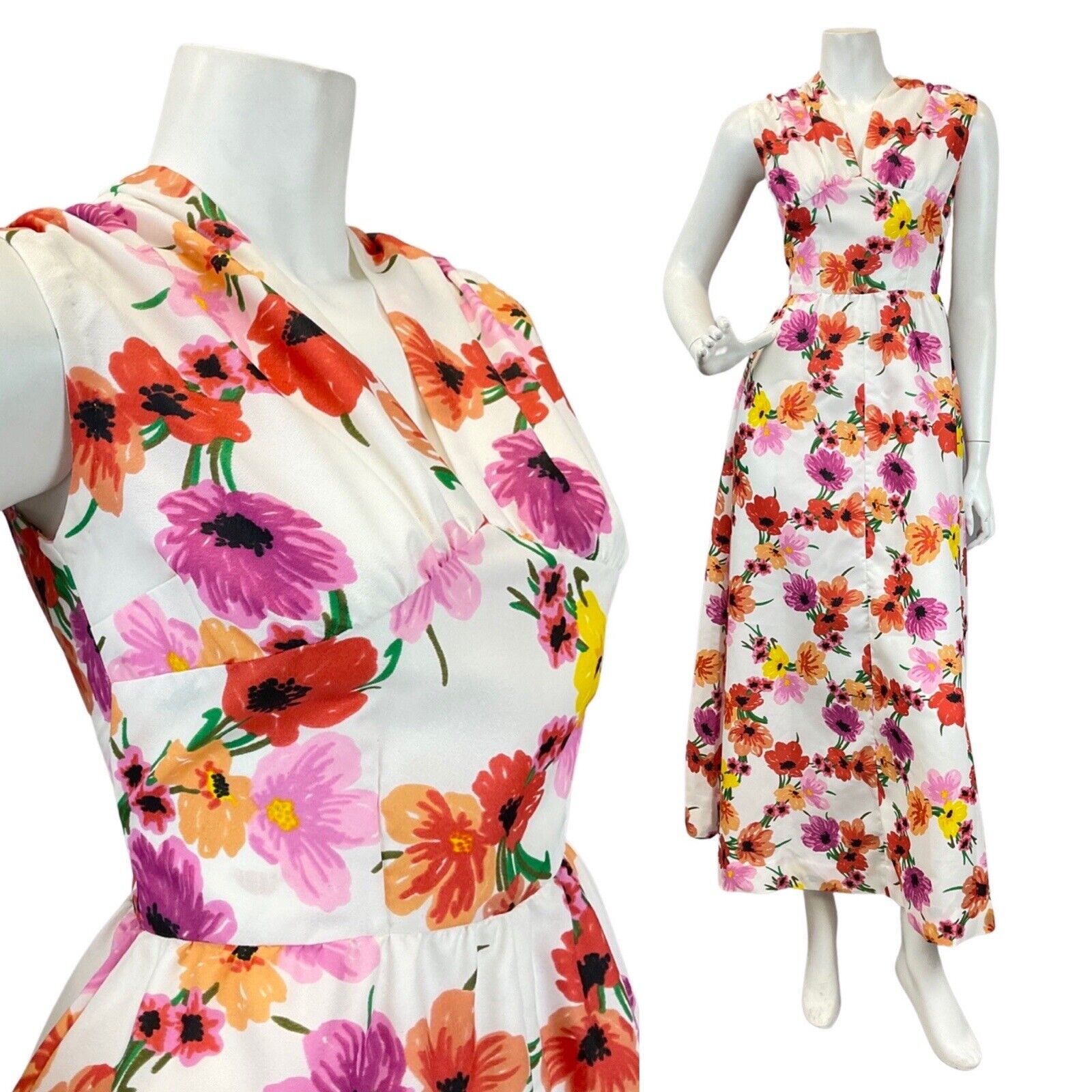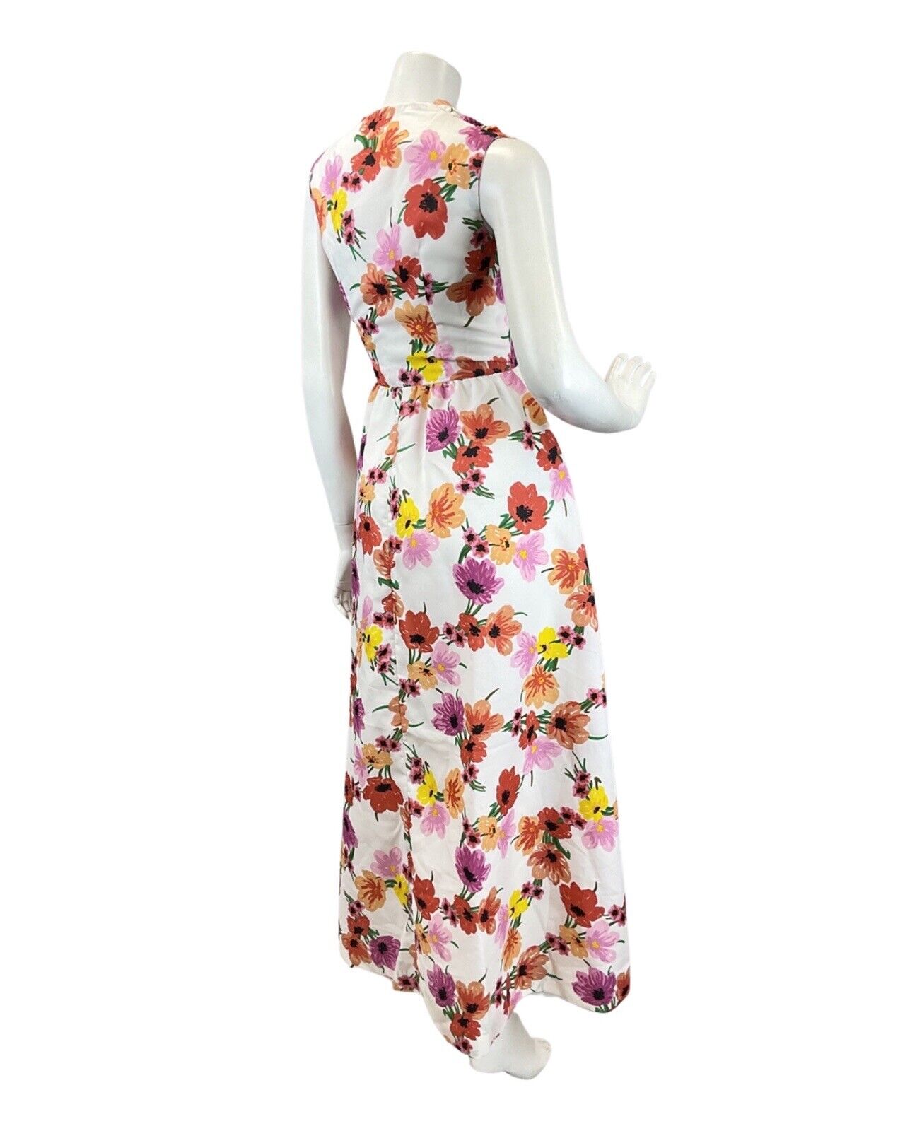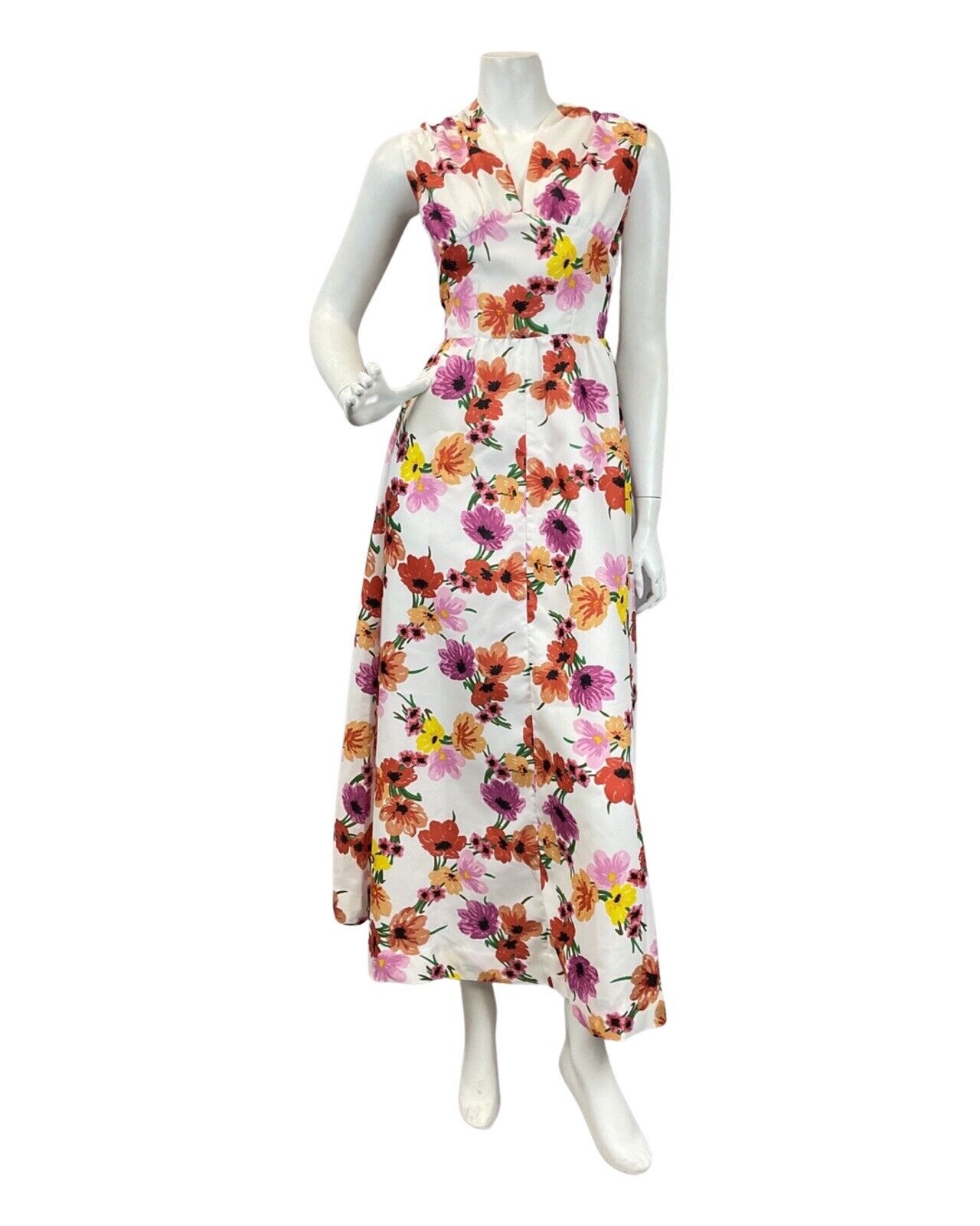 VINTAGE 60s 70s WHITE PURPLE RED FLORAL DAISY POPPY SLEEVELESS MAXI DRESS 8 10