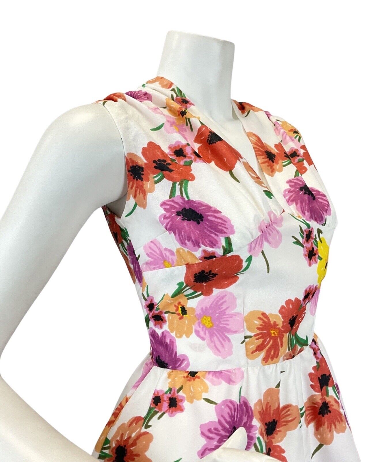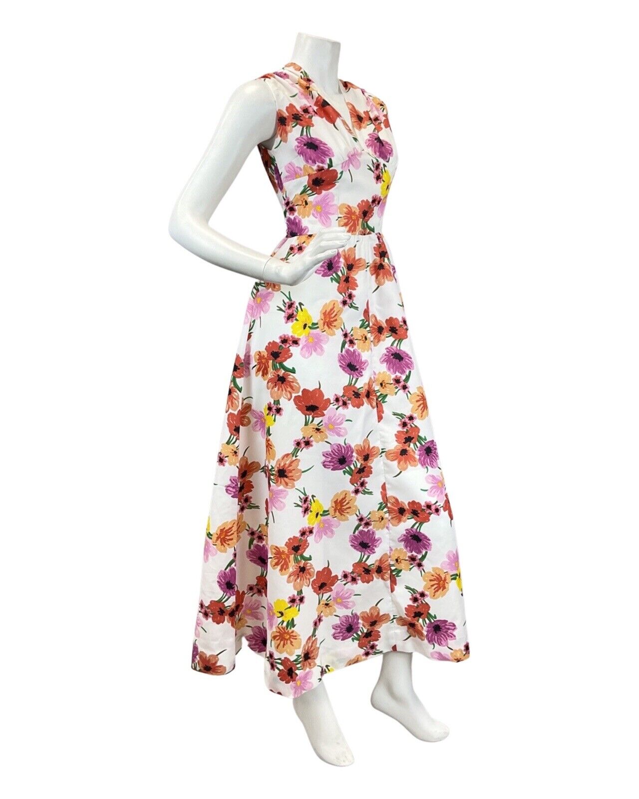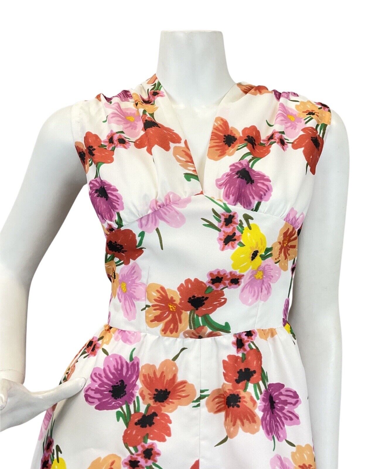VINTAGE 60s 70s WHITE PURPLE RED FLORAL DAISY POPPY SLEEVELESS MAXI DRESS 8 10