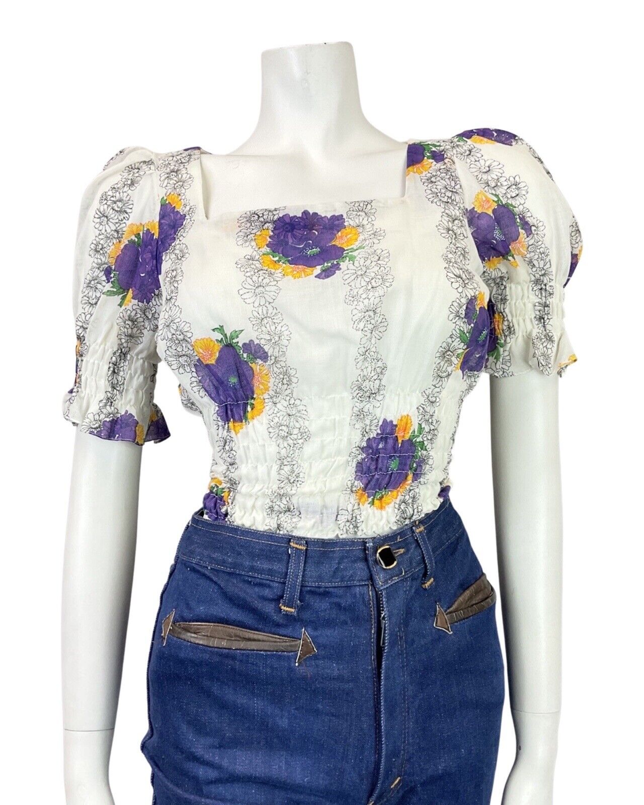 VINTAGE 60s 70s WHITE PURPLE YELLOW FLORAL SHIRRED BOHO PRAIRIE CROPPED TOP 6