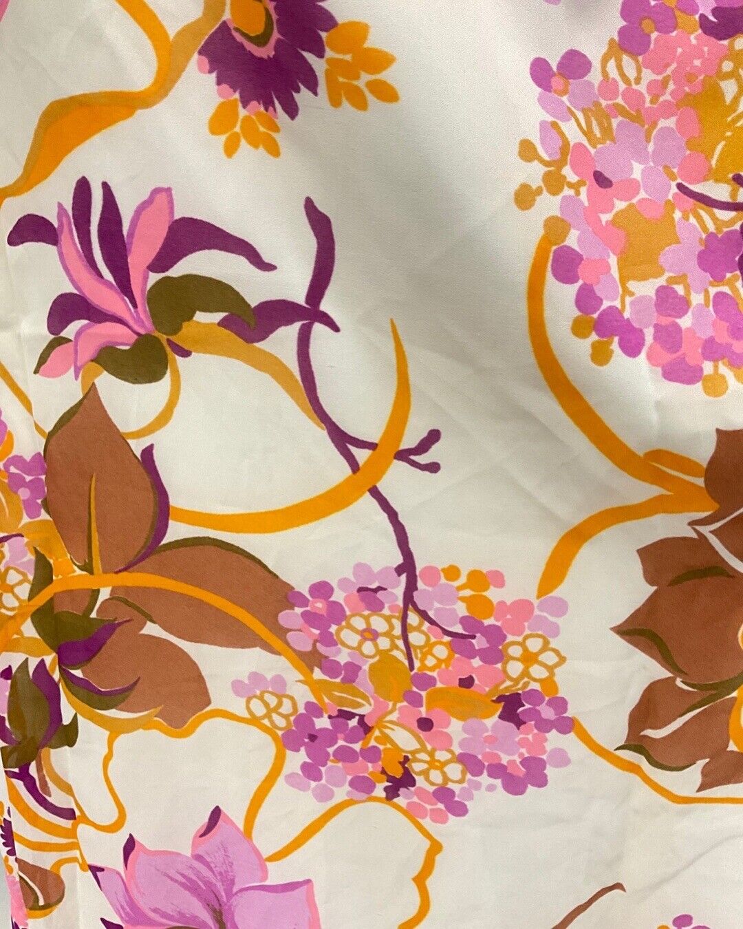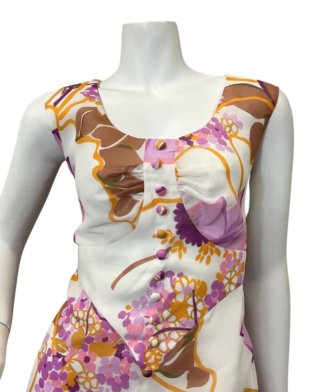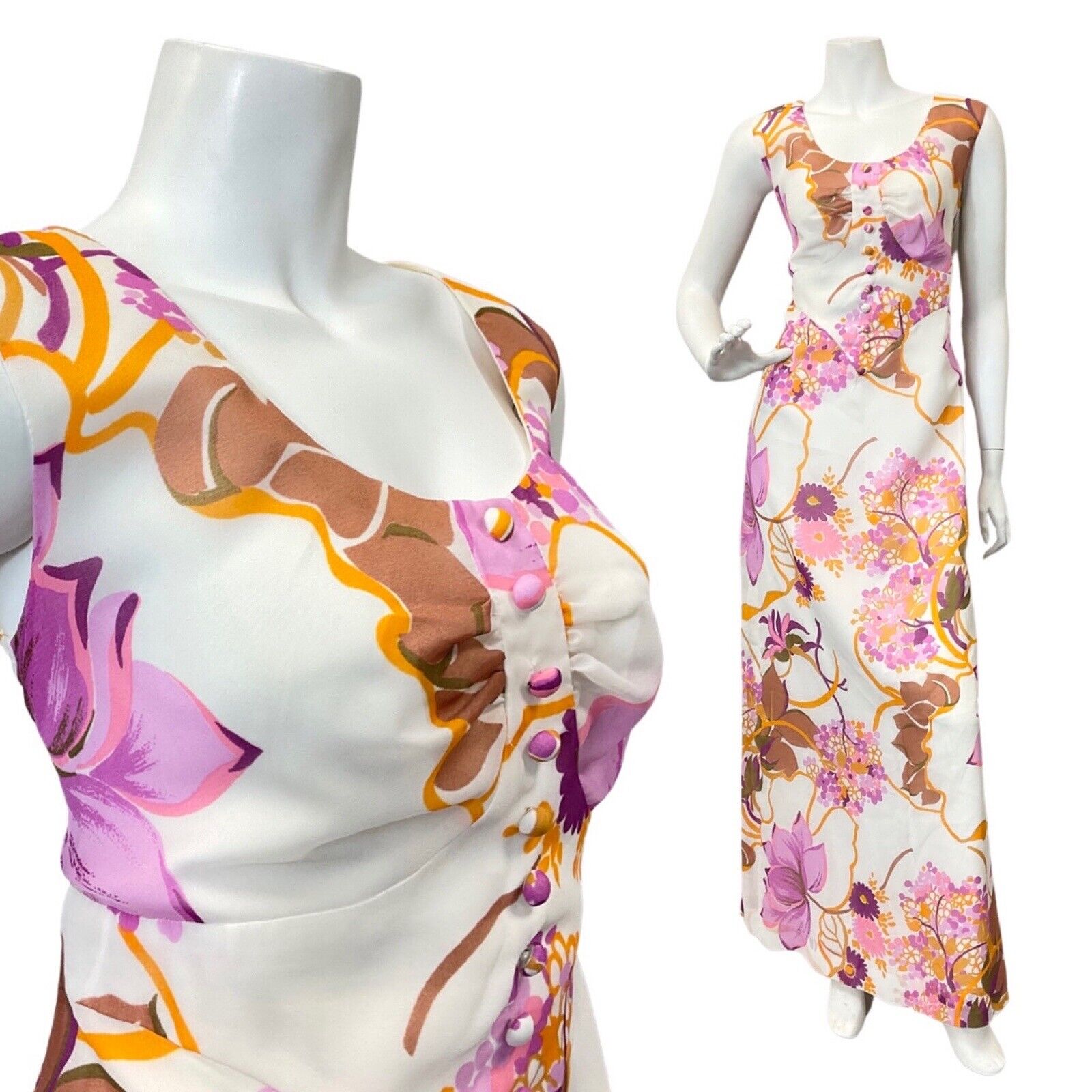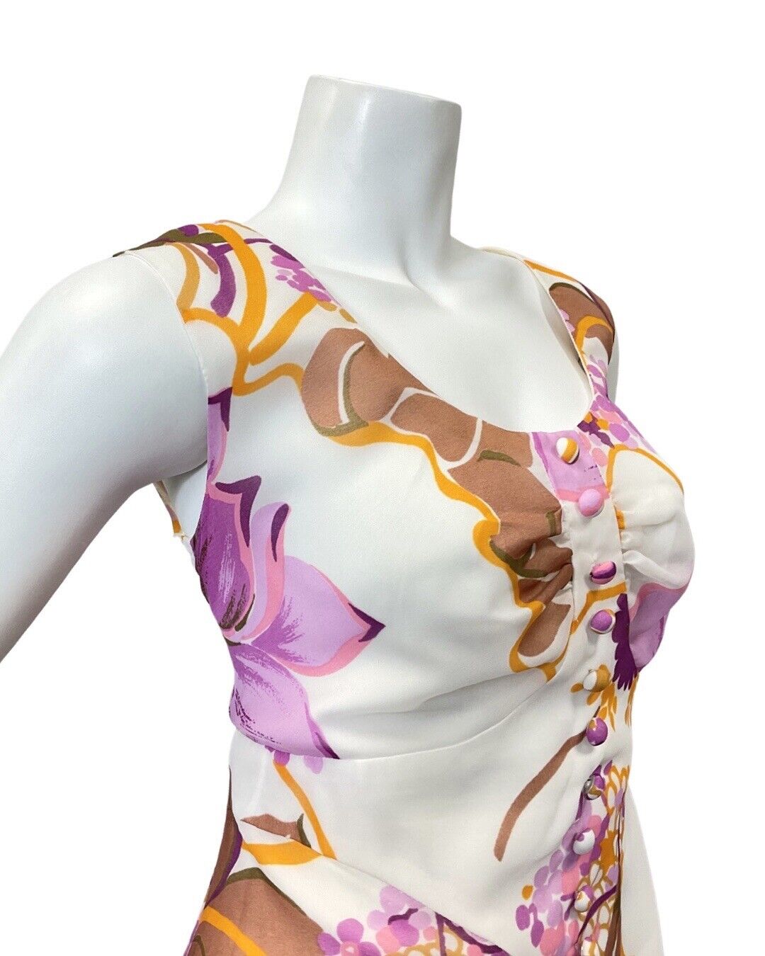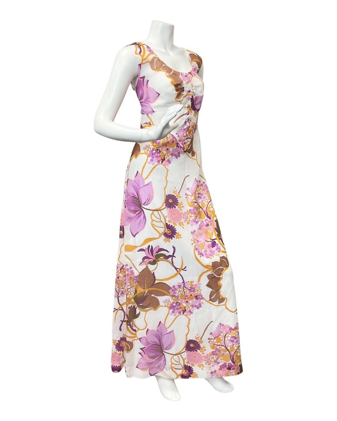 VINTAGE 60s 70s WHITE PURPLE YELLOW FLORAL VINE SLEEVELESS SUMMER MAXI DRESS 12