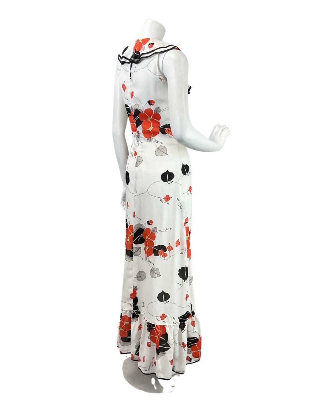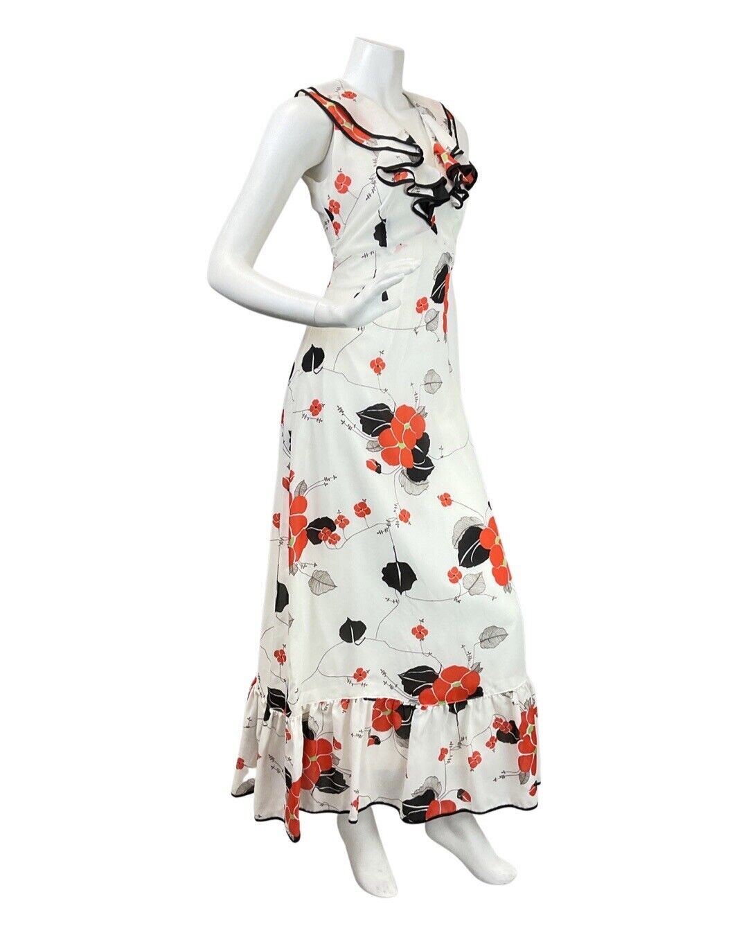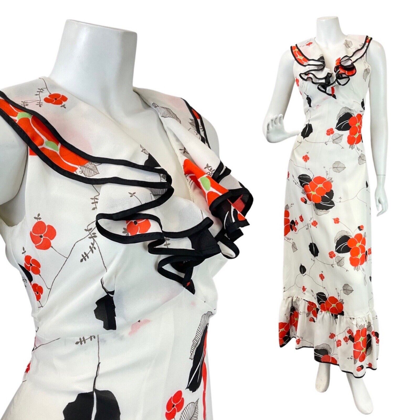 VINTAGE 60s 70s WHITE RED BLACK FLORAL RUFFLED MOD SLEEVELESS MAXI DRESS 8