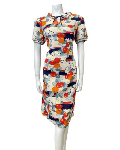 VINTAGE 60s 70s WHITE RED BLUE BERRY FLORAL RUFFLE MOD SHORTSLEEVE DRESS 16 18