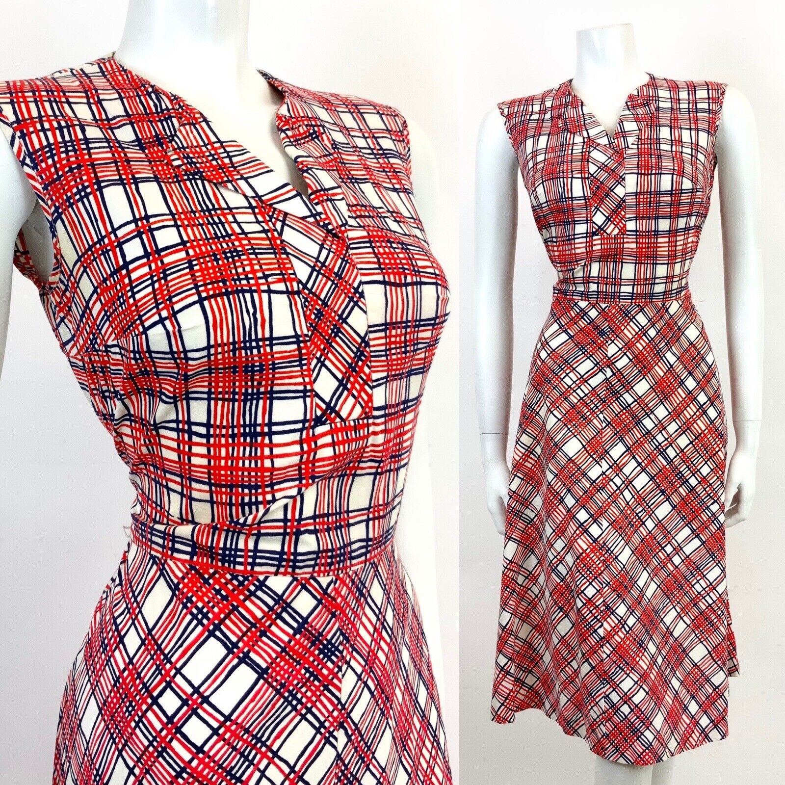 VINTAGE 60s 70s WHITE RED BLUE CHCKED PLAID MOD SLEEVELESS SHIRT DRESS 12 14