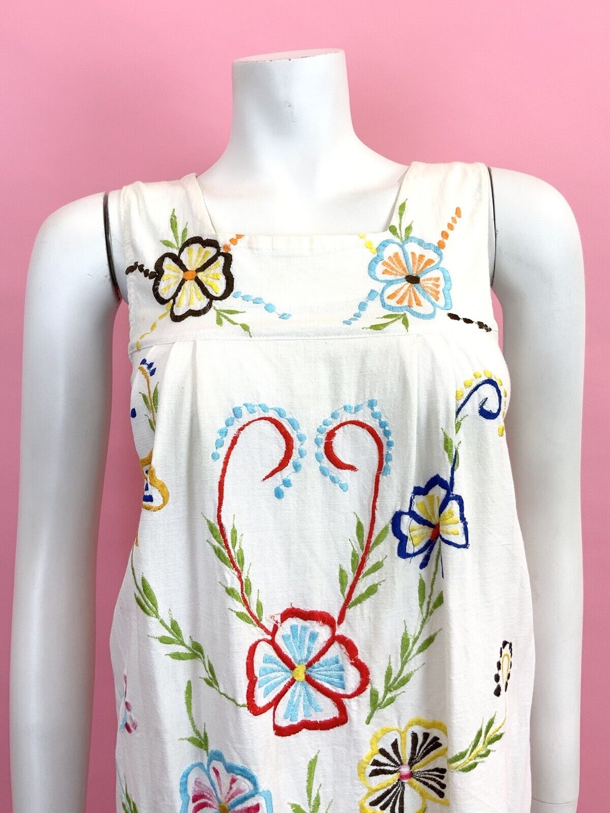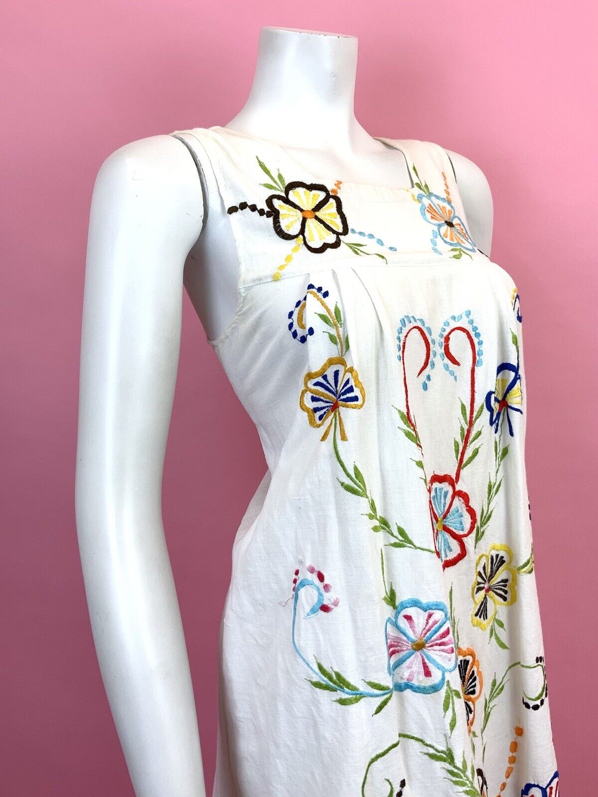 VINTAGE 60s 70s WHITE RED BLUE YELLOW FLORAL EMBROIDERED BOHO YOKE DRESS 8 10