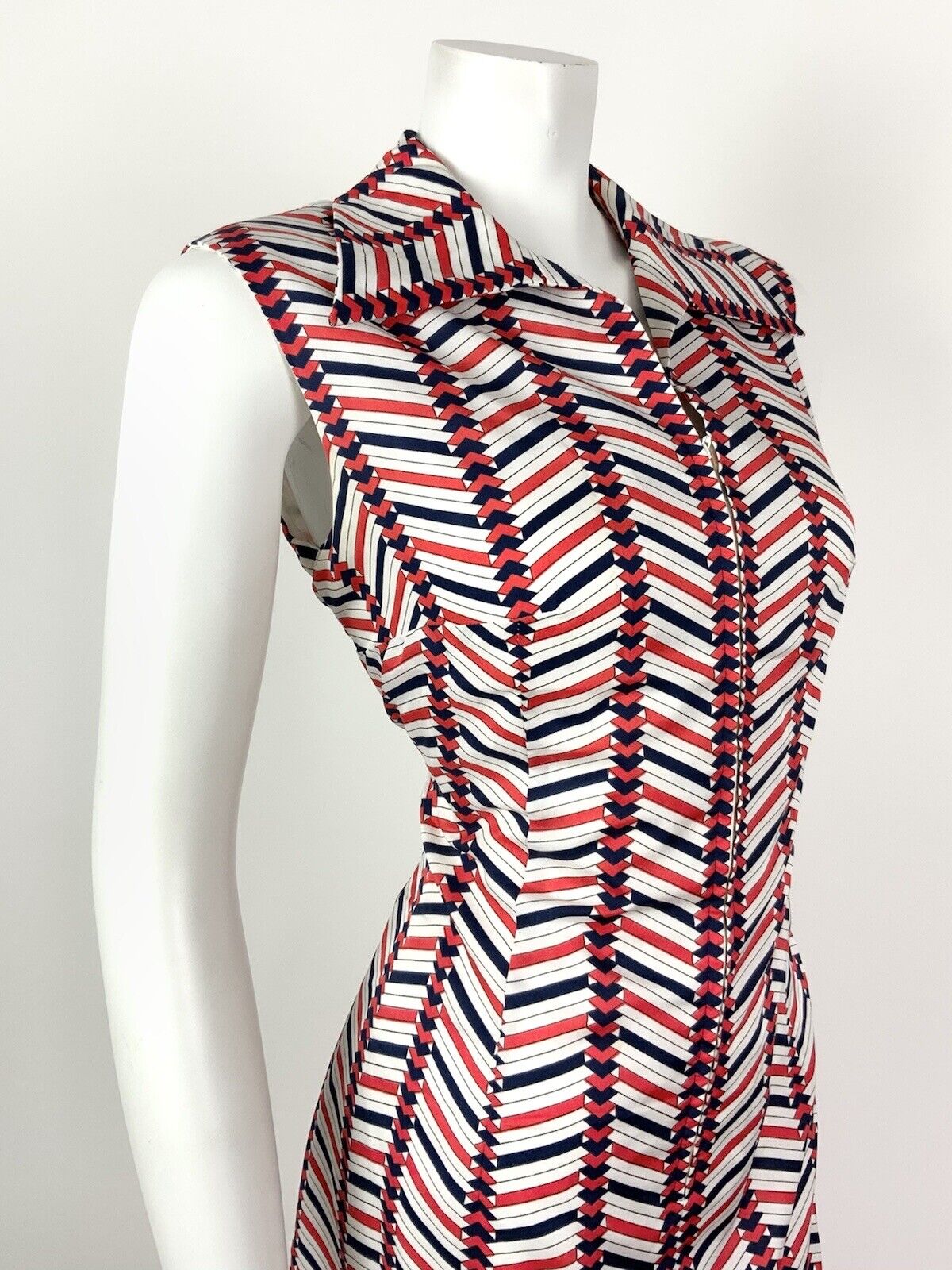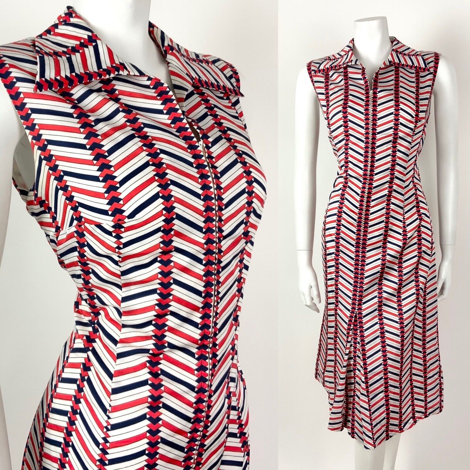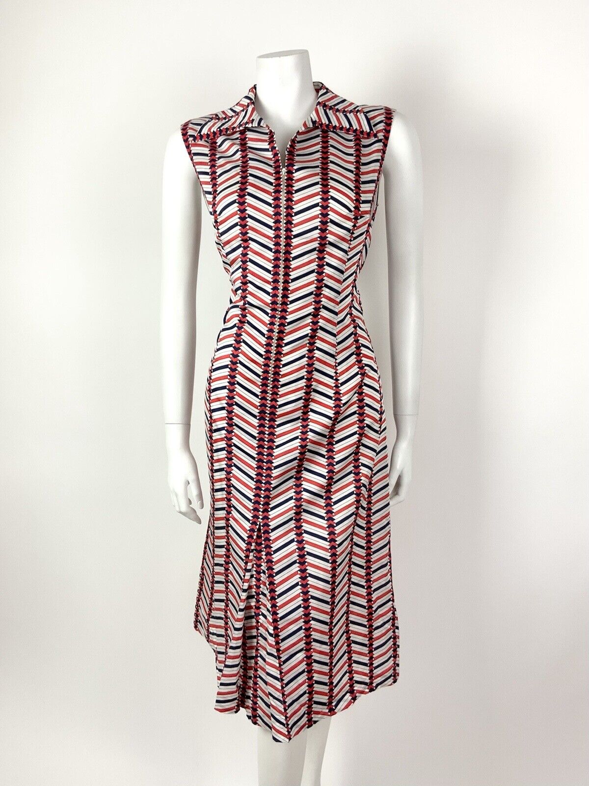 VINTAGE 60s 70s WHITE RED BLUE ZIG-ZAG GEOMETRIC DAGGER SHIRT MOD DRESS 12 14