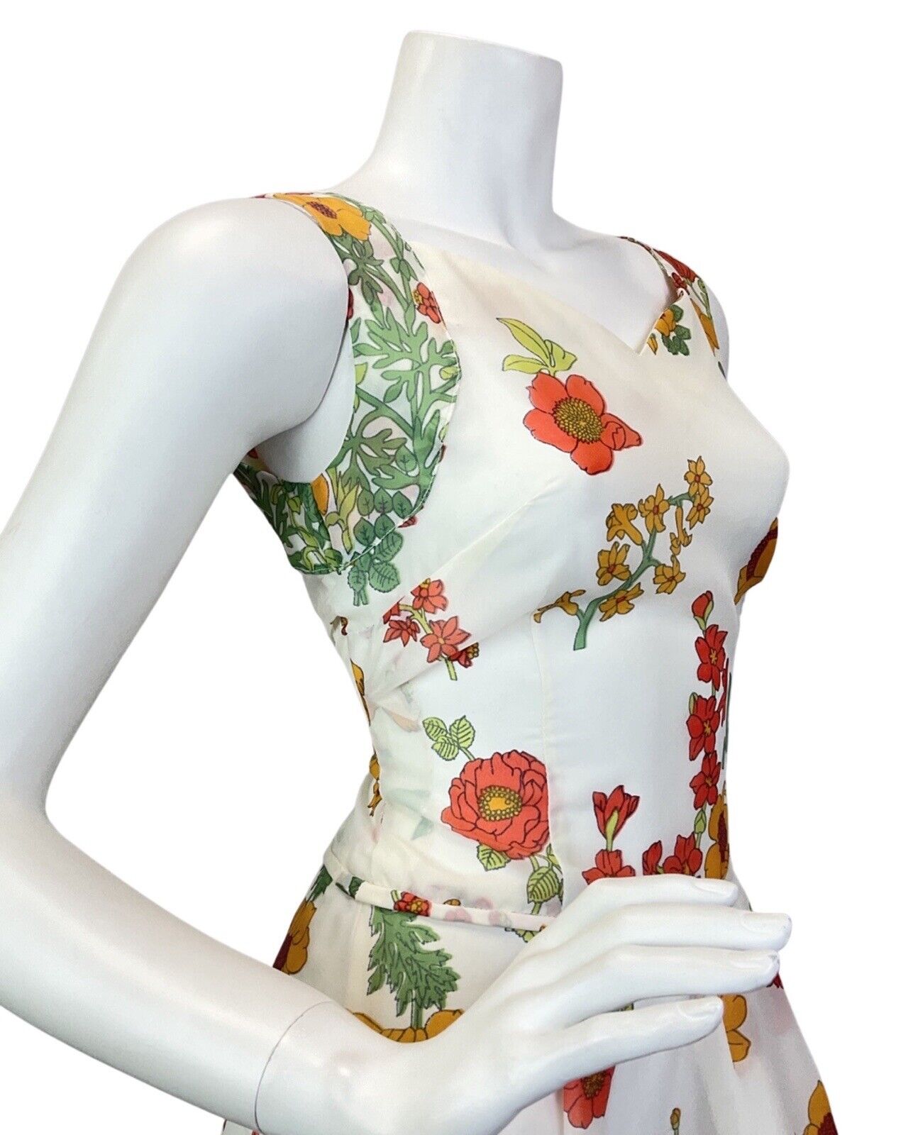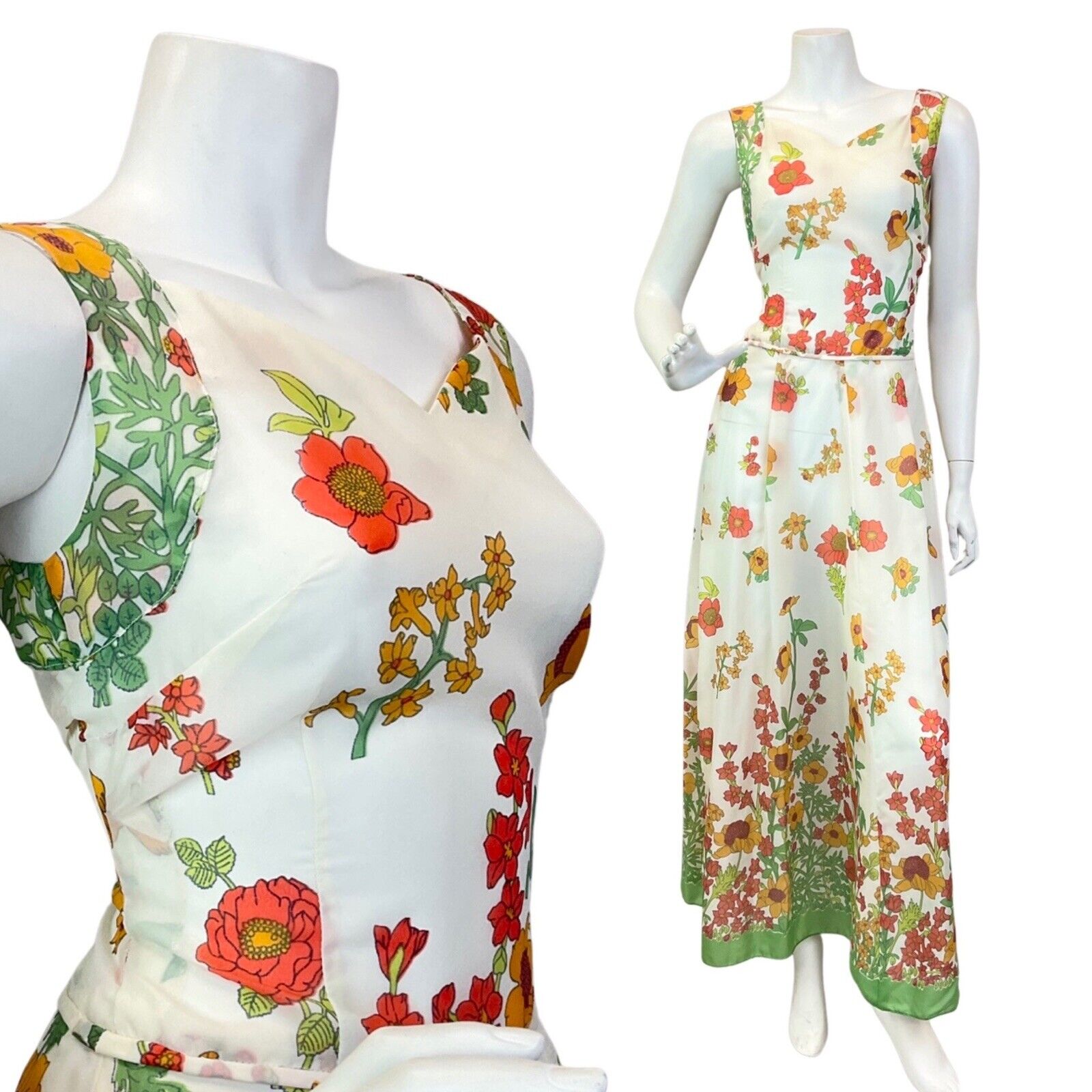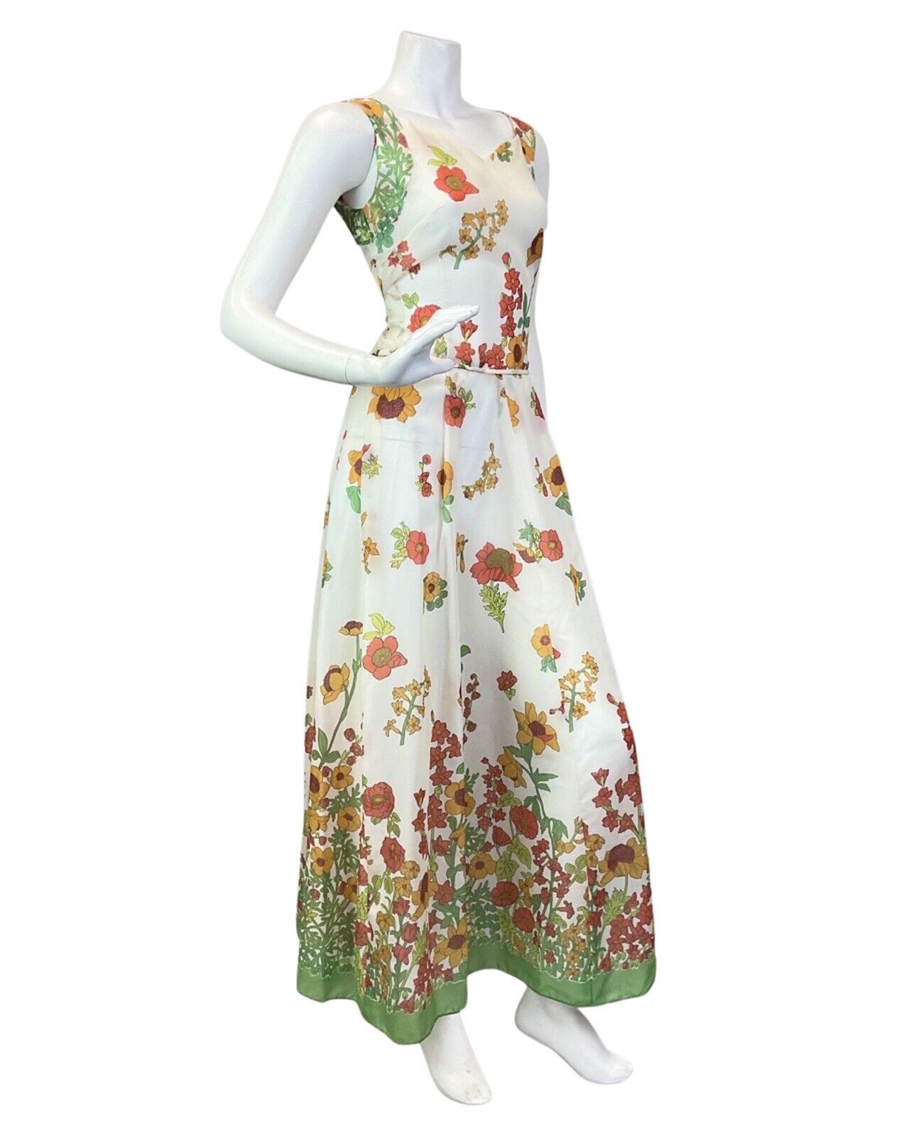 VINTAGE 60s 70s WHITE RED GREEN FLORAL GARDEN SLEEVELESS MAXI DRESS 8