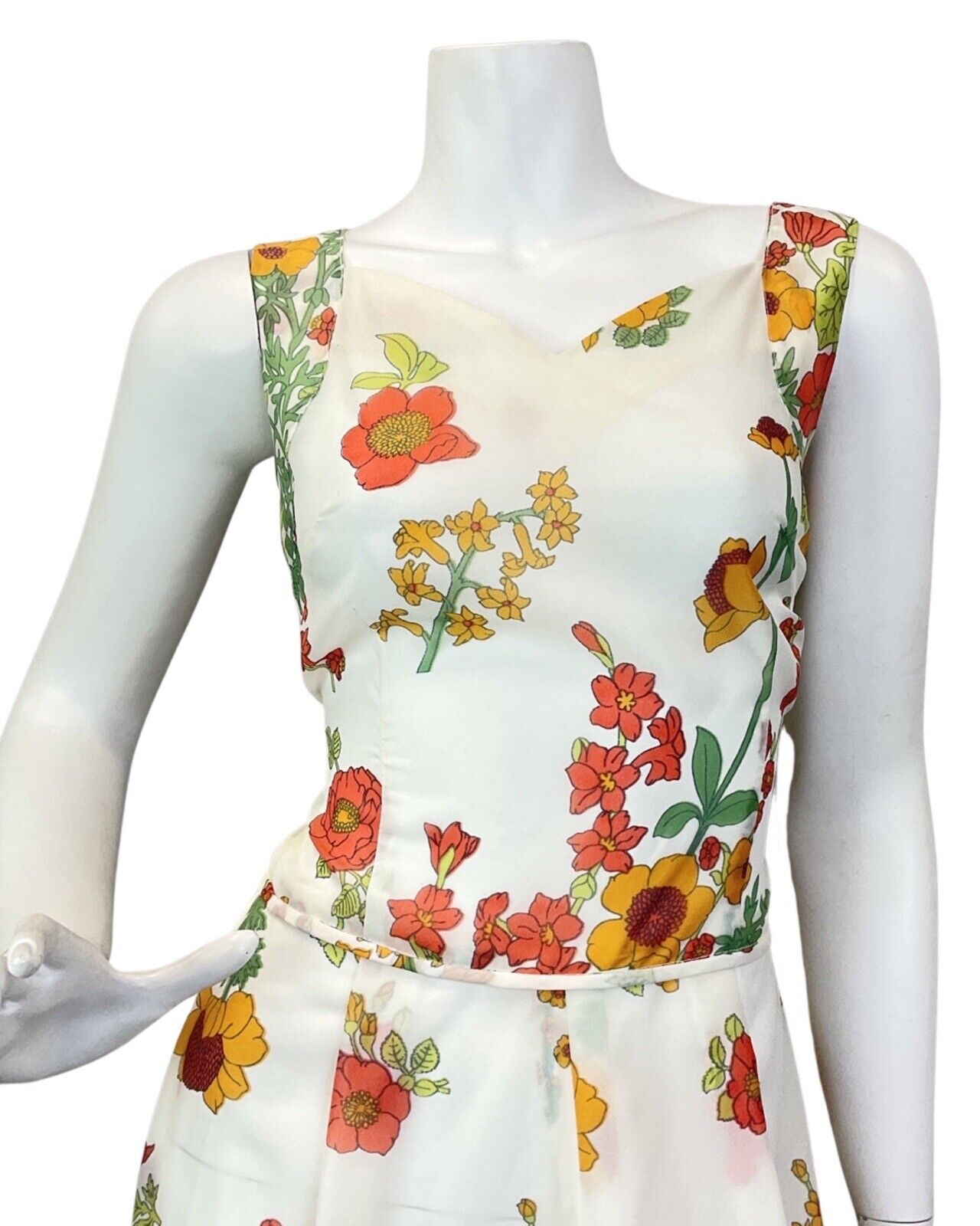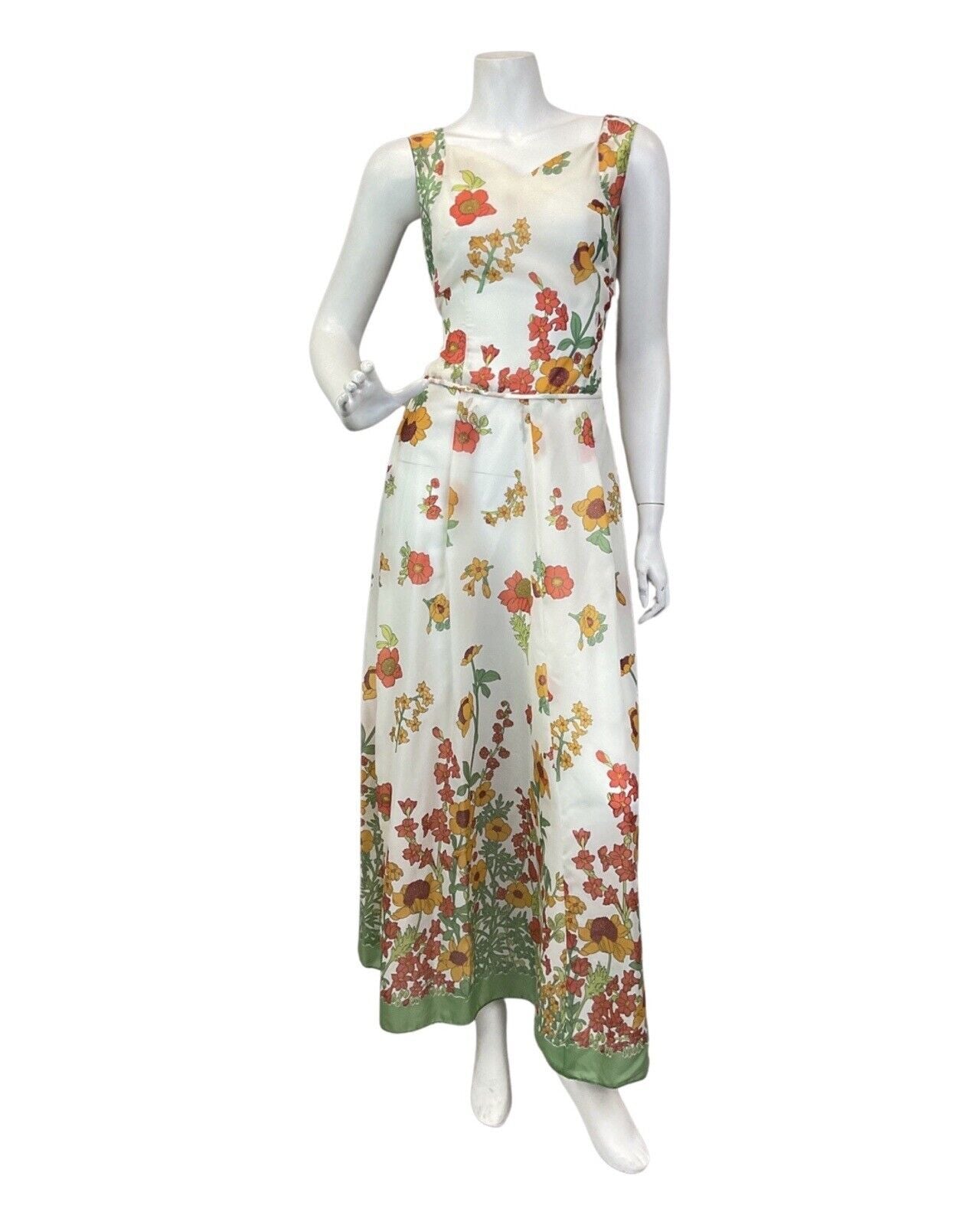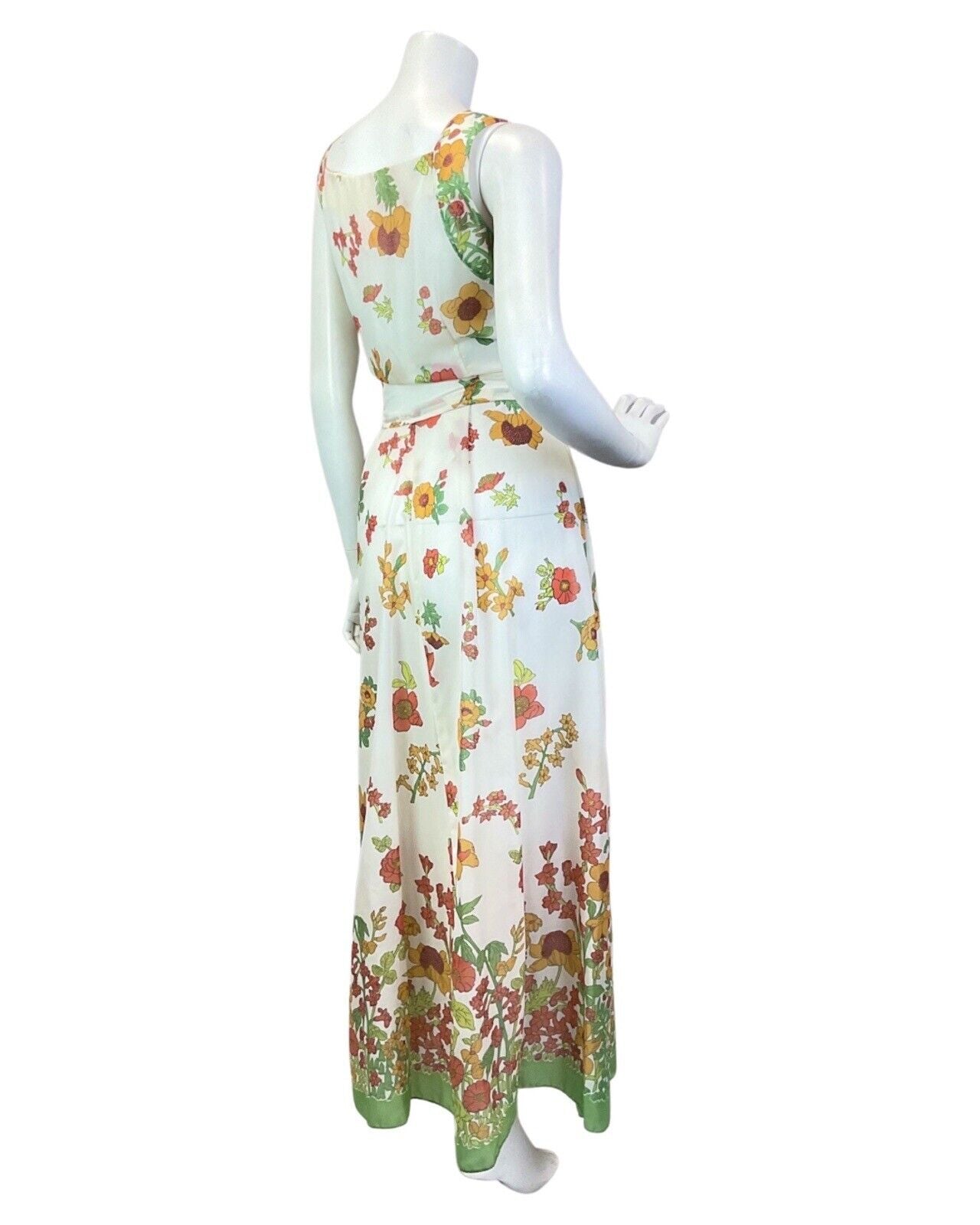 VINTAGE 60s 70s WHITE RED GREEN FLORAL GARDEN SLEEVELESS MAXI DRESS 8