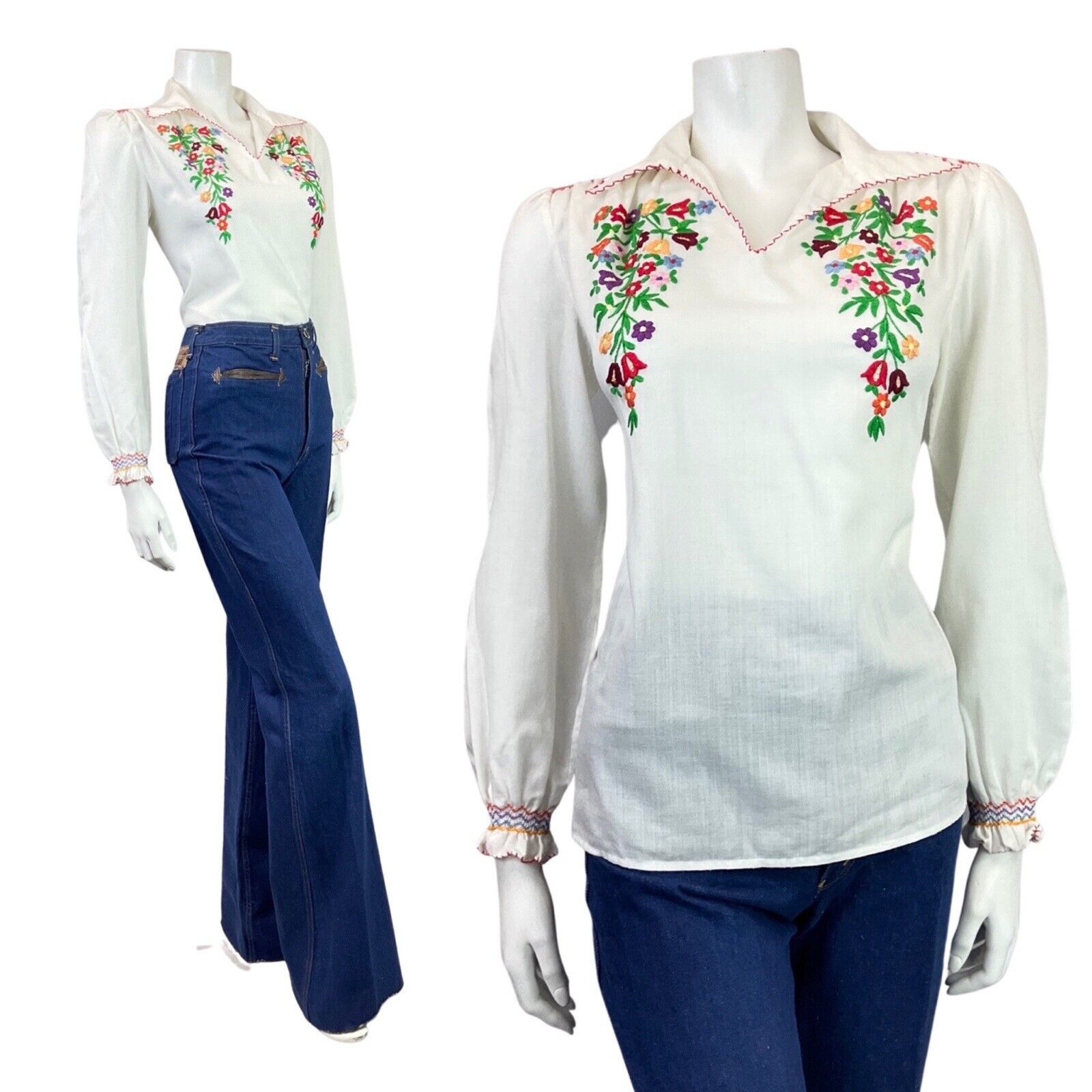 VINTAGE 60s 70s WHITE RED GREEN FLORAL VINE WING COLLAR BOHO BLOUSE 10 12