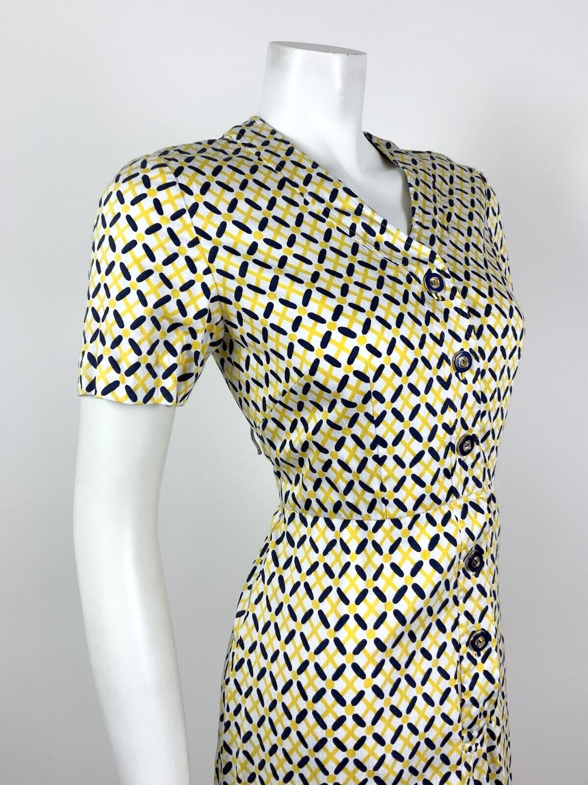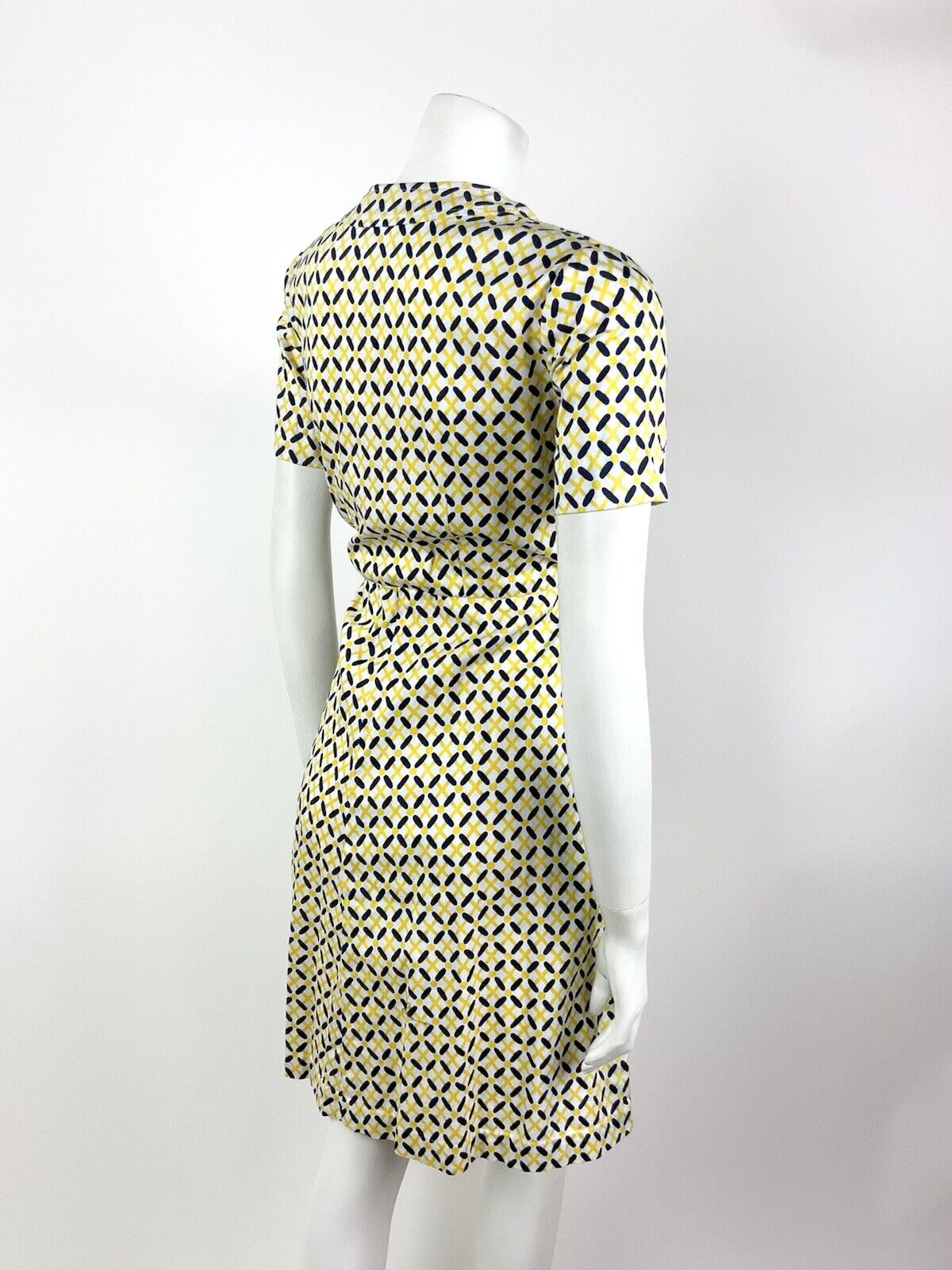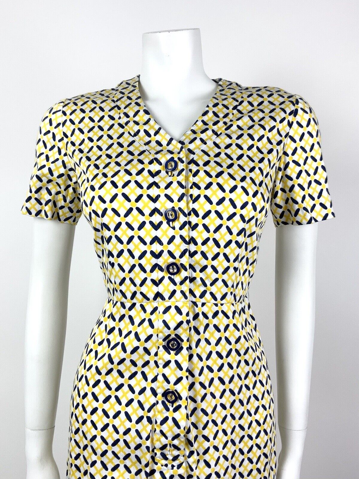 VINTAGE 60s 70s WHITE YELLOW NAVY BLUE CHECKED GEOMETRIC MOD DRESS 10