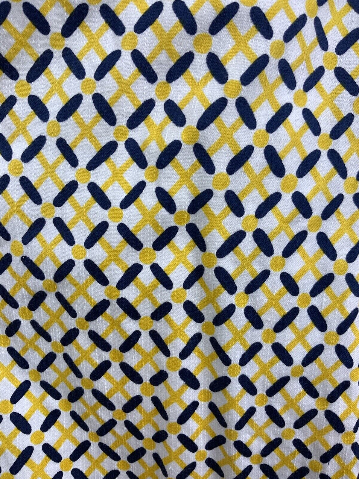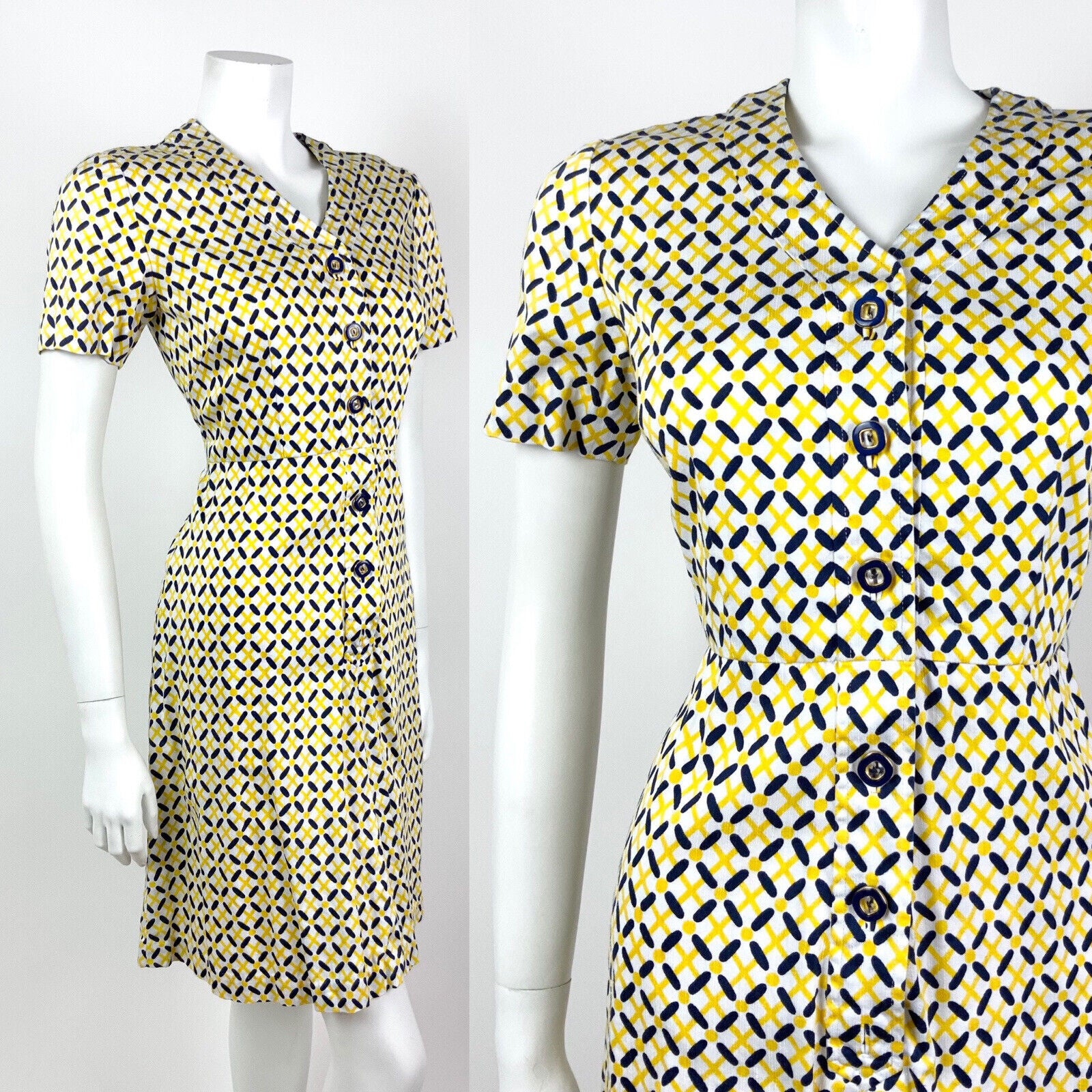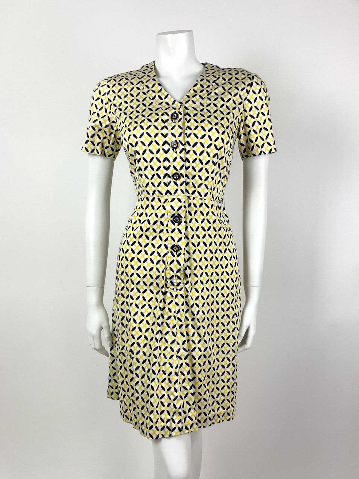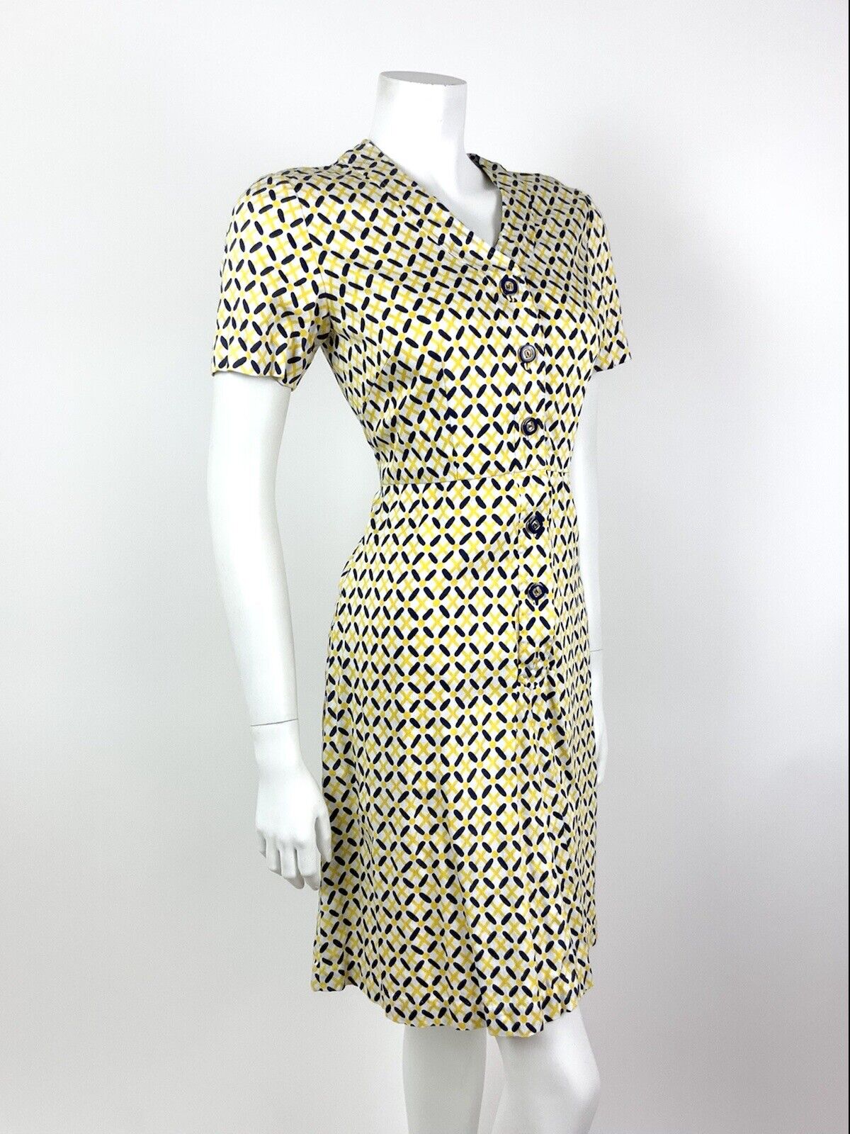 VINTAGE 60s 70s WHITE YELLOW NAVY BLUE CHECKED GEOMETRIC MOD DRESS 10