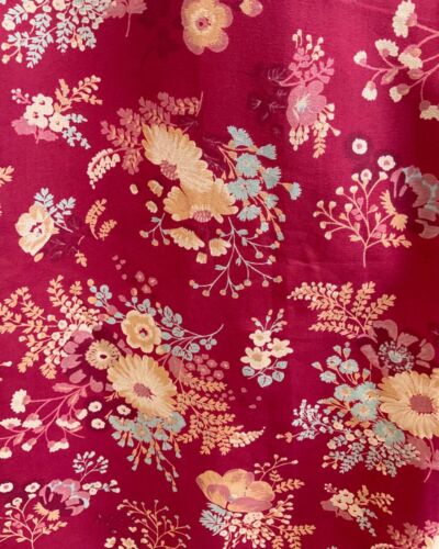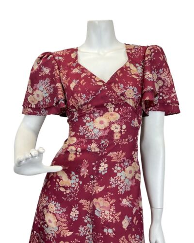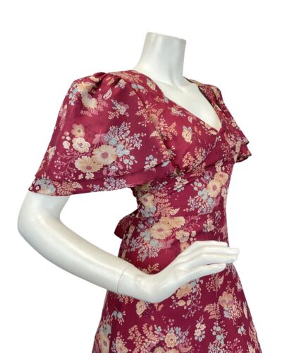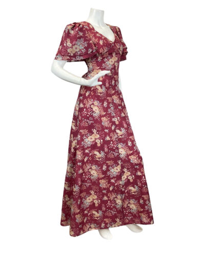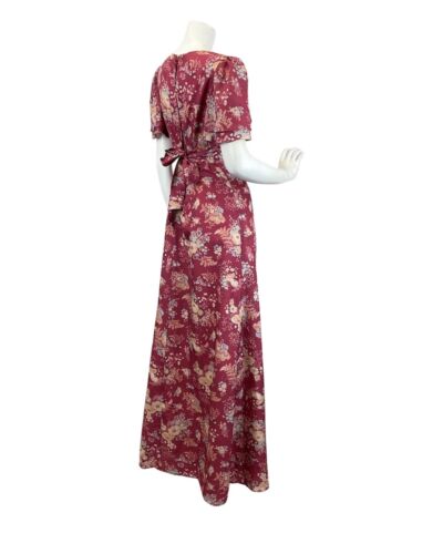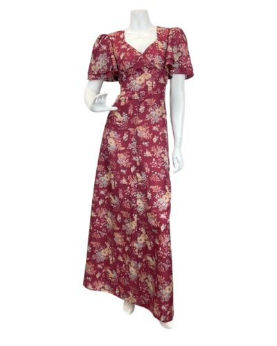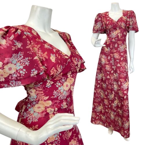 VINTAGE 60s 70s WINE RED CREAM BLUE FLORAL BOUQUET FLOATY MAXI DRESS 10