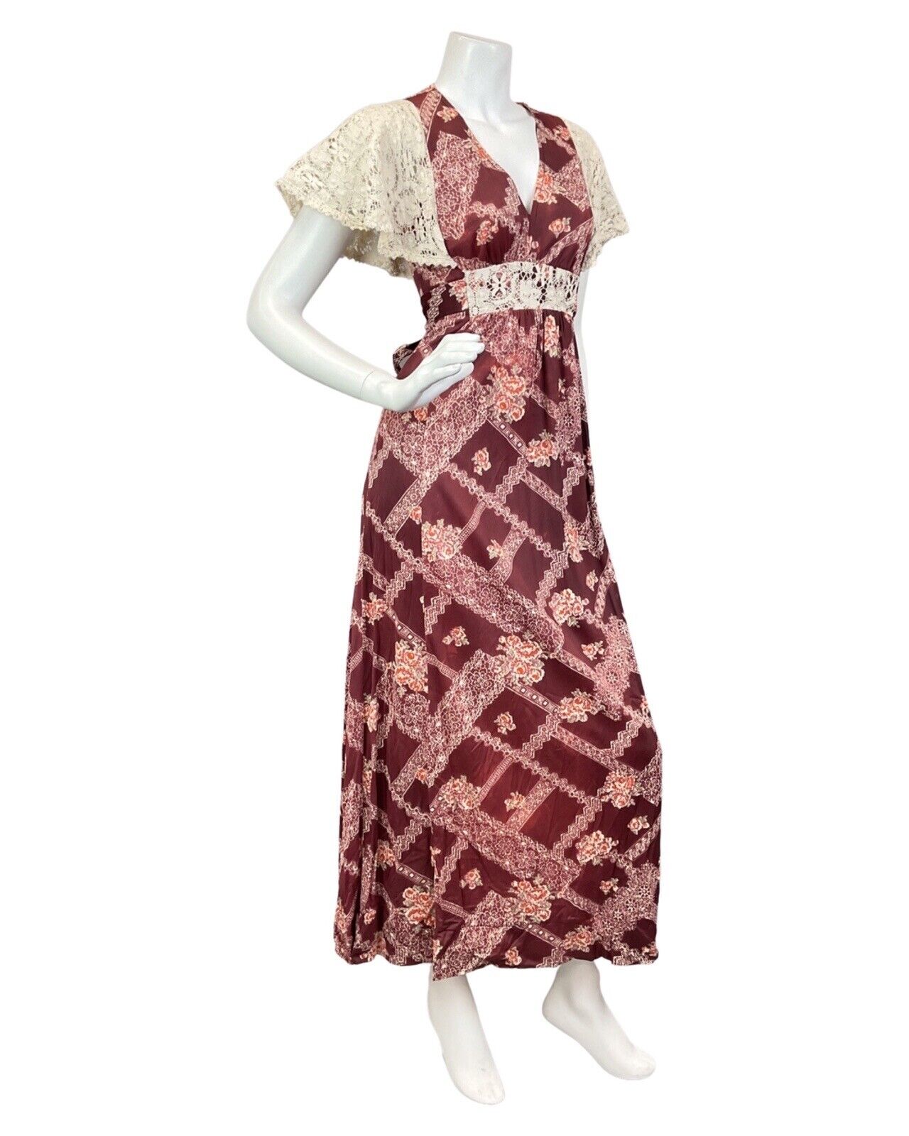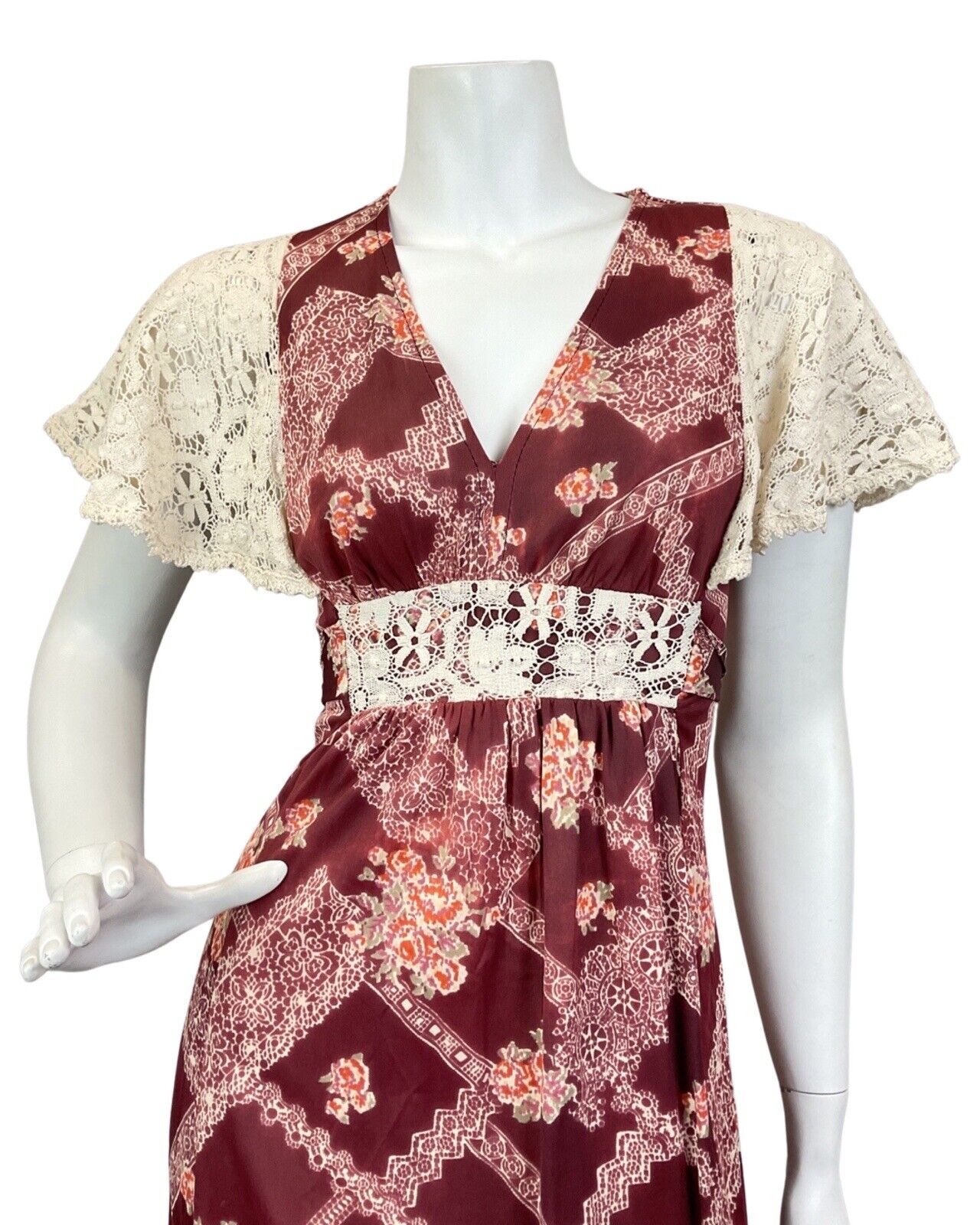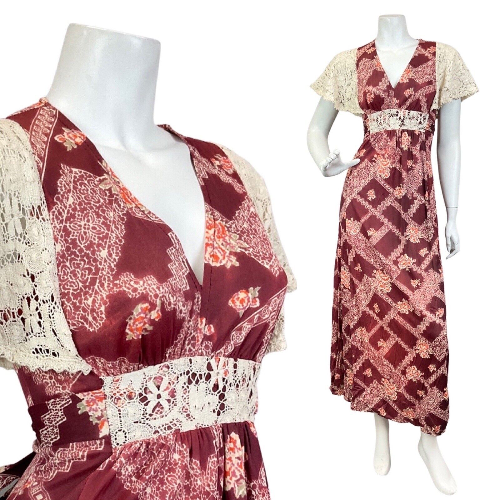 VINTAGE 60s 70s WINE RED CREAM CROCHETED FLORAL MANDALA BOHO MAXI DRESS 8
