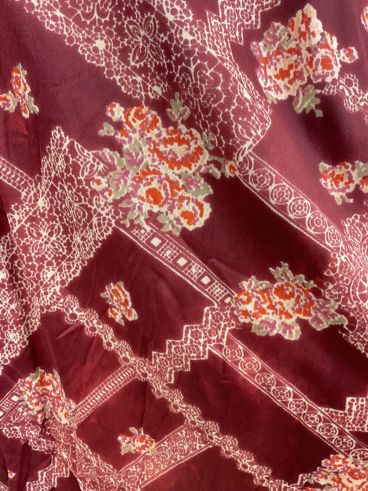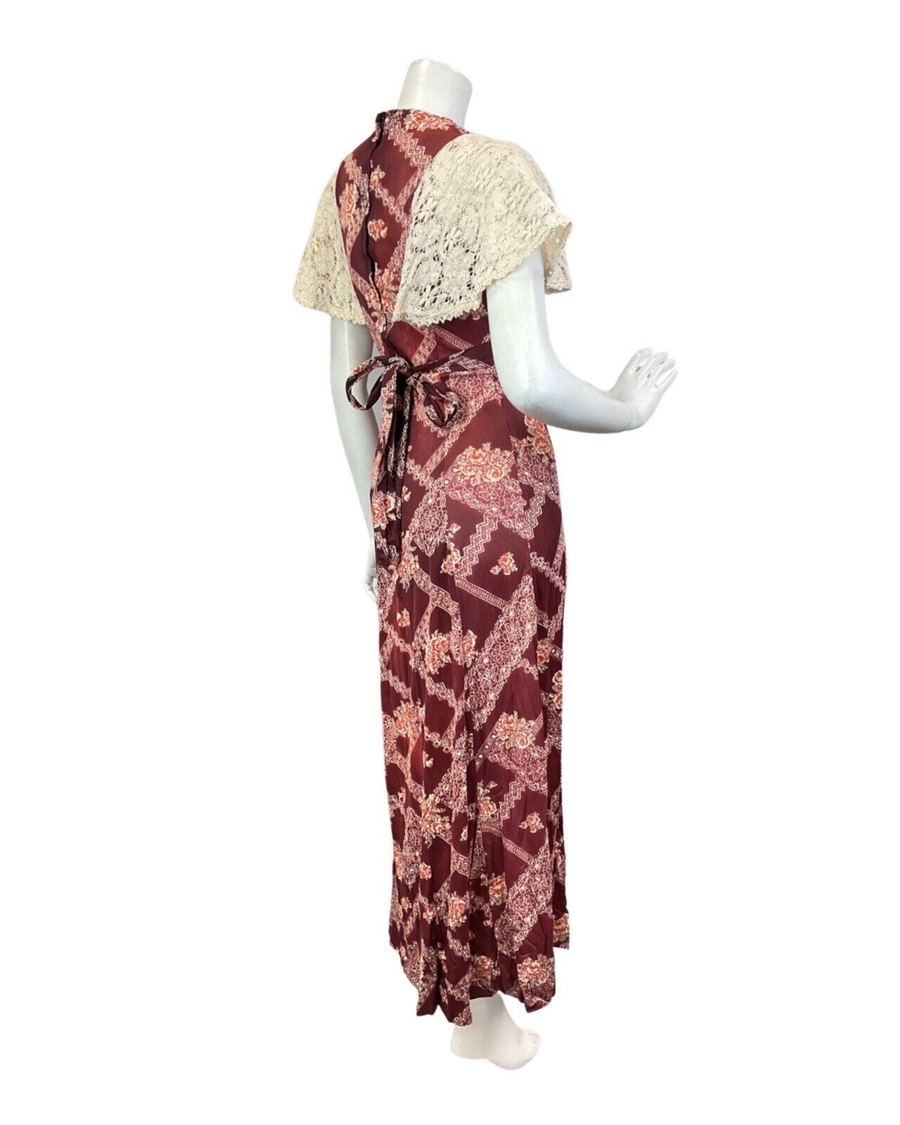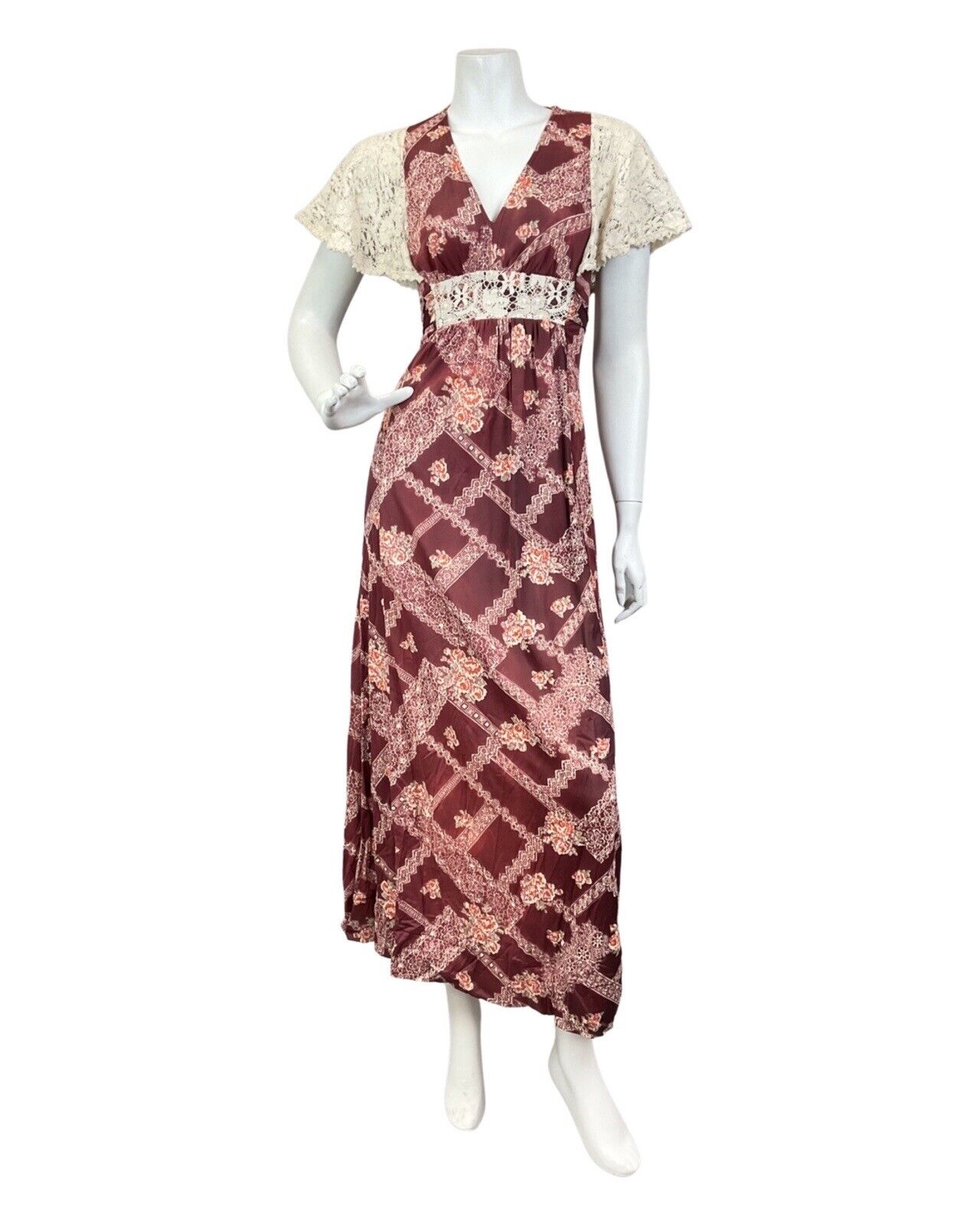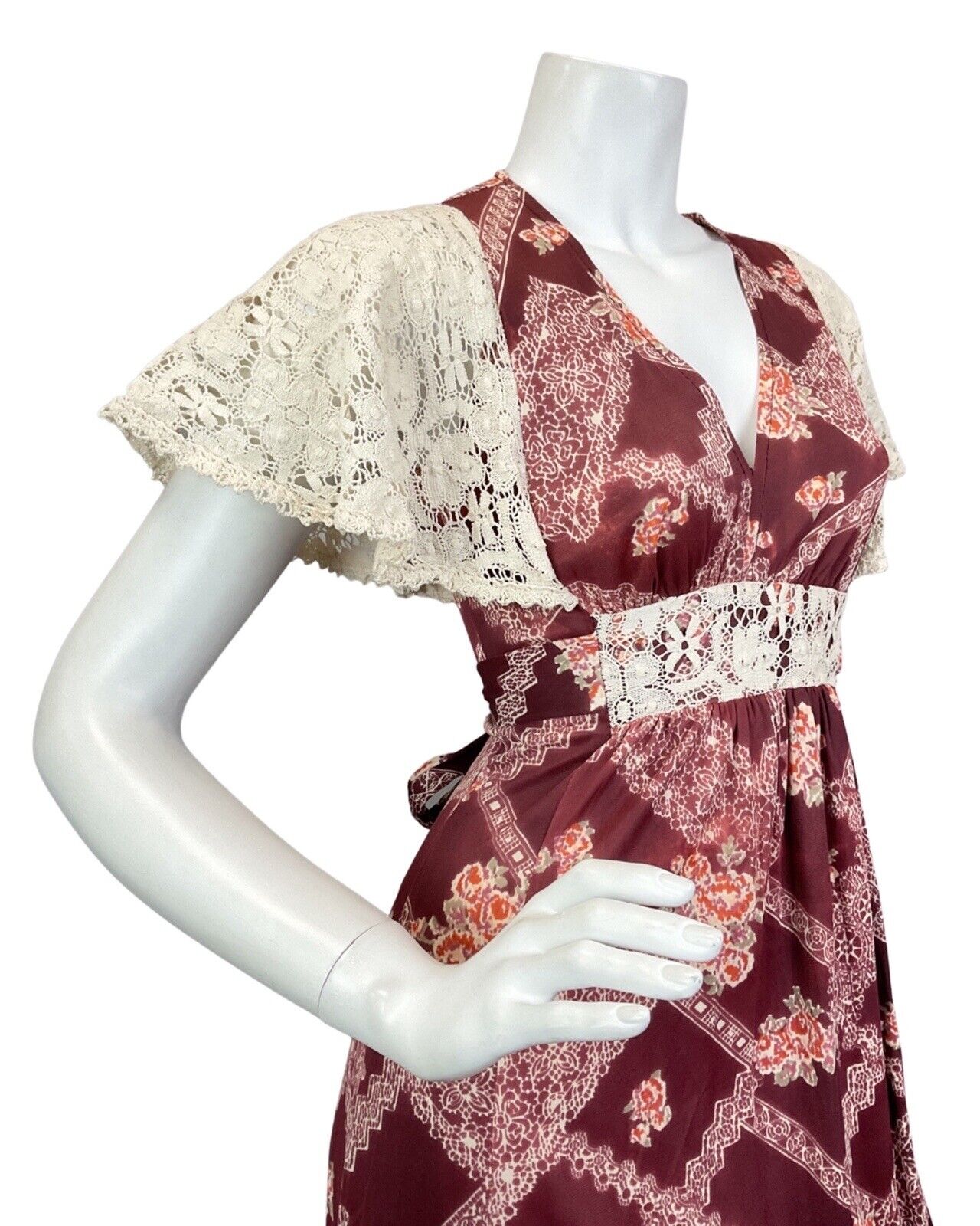 VINTAGE 60s 70s WINE RED CREAM CROCHETED FLORAL MANDALA BOHO MAXI DRESS 8