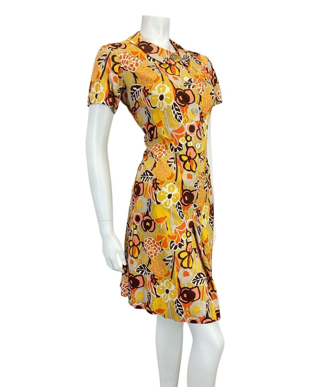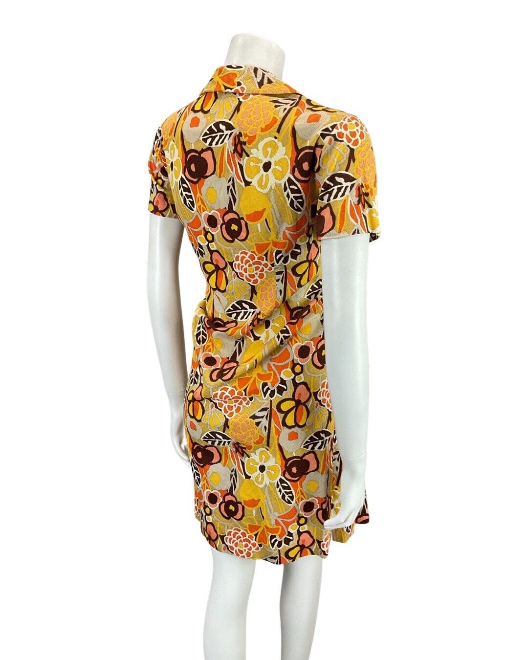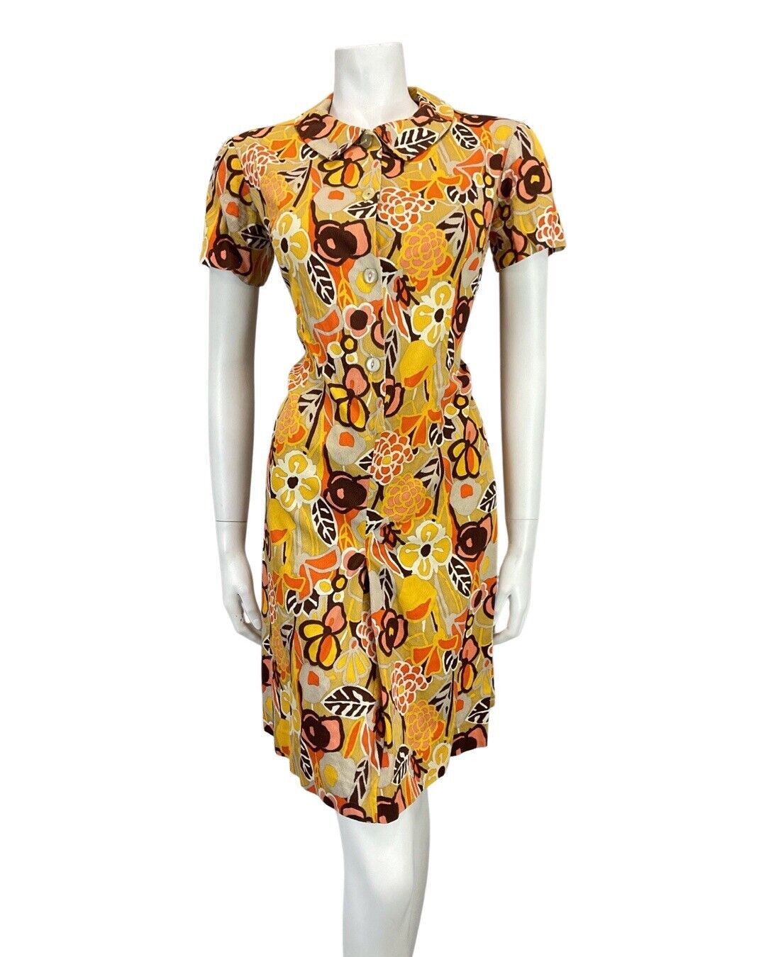 VINTAGE 60s 70s YELLOW BEIGE ORANGE FLORAL MOD PETER PAN SHIRT DRESS 12 14