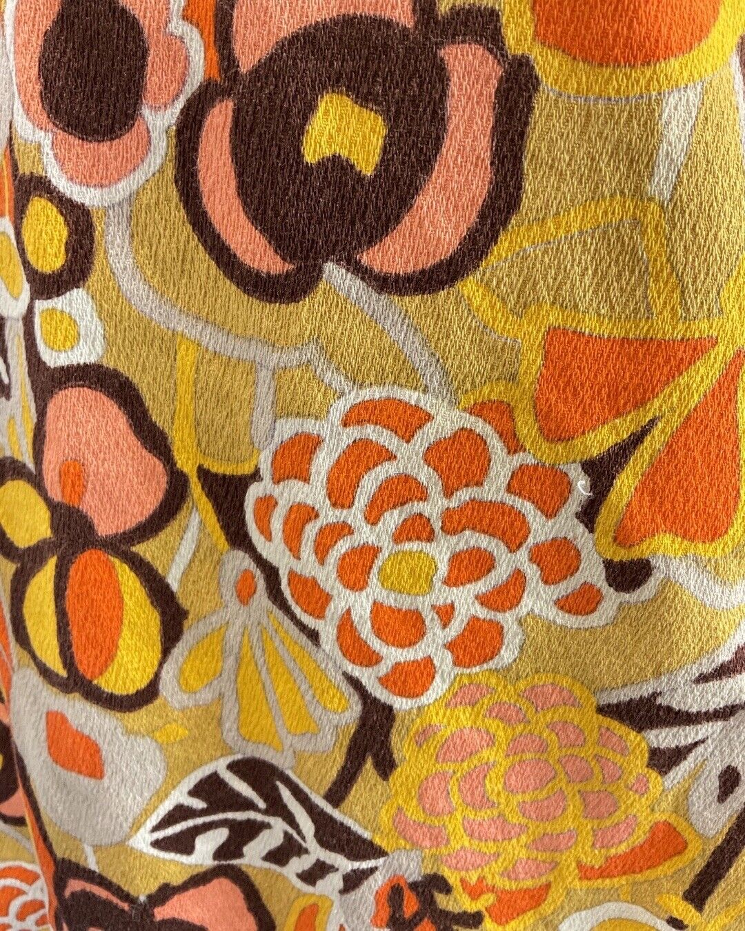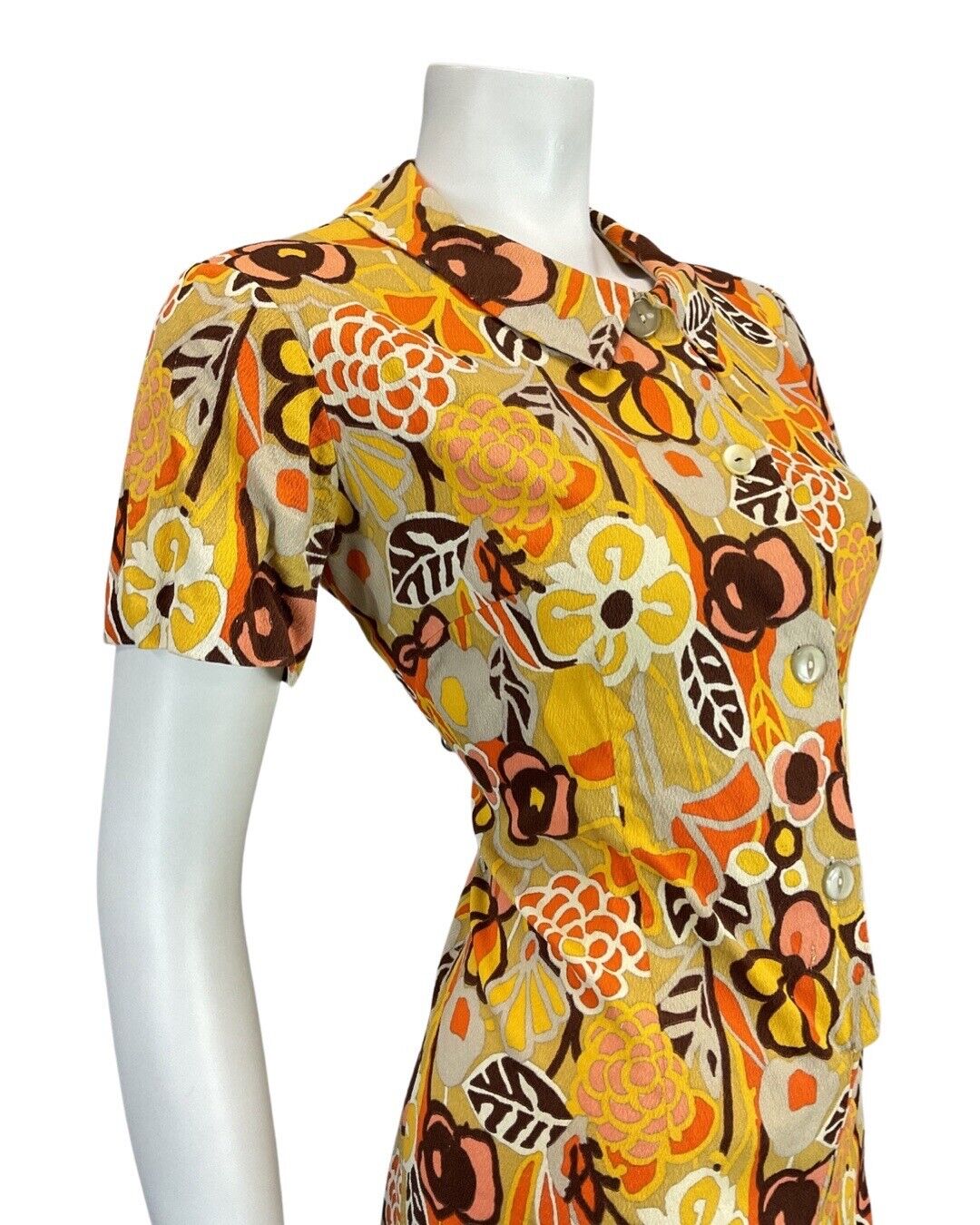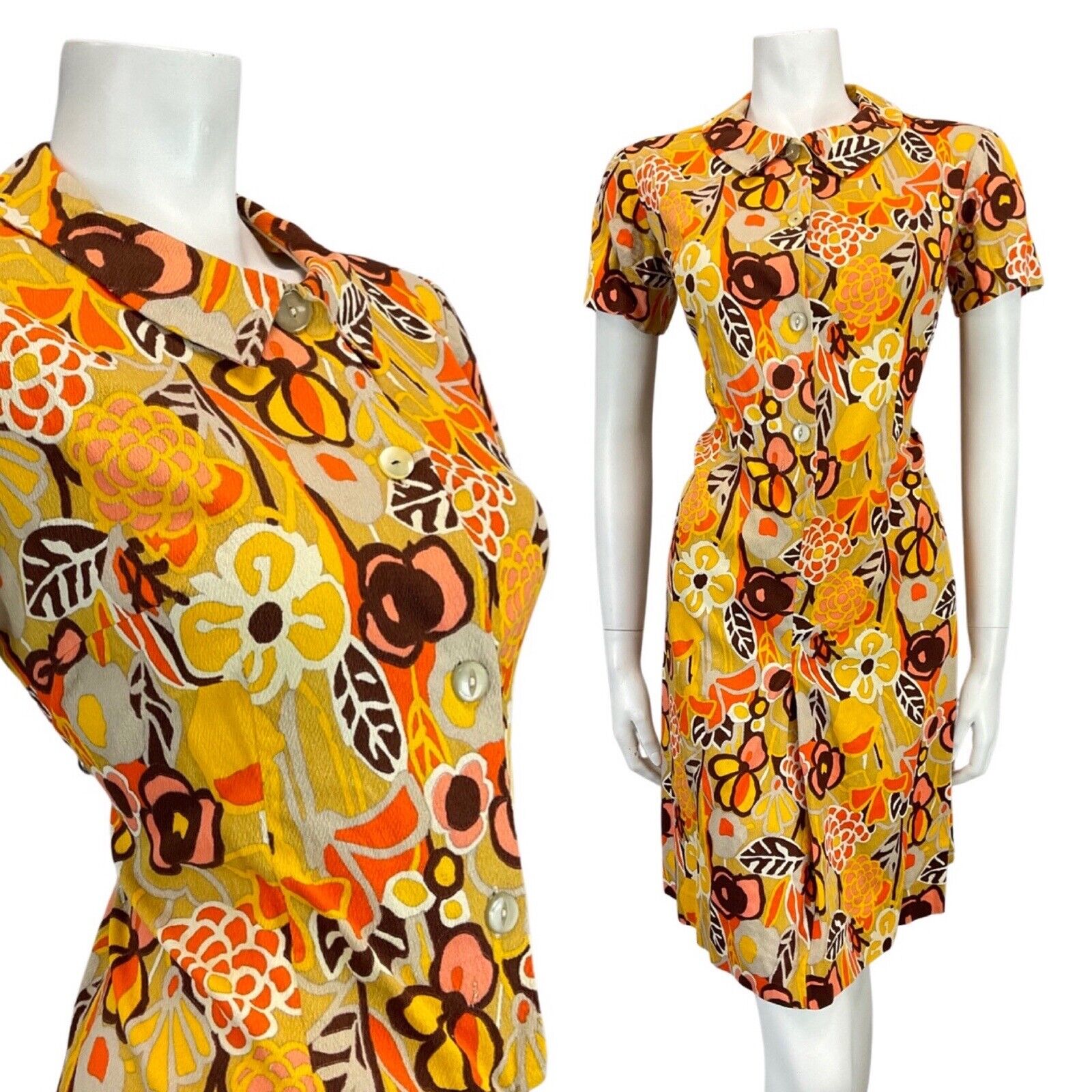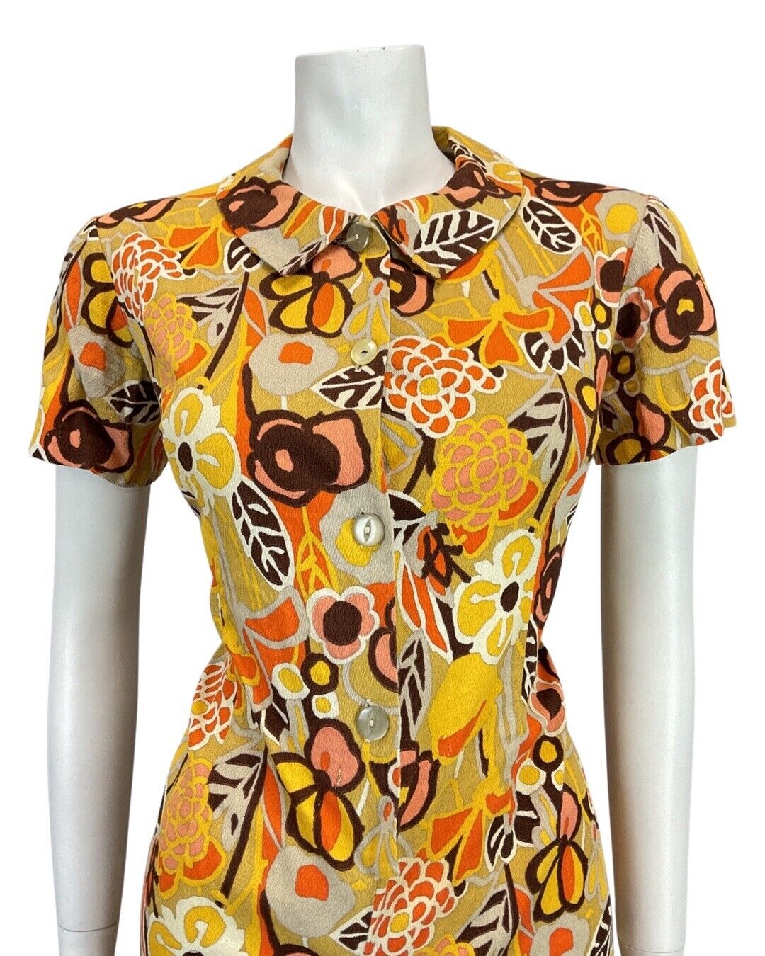 VINTAGE 60s 70s YELLOW BEIGE ORANGE FLORAL MOD PETER PAN SHIRT DRESS 12 14