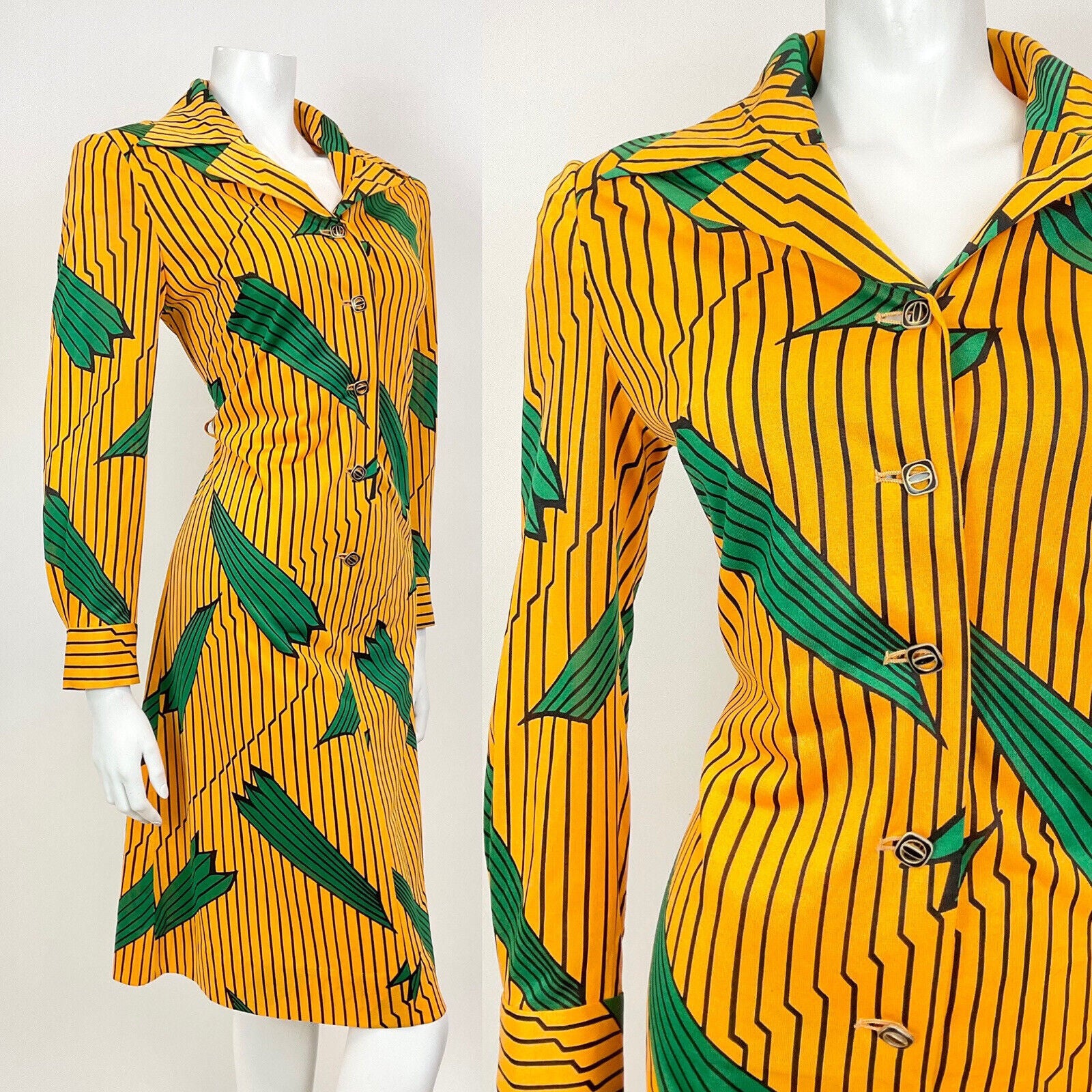VINTAGE 60s 70s YELLOW BLACK GREEN STRIPED LEAFY MOD DAGGER SHIRT DRESS 10 12