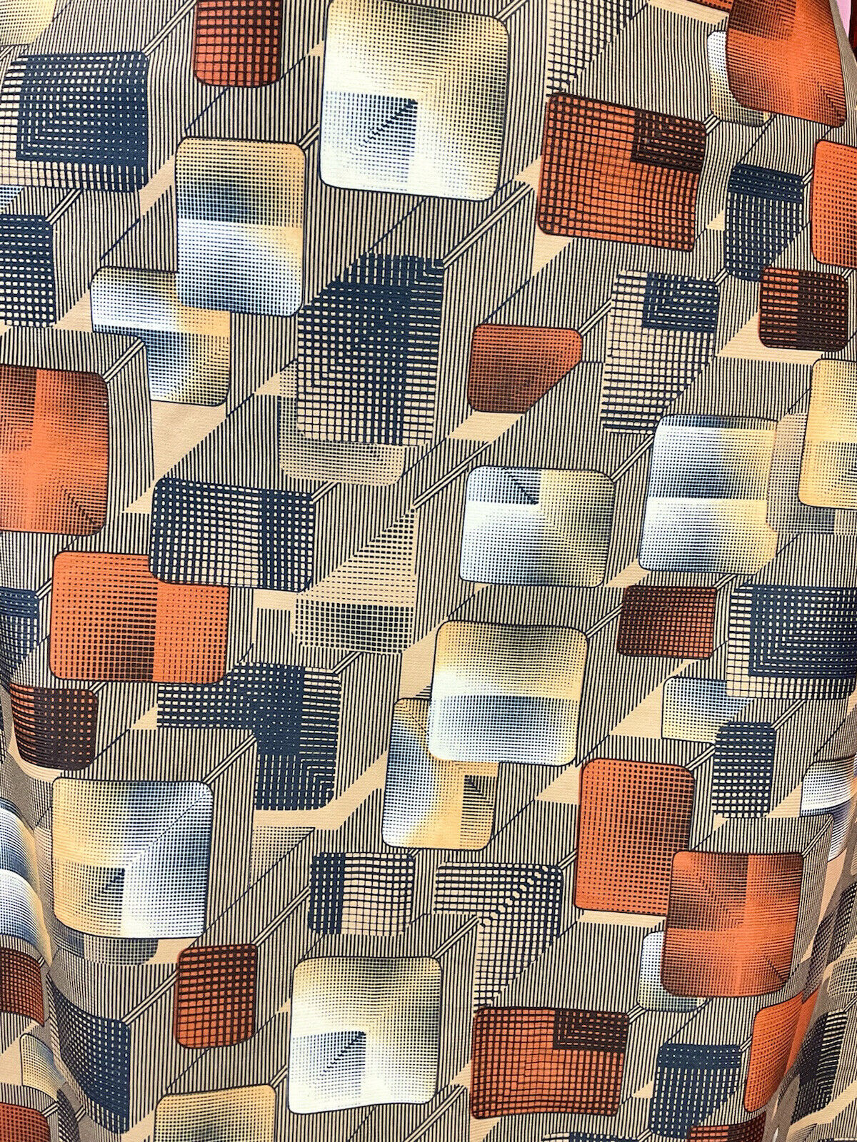Covering the dress is a busy geometric design of overlapping squares and grid patterns in shades of yellow, blue, black, and orange.