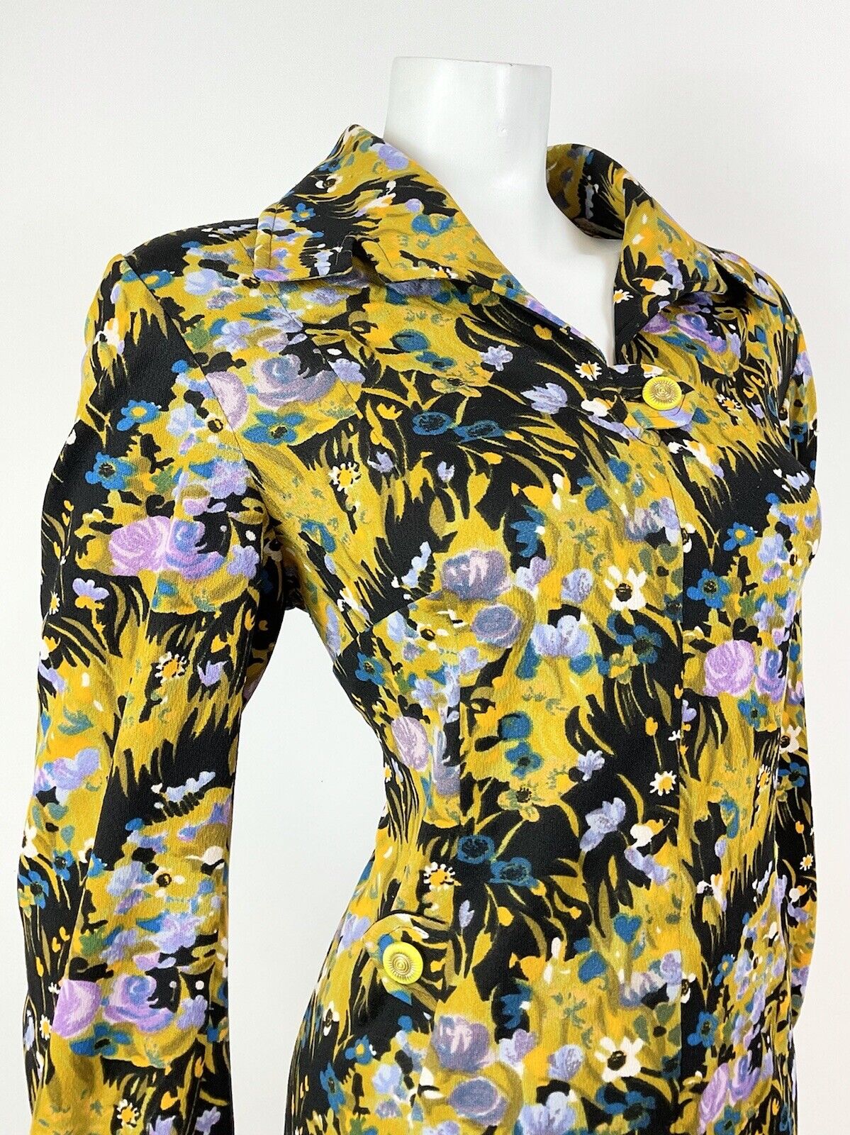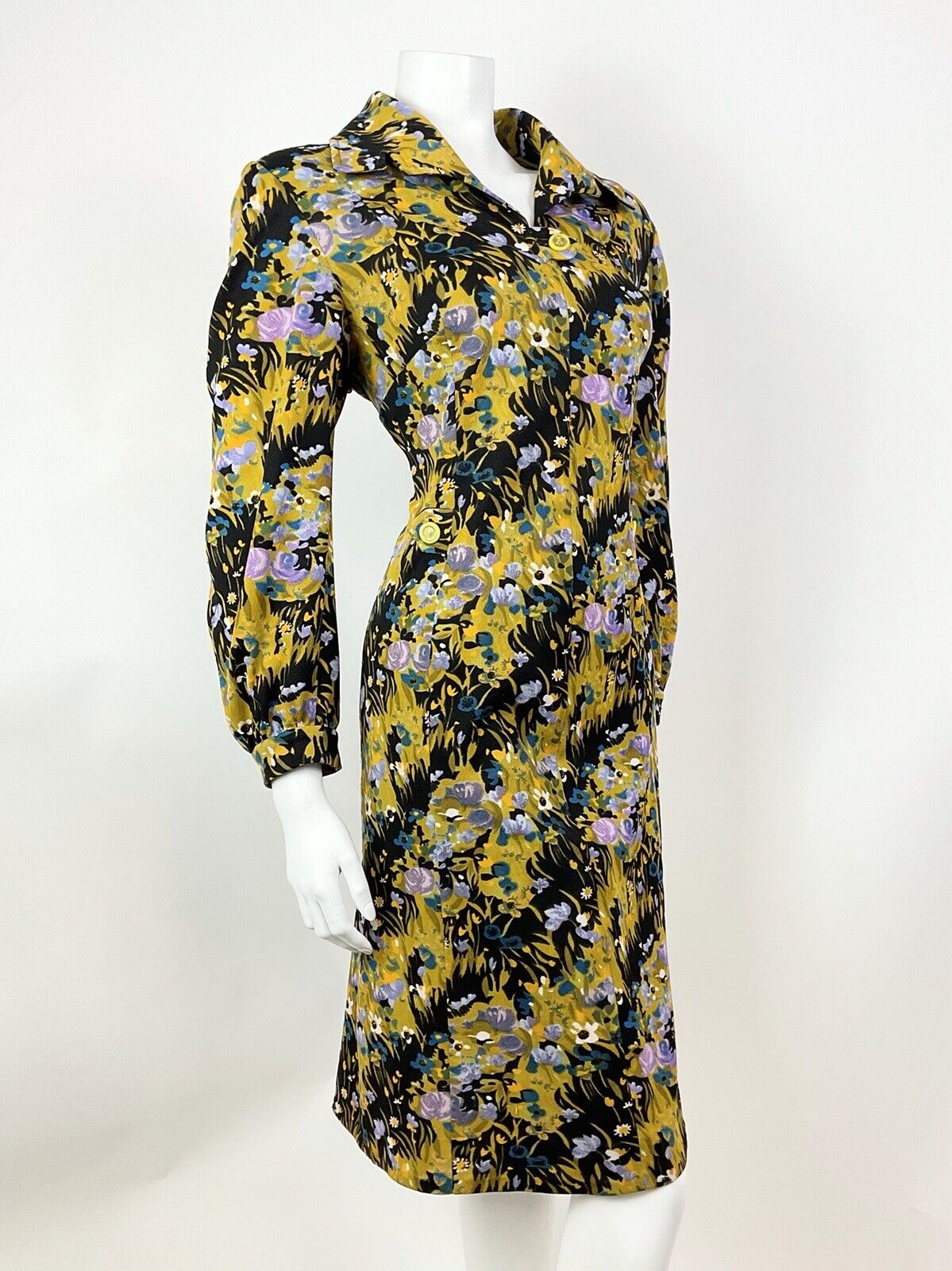 VINTAGE 60s 70s YELLOW BLUE GREEN BLACK PSYCHEDELIC FLORAL SHIRT DRESS 16 18