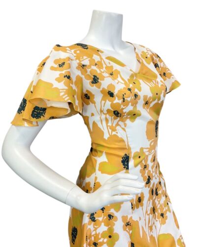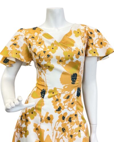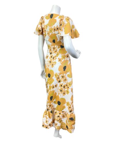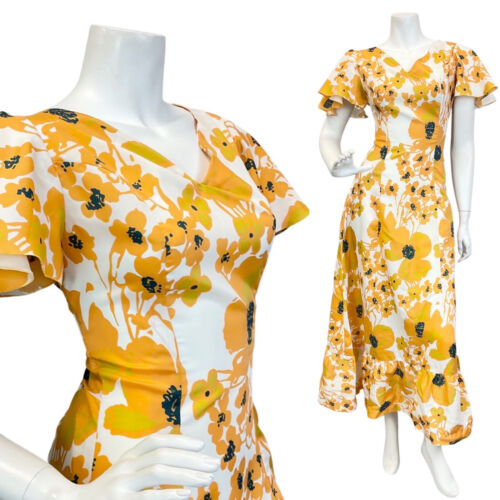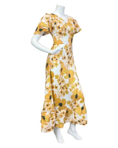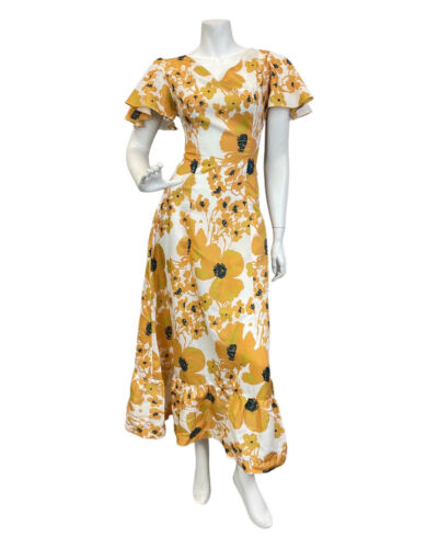 VINTAGE 60s 70s YELLOW GOLD WHITE FLORAL CAPE SLEEVE SUMMER MAXI DRESS 10