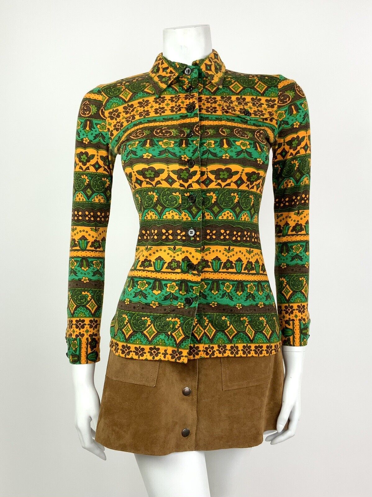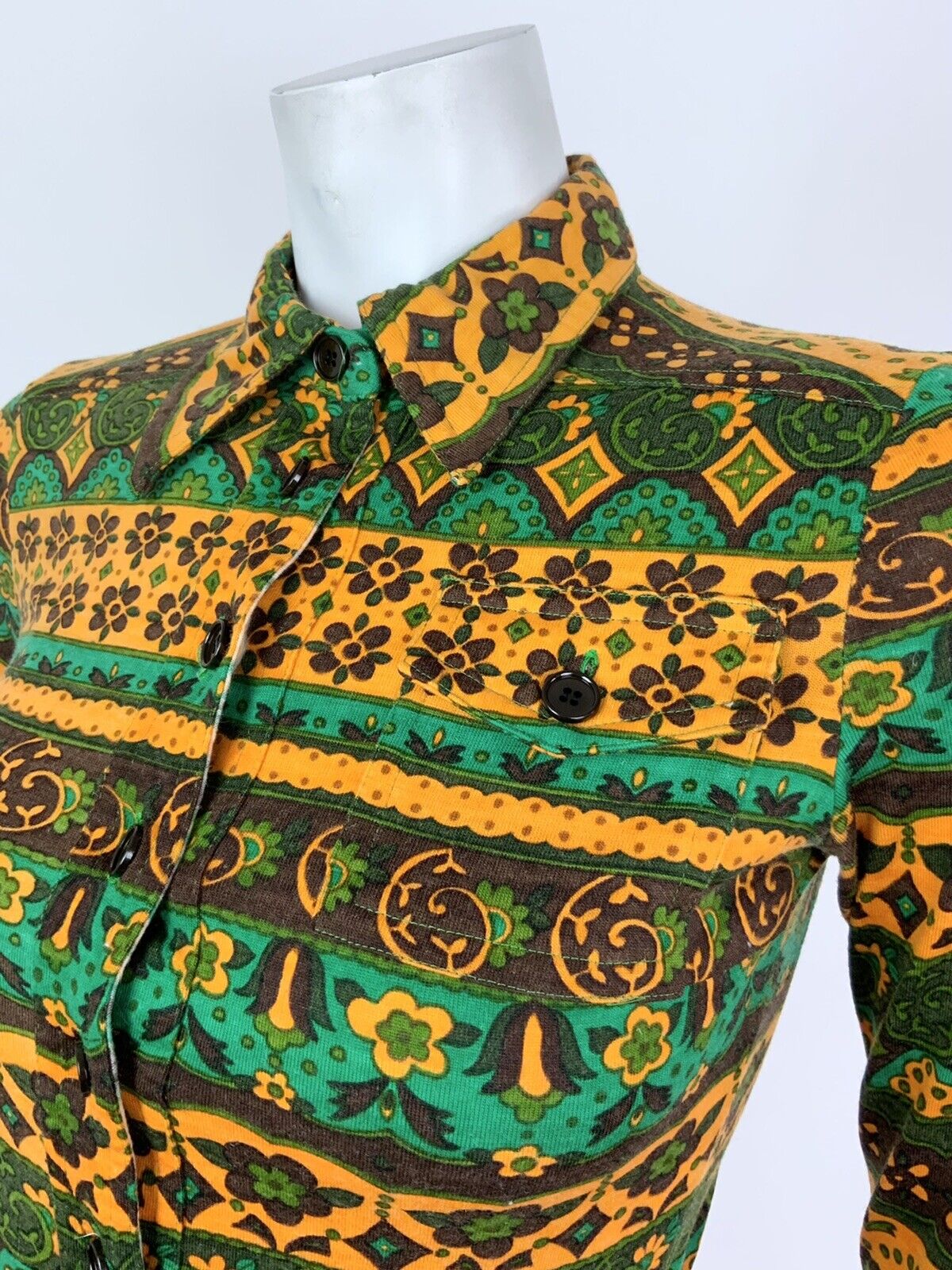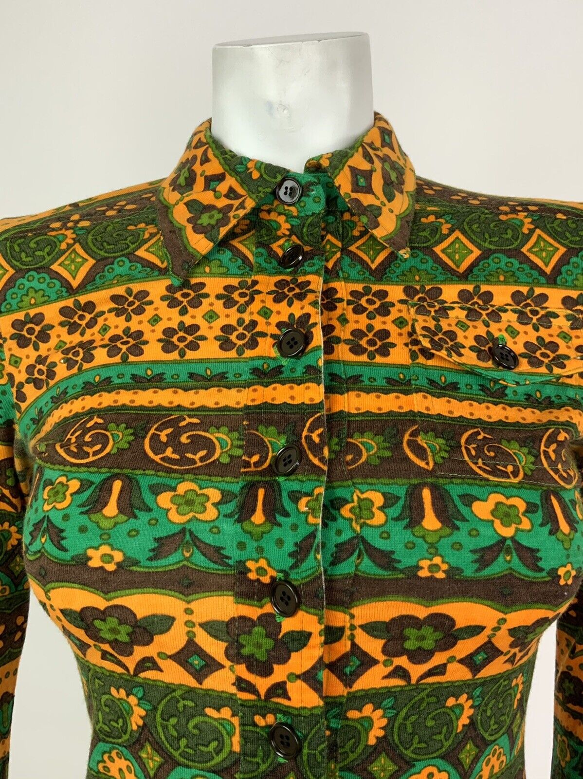 VINTAGE 60s 70s YELLOW GREEN BROWN FLORAL STRIPED PSYCHEDELIC DAGGER SHIRT 8