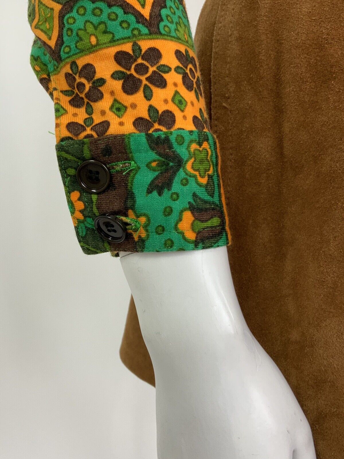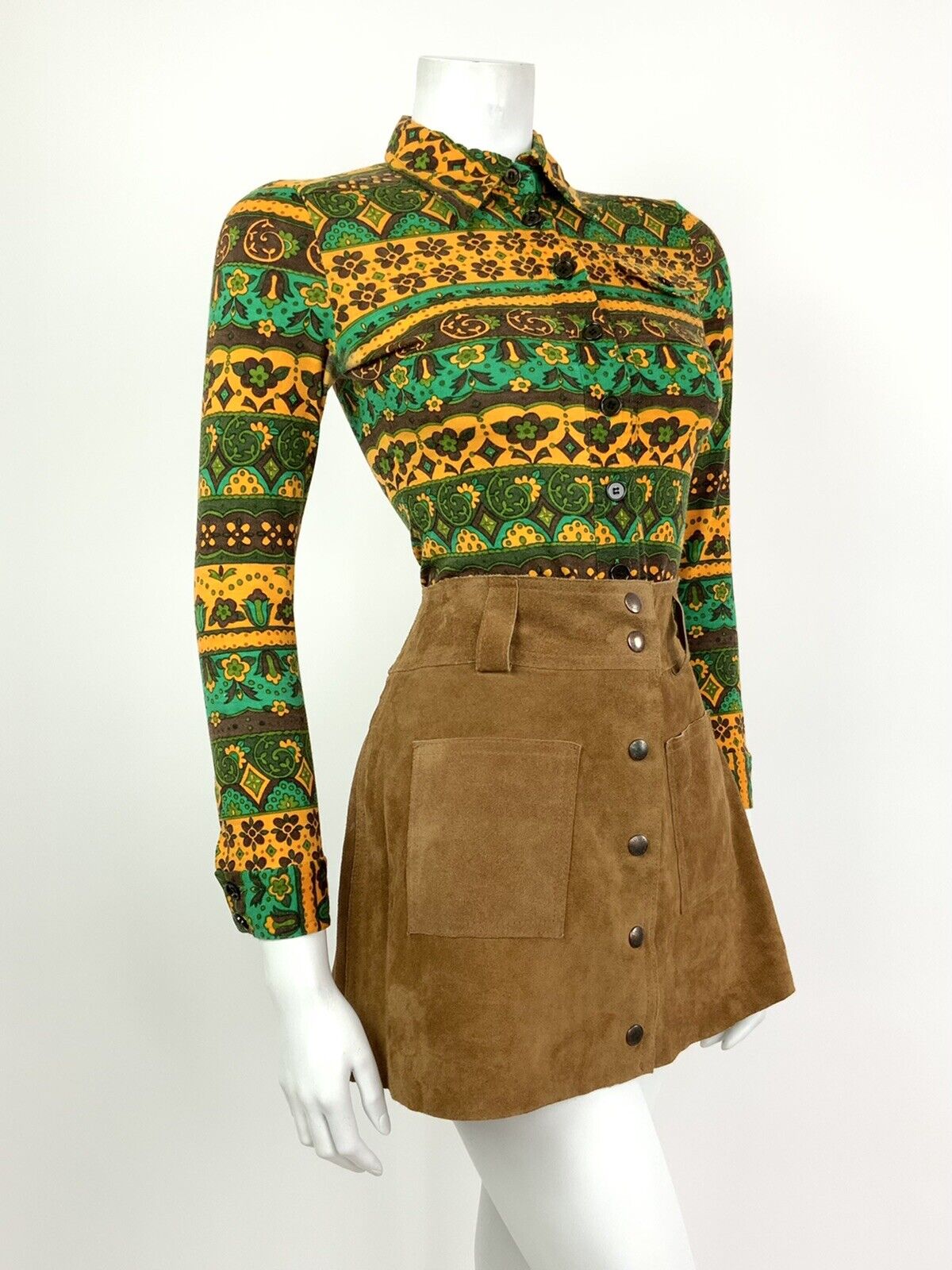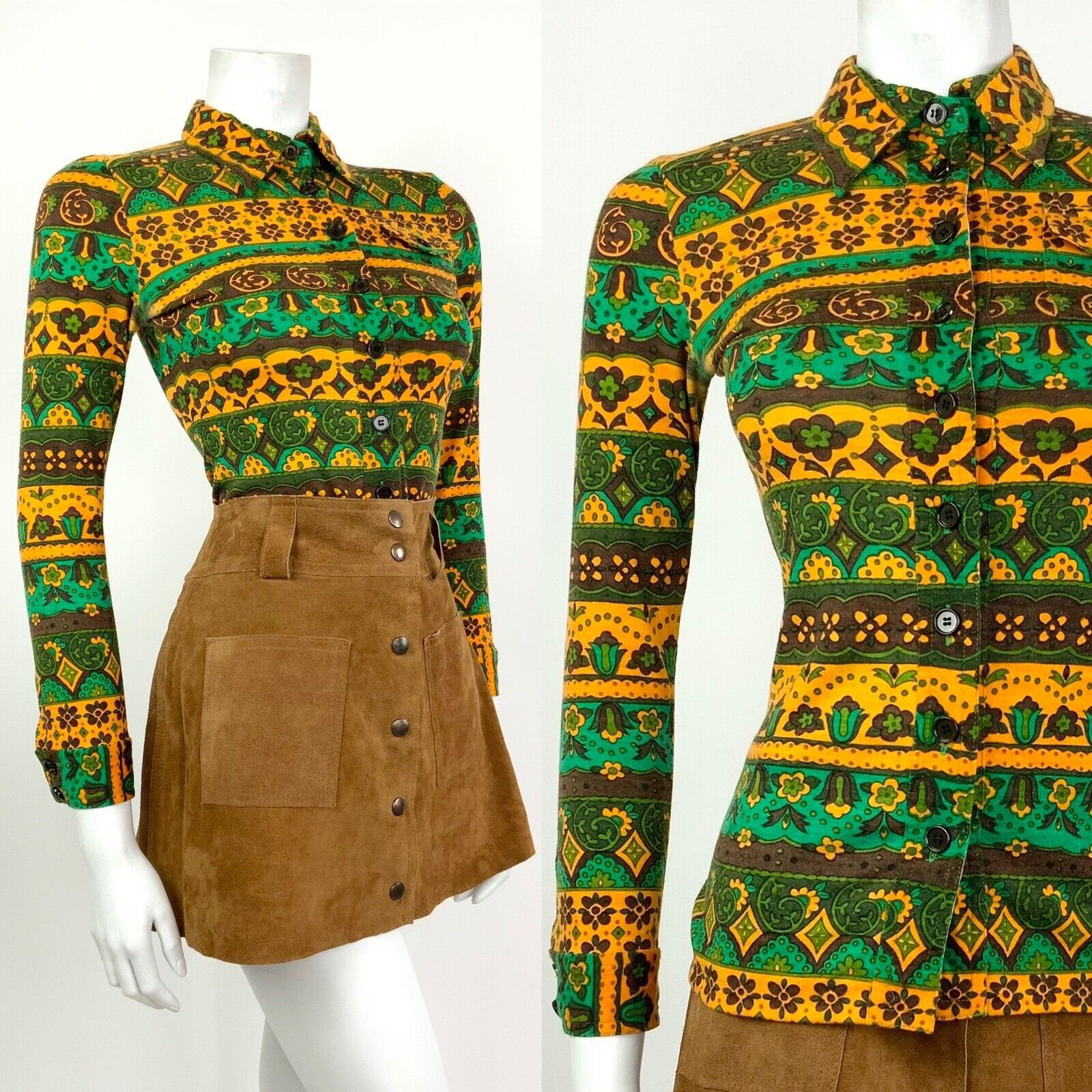VINTAGE 60s 70s YELLOW GREEN BROWN FLORAL STRIPED PSYCHEDELIC DAGGER SHIRT 8