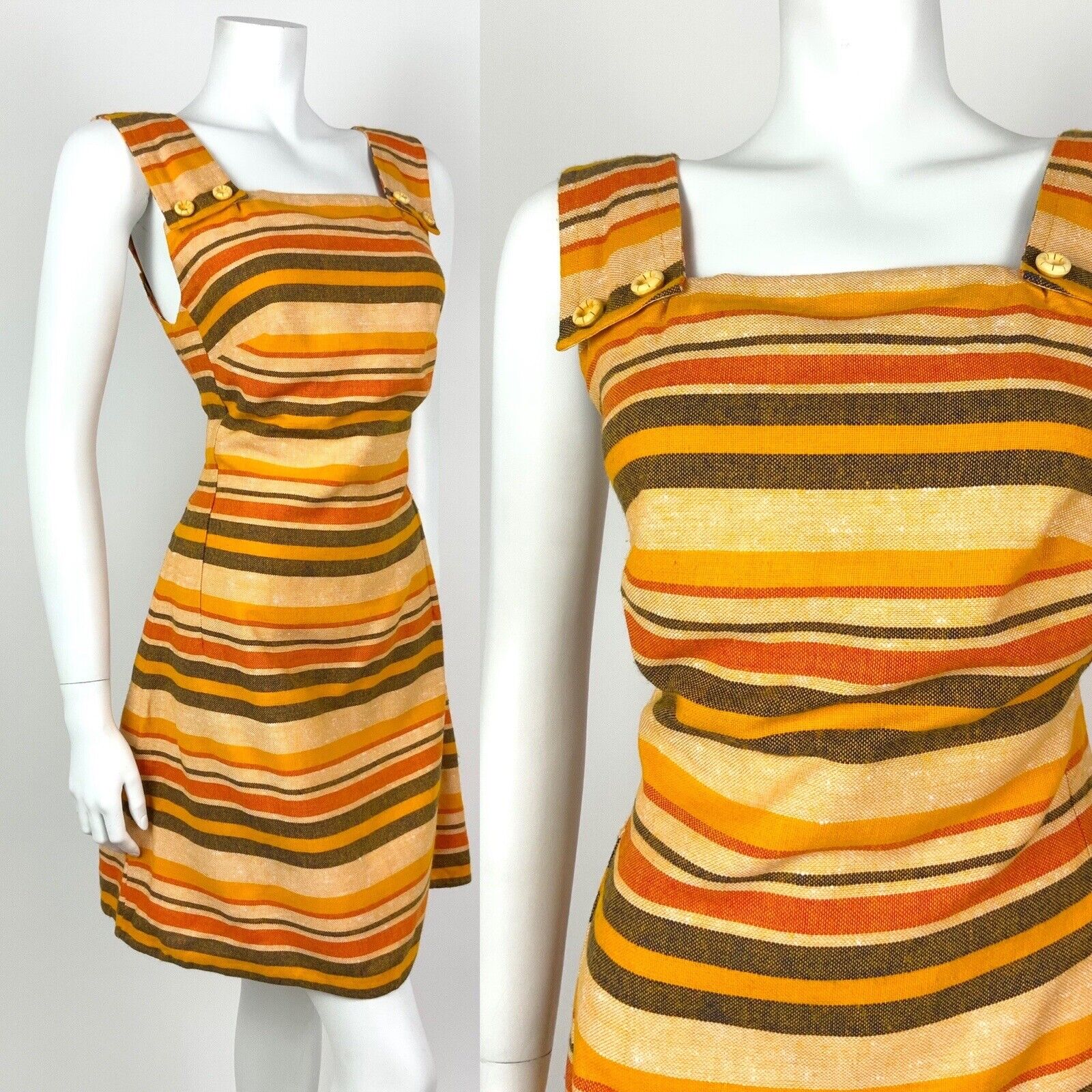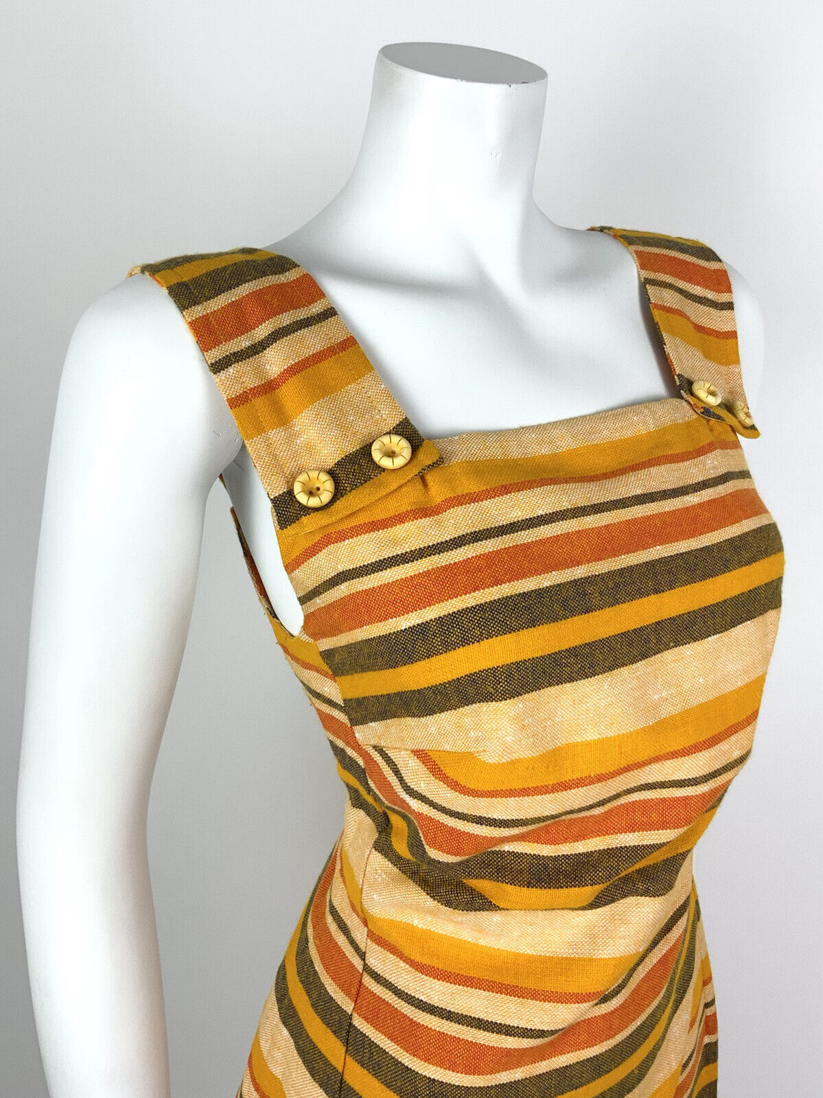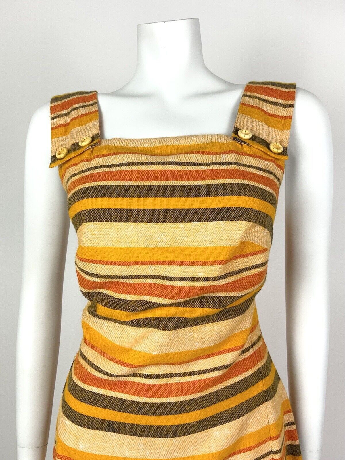 VINTAGE 60s 70s YELLOW ORANGE RED BLACK STRIPED MOD STRAPPY PINNY DRESS 10