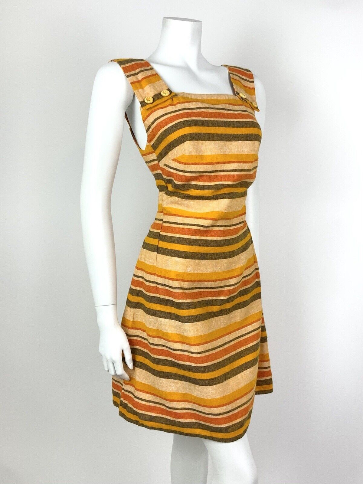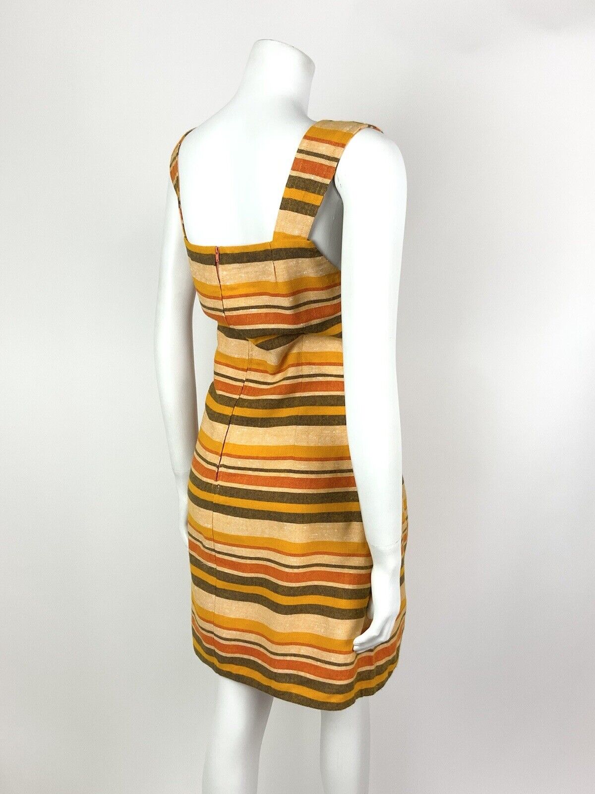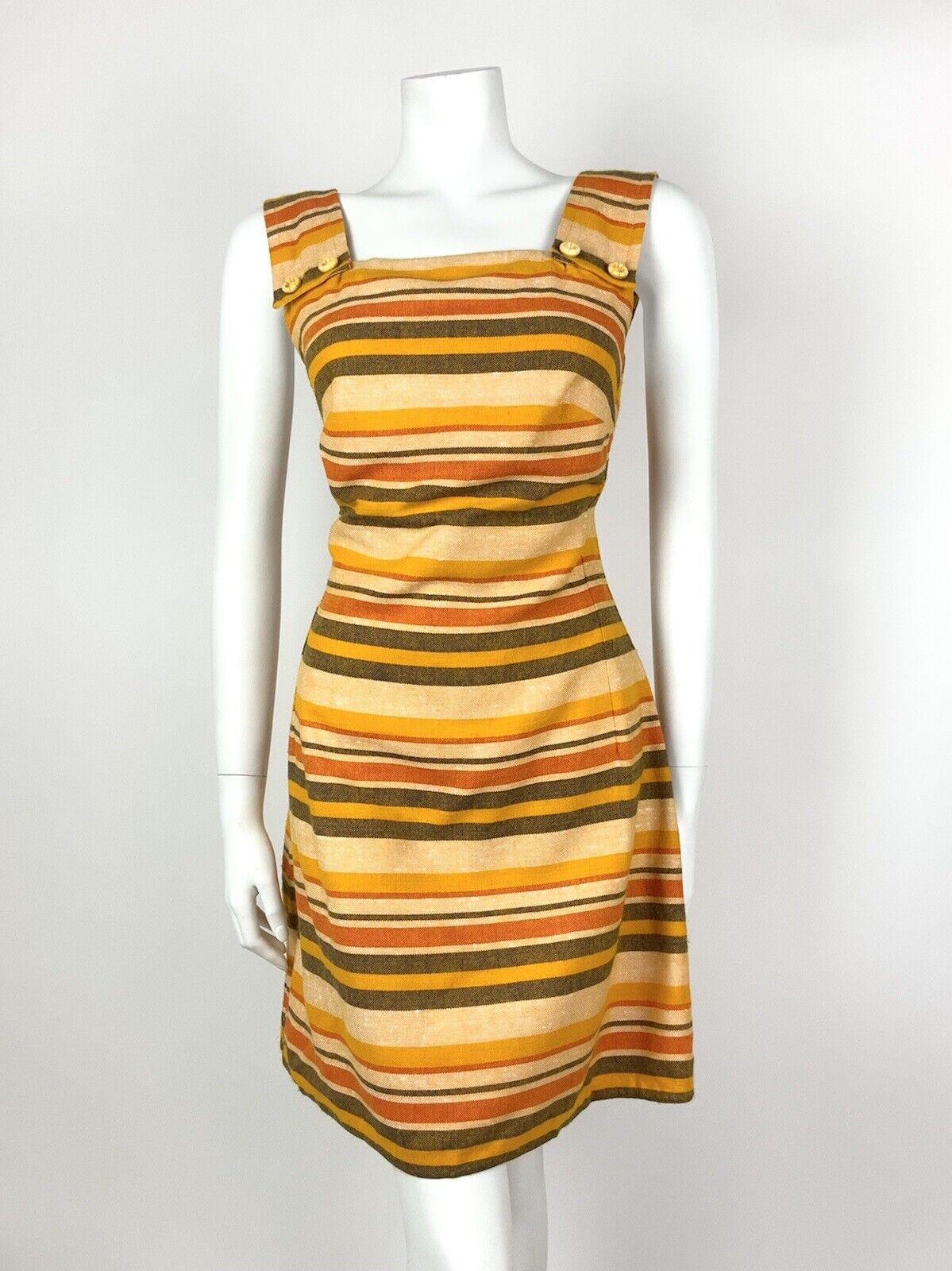 VINTAGE 60s 70s YELLOW ORANGE RED BLACK STRIPED MOD STRAPPY PINNY DRESS 10