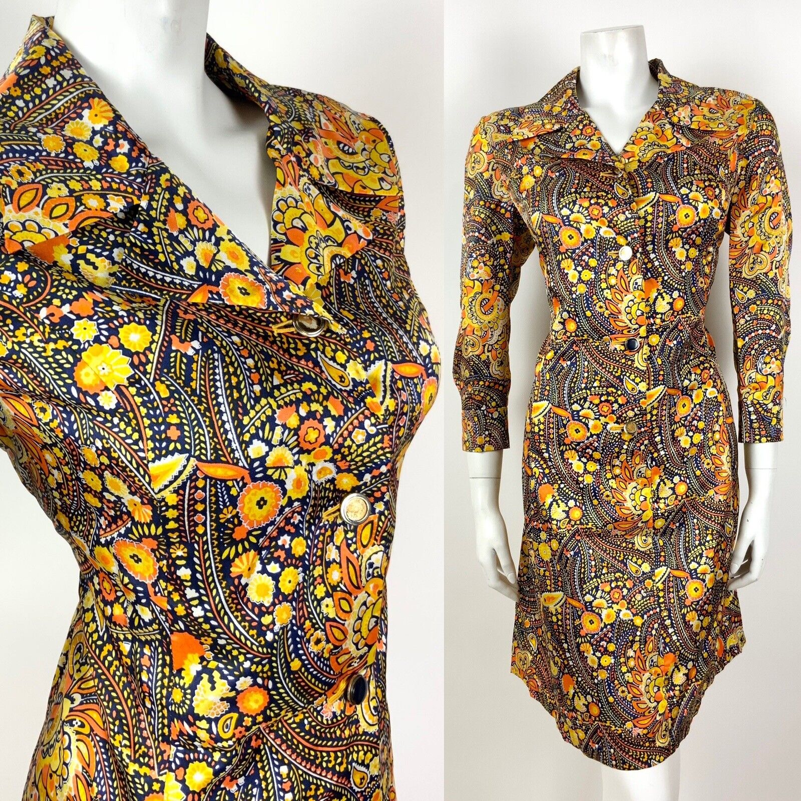 VINTAGE 60s 70s YELLOW ORANGE WHITE BLUE PSYCHEDELIC FLORAL SHIRT DRESS 12 14