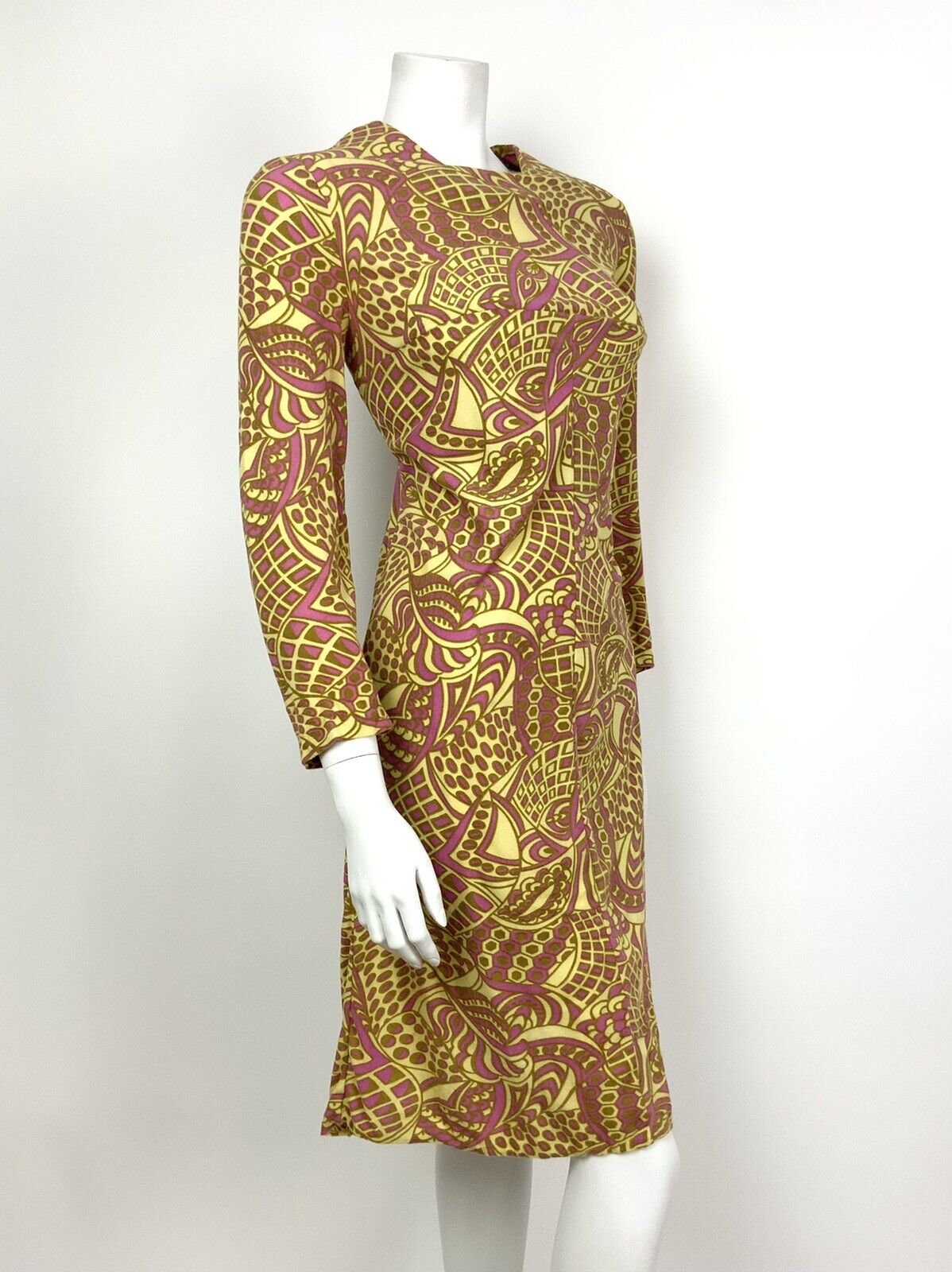VINTAGE 60s 70s YELLOW PINK GOLD PSYCHEDELIC SWIRL EMPIRE LINE DRESS 12 14
