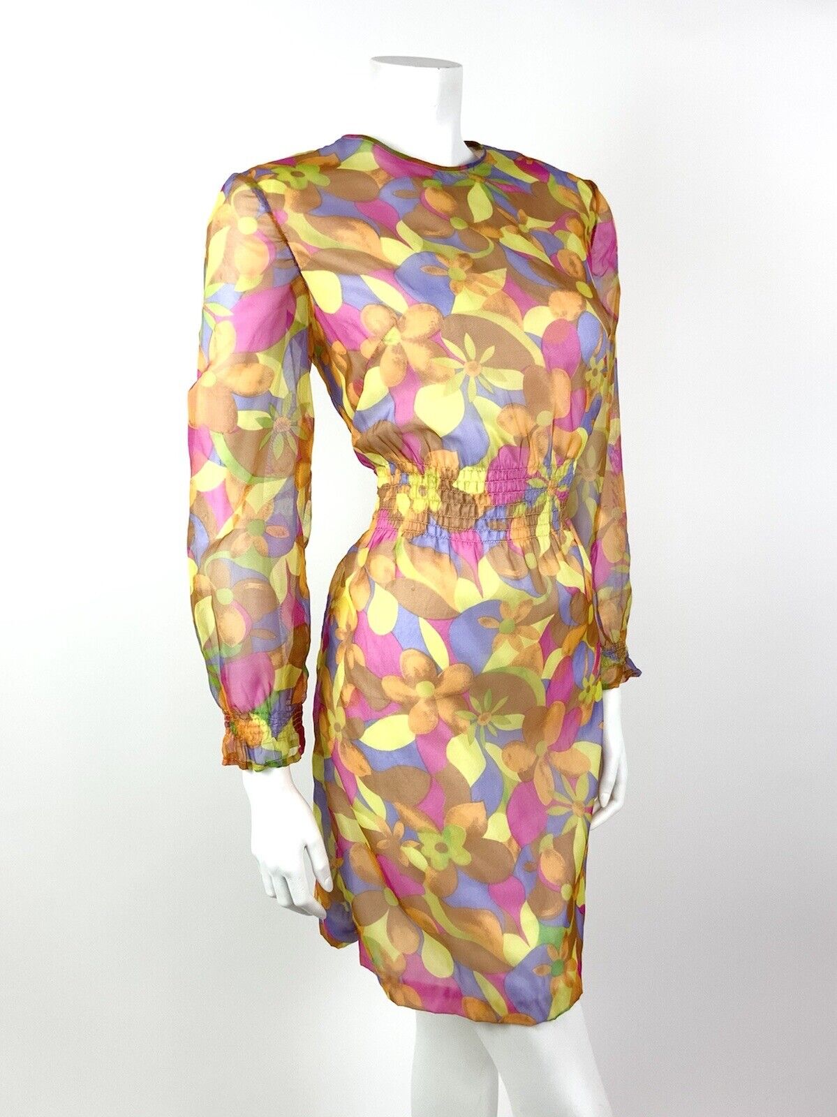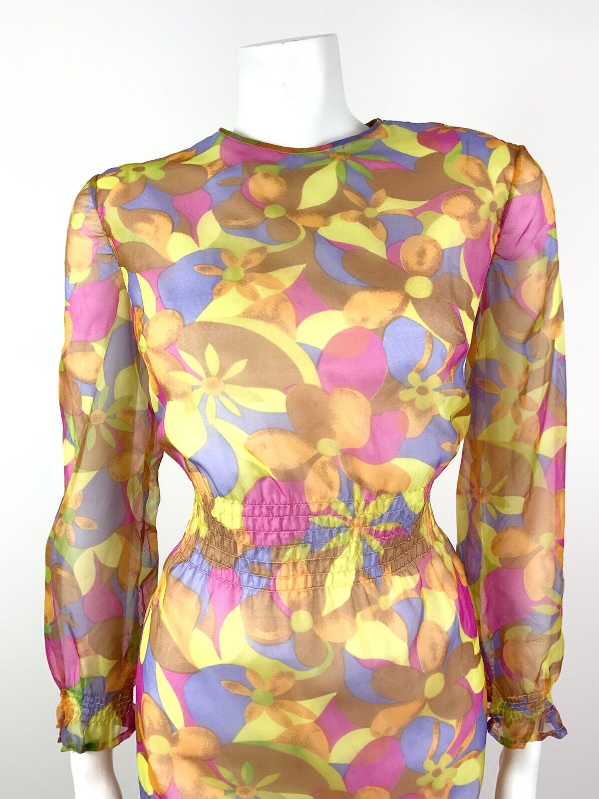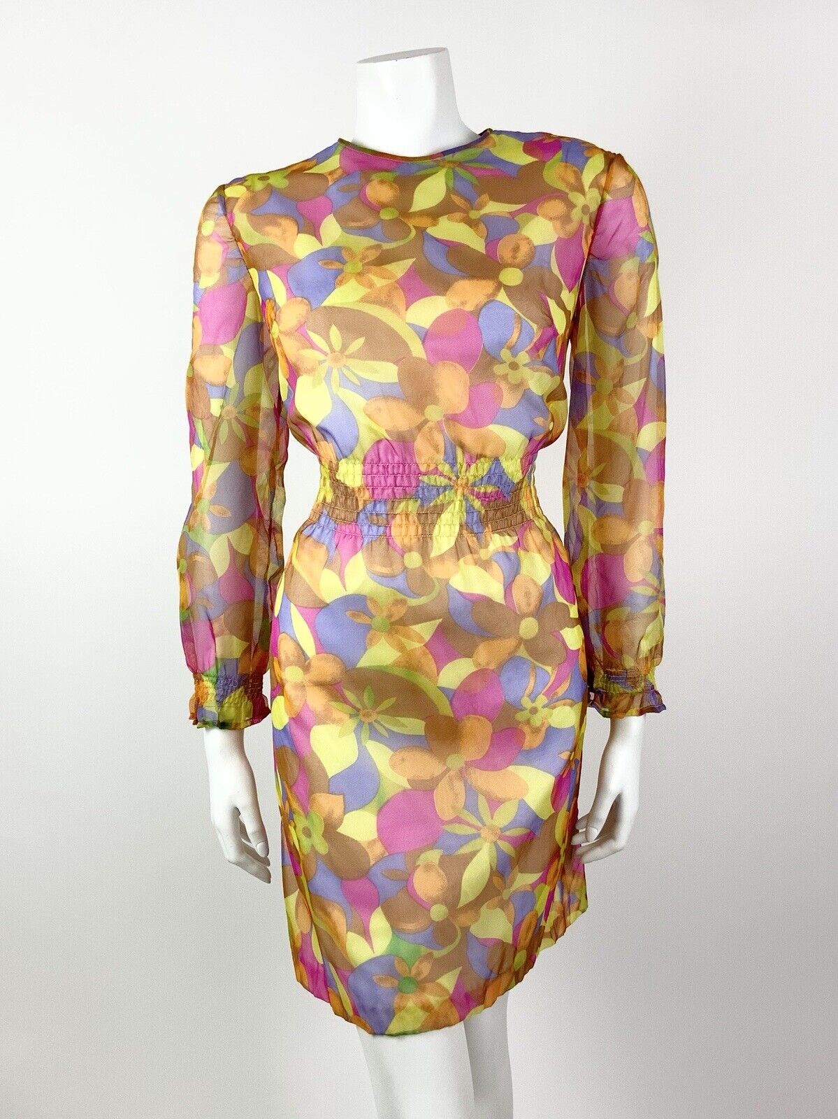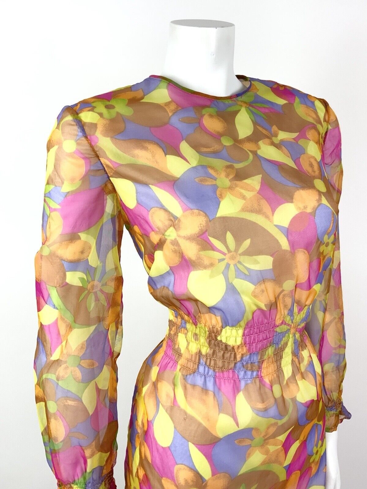 VINTAGE 60s 70s YELLOW PINK PURPLE PSYCHEDELIC FLORAL SHEER MOD DRESS 12 14