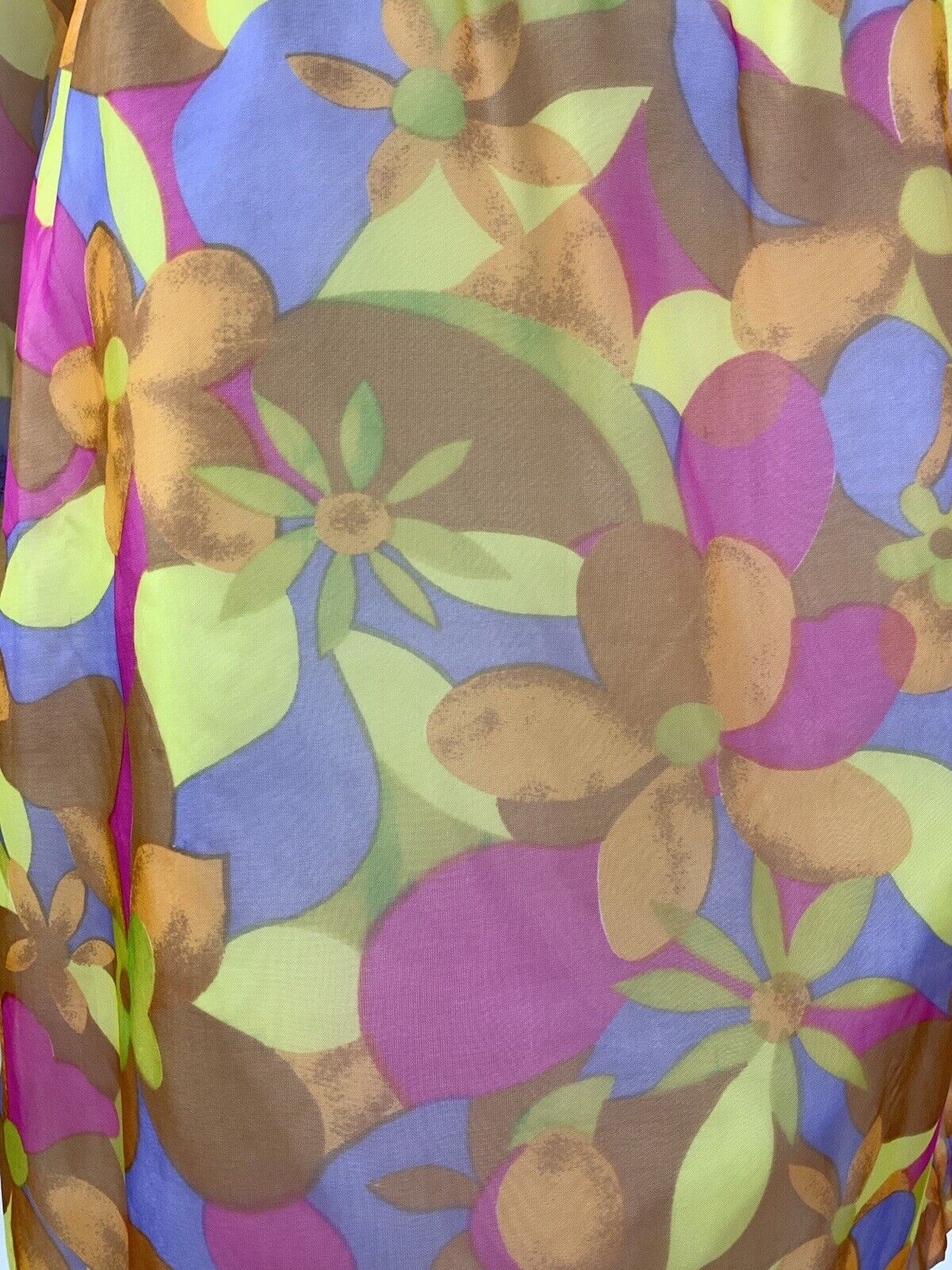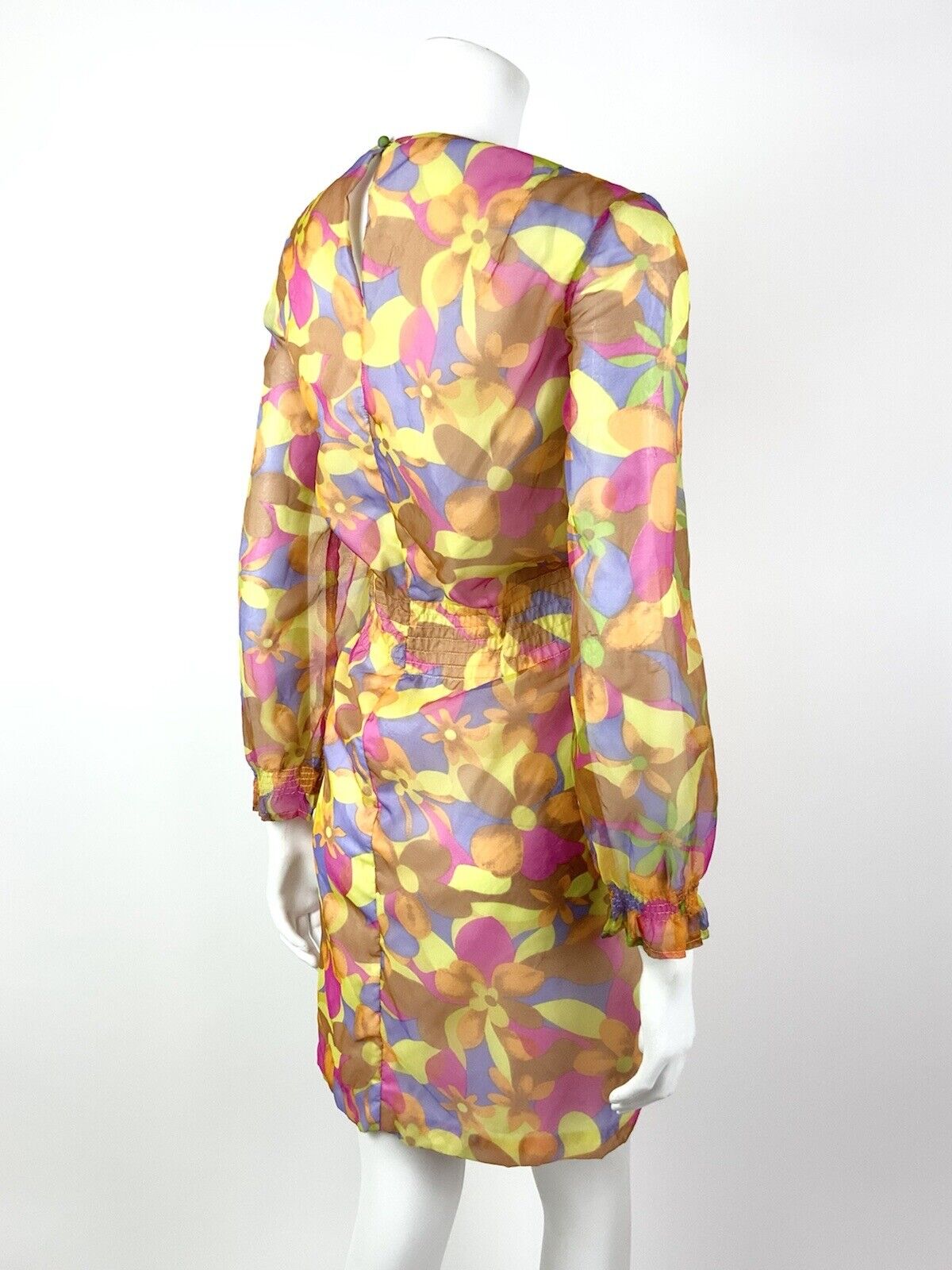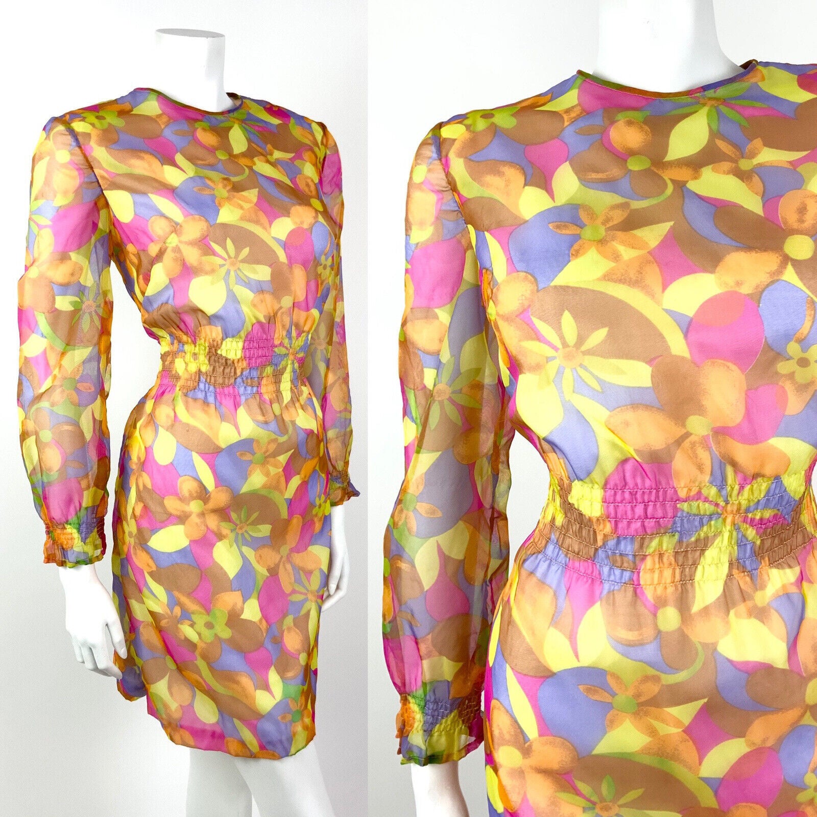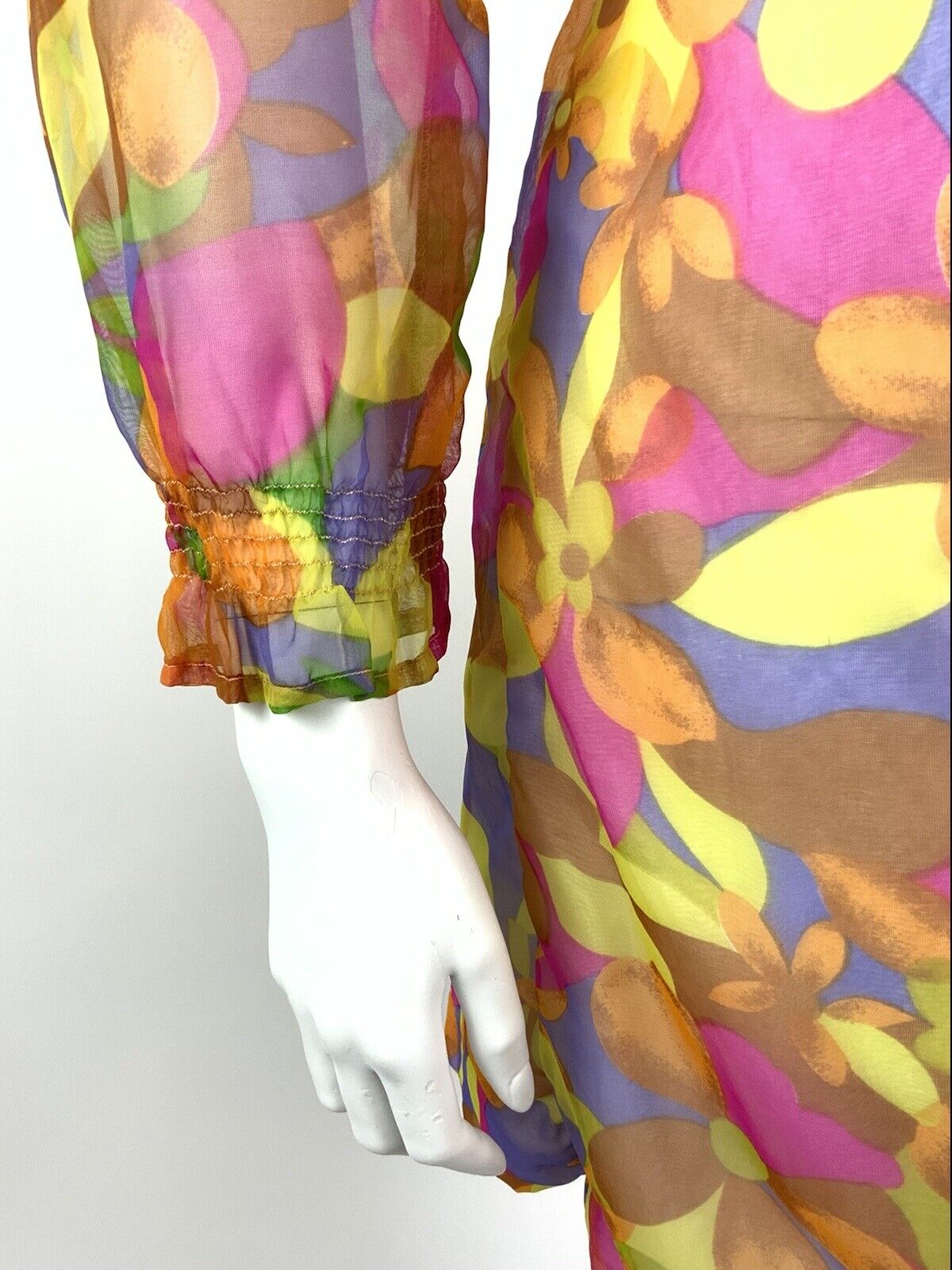 VINTAGE 60s 70s YELLOW PINK PURPLE PSYCHEDELIC FLORAL SHEER MOD DRESS 12 14