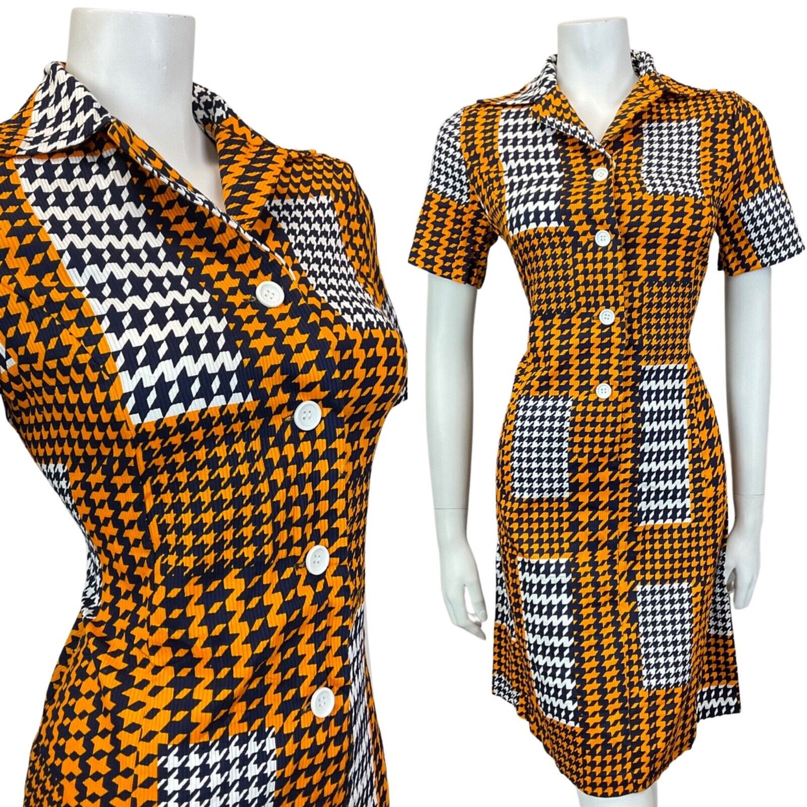 VINTAGE 60s STYLE 90s ORANGE BLUE WHITE GEOMETRIC DOGTOOTH DAGGER SHIRT DRESS 12