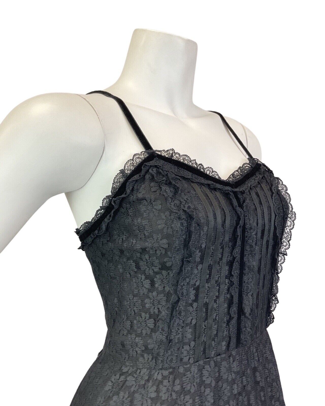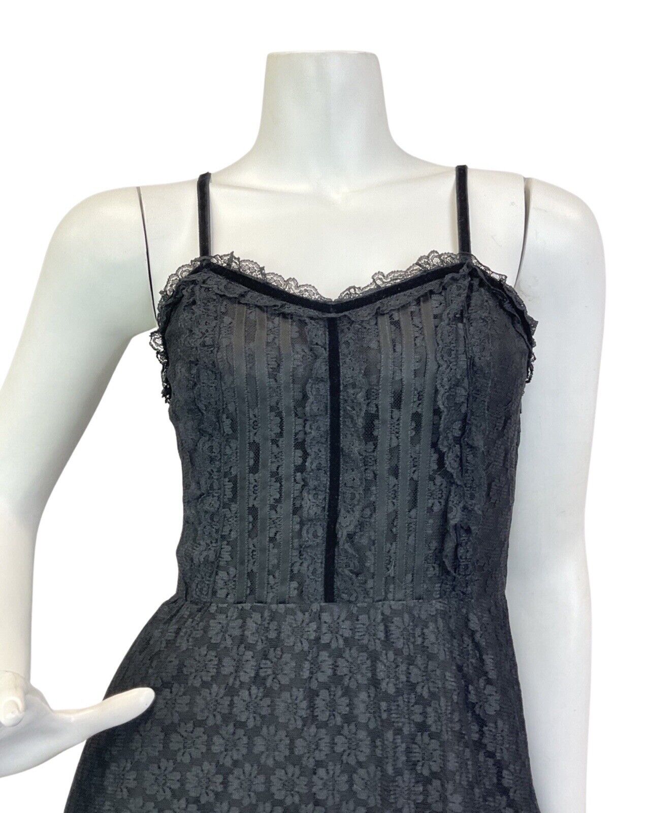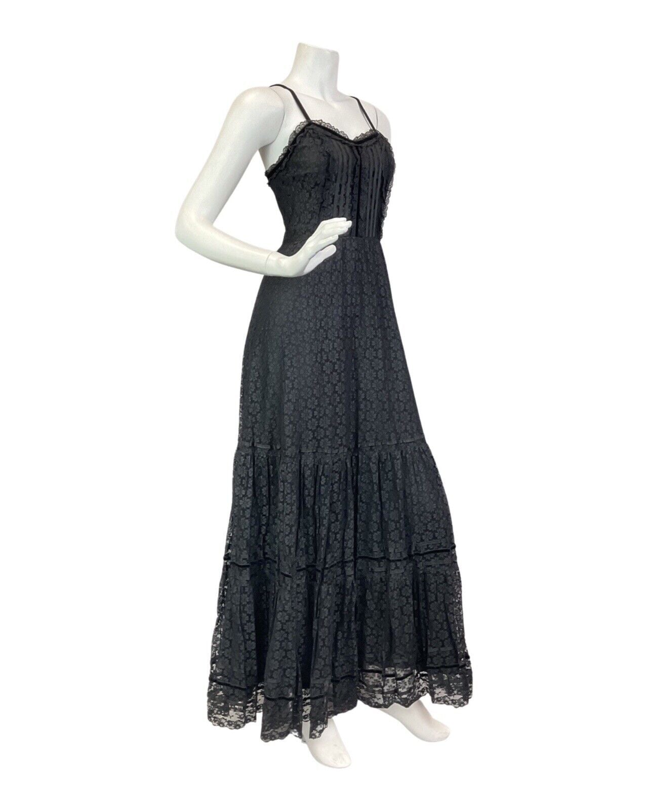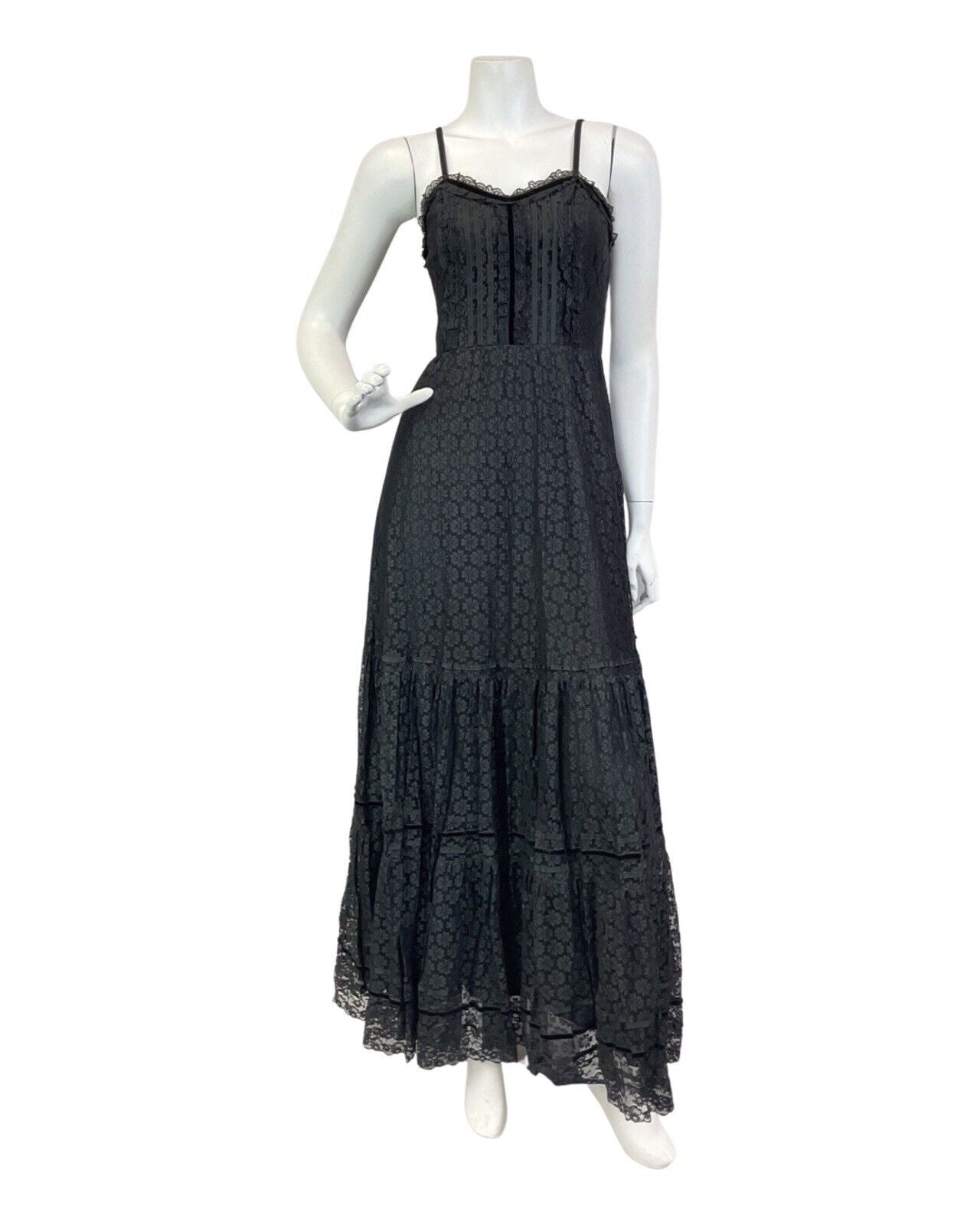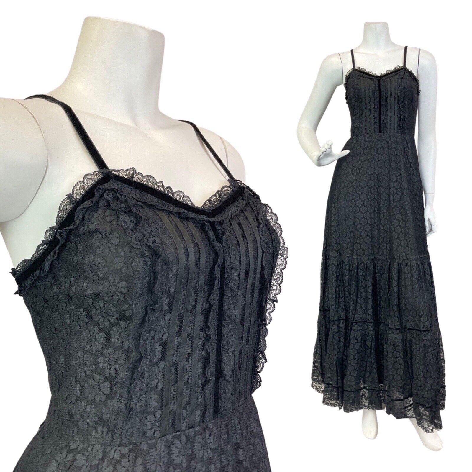 VINTAGE 70s 80s BLACK DAISY FLOWER LACE STRAPPY SUMMER COVEN BOHO MAXI DRESS 6