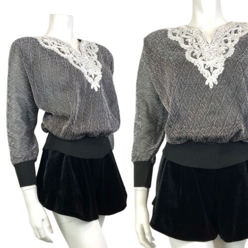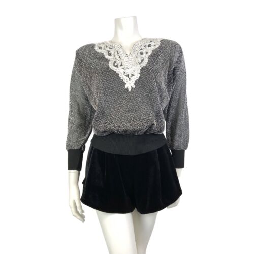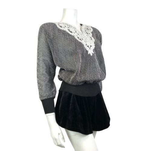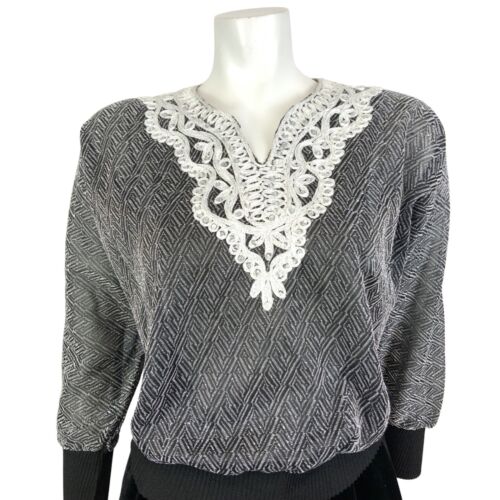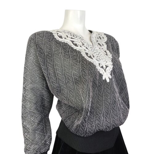 VINTAGE 70s 80s BLACK SILVER GEOMETRIC DISCO PARTY LUREX BATWING KNIT TOP 10 12