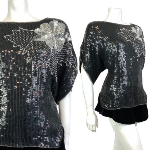 VINTAGE 70s 80s BLACK SILVER WHITE SEQUIN BEADED FLORAL DISCO PARTY TOP 16 18